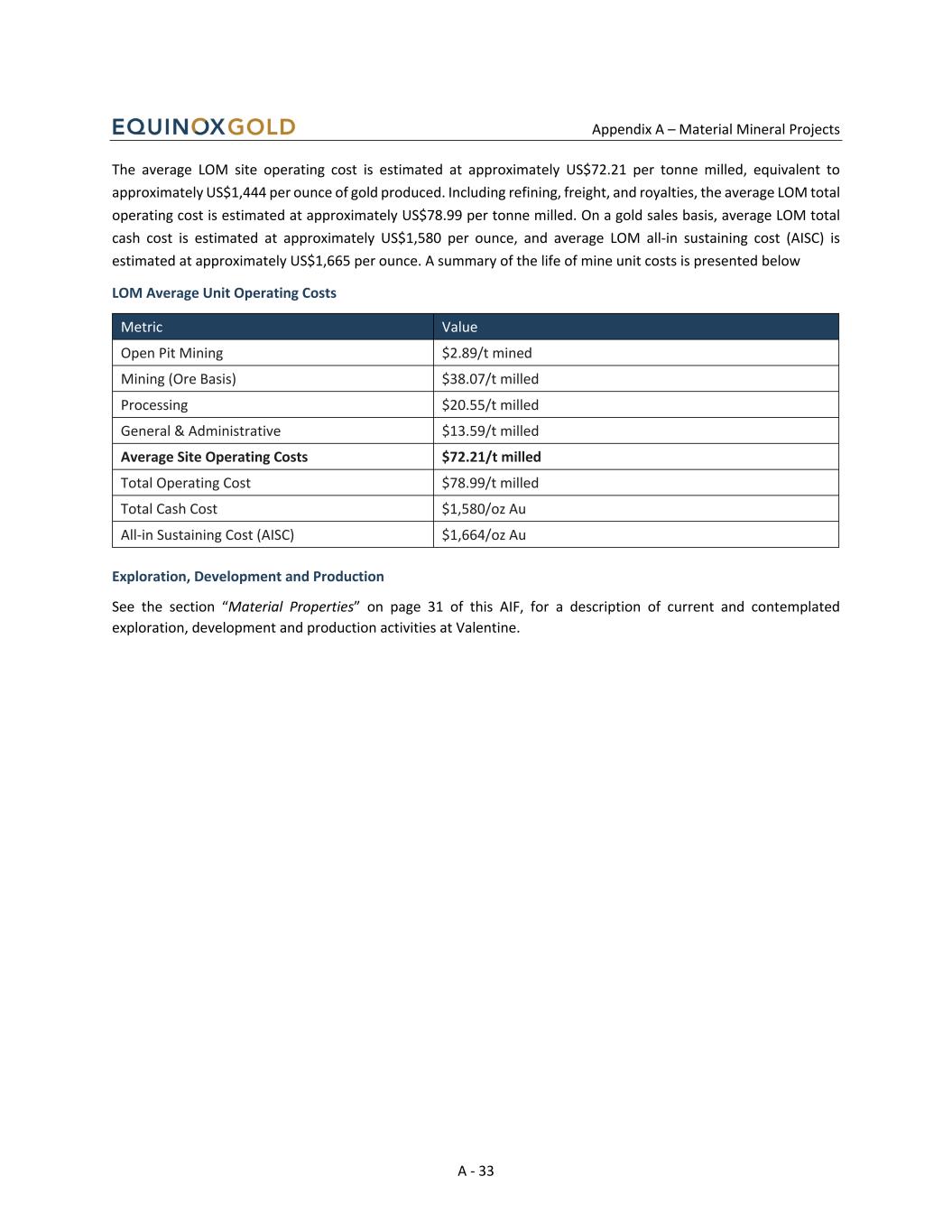 Appendix A – Material Mineral Projects A - 33 The average LOM site operating cost is estimated at approximately US$72.21 per tonne milled, equivalent to approximately US$1,444 per ounce of gold produced. Including refining, freight, and royalties, the average LOM total operating cost is estimated at approximately US$78.99 per tonne milled. On a gold sales basis, average LOM total cash cost is estimated at approximately US$1,580 per ounce, and average LOM all-in sustaining cost (AISC) is estimated at approximately US$1,665 per ounce. A summary of the life of mine unit costs is presented below LOM Average Unit Operating Costs Metric Value Open Pit Mining $2.89/t mined Mining (Ore Basis) $38.07/t milled Processing $20.55/t milled General & Administrative $13.59/t milled Average Site Operating Costs $72.21/t milled Total Operating Cost $78.99/t milled Total Cash Cost $1,580/oz Au All-in Sustaining Cost (AISC) $1,664/oz Au Exploration, Development and Production See the section “Material Properties” on page 31 of this AIF, for a description of current and contemplated exploration, development and production activities at Valentine.
