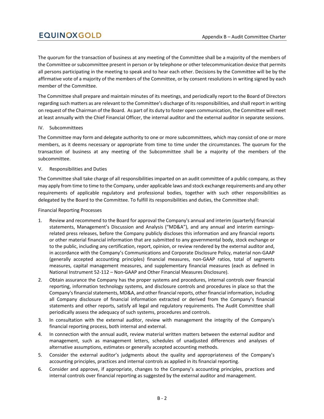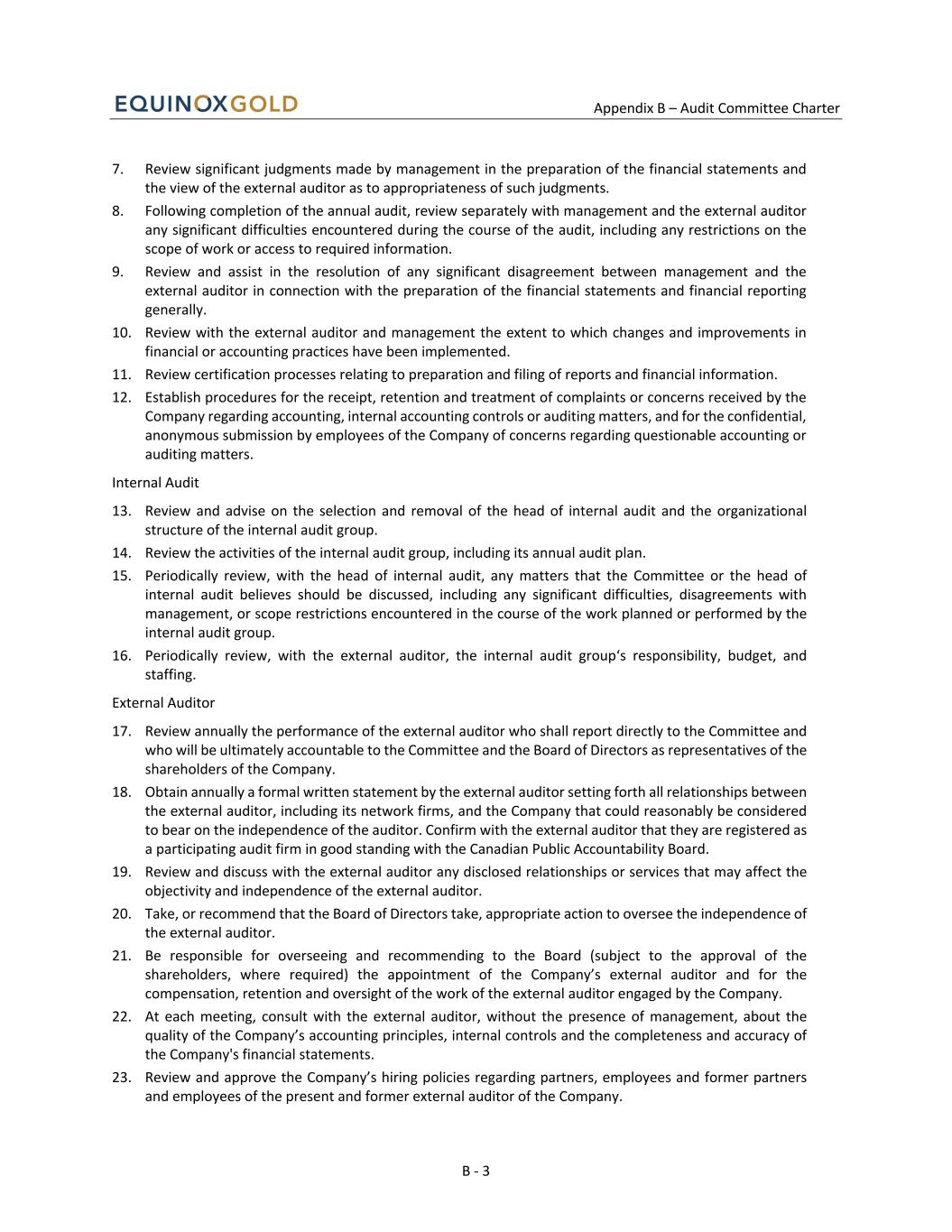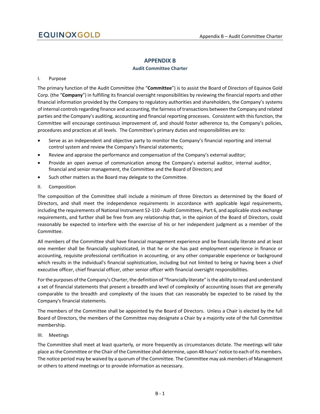 Appendix B – Audit Committee Charter B - 1 APPENDIX B Audit Committee Charter I. Purpose The primary function of the Audit Committee (the “Committee”) is to assist the Board of Directors of Equinox Gold Corp. (the “Company”) in fulfilling its financial oversight responsibilities by reviewing the financial reports and other financial information provided by the Company to regulatory authorities and shareholders, the Company’s systems of internal controls regarding finance and accounting, the fairness of transactions between the Company and related parties and the Company’s auditing, accounting and financial reporting processes. Consistent with this function, the Committee will encourage continuous improvement of, and should foster adherence to, the Company’s policies, procedures and practices at all levels. The Committee’s primary duties and responsibilities are to: • Serve as an independent and objective party to monitor the Company’s financial reporting and internal control system and review the Company’s financial statements; • Review and appraise the performance and compensation of the Company’s external auditor; • Provide an open avenue of communication among the Company’s external auditor, internal auditor, financial and senior management, the Committee and the Board of Directors; and • Such other matters as the Board may delegate to the Committee. II. Composition The composition of the Committee shall include a minimum of three Directors as determined by the Board of Directors, and shall meet the independence requirements in accordance with applicable legal requirements, including the requirements of National Instrument 52-110 - Audit Committees, Part 6, and applicable stock exchange requirements, and further shall be free from any relationship that, in the opinion of the Board of Directors, could reasonably be expected to interfere with the exercise of his or her independent judgment as a member of the Committee. All members of the Committee shall have financial management experience and be financially literate and at least one member shall be financially sophisticated, in that he or she has past employment experience in finance or accounting, requisite professional certification in accounting, or any other comparable experience or background which results in the individual's financial sophistication, including but not limited to being or having been a chief executive officer, chief financial officer, other senior officer with financial oversight responsibilities. For the purposes of the Company's Charter, the definition of "financially literate" is the ability to read and understand a set of financial statements that present a breadth and level of complexity of accounting issues that are generally comparable to the breadth and complexity of the issues that can reasonably be expected to be raised by the Company's financial statements. The members of the Committee shall be appointed by the Board of Directors. Unless a Chair is elected by the full Board of Directors, the members of the Committee may designate a Chair by a majority vote of the full Committee membership. III. Meetings The Committee shall meet at least quarterly, or more frequently as circumstances dictate. The meetings will take place as the Committee or the Chair of the Committee shall determine, upon 48 hours’ notice to each of its members. The notice period may be waived by a quorum of the Committee. The Committee may ask members of Management or others to attend meetings or to provide information as necessary.