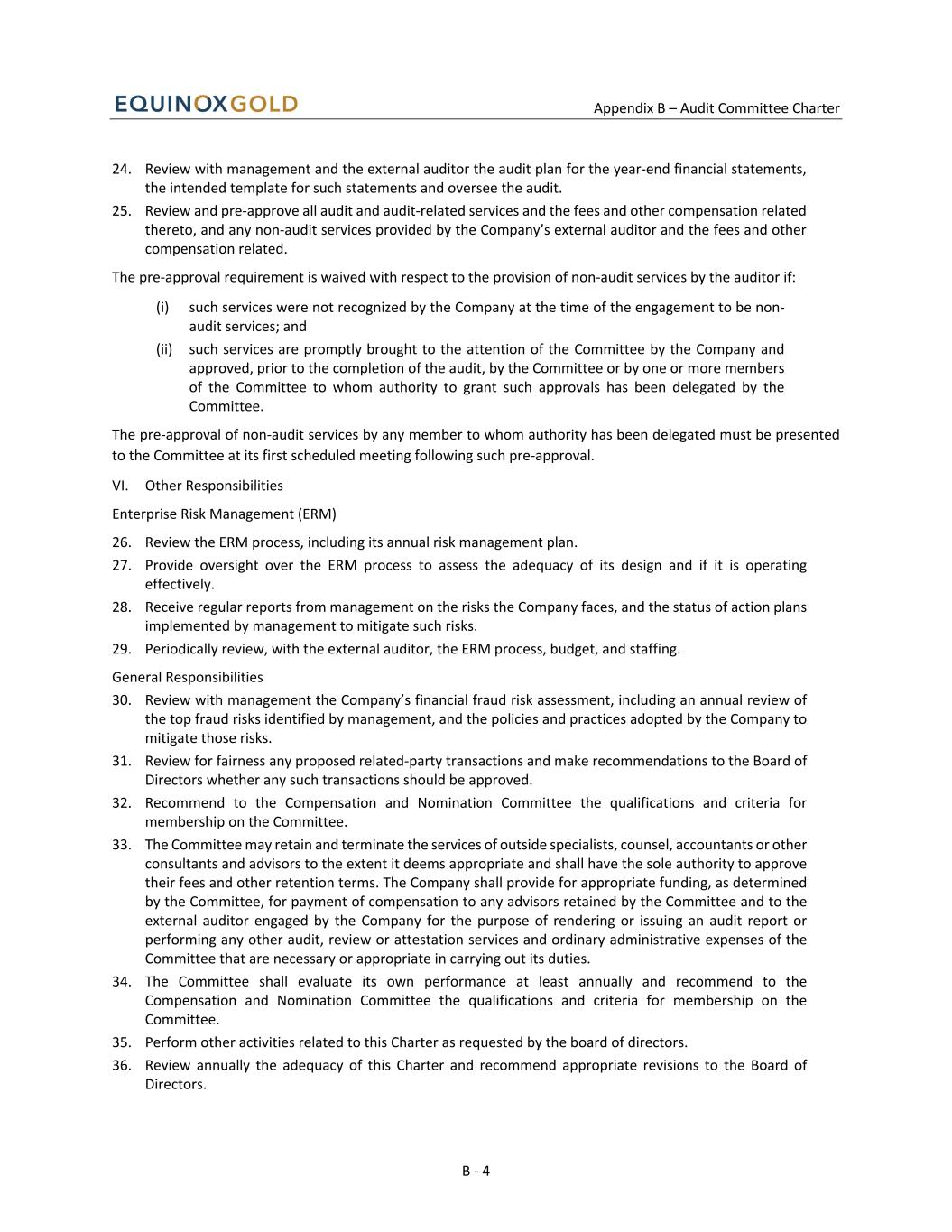 Appendix B – Audit Committee Charter B - 4 24. Review with management and the external auditor the audit plan for the year-end financial statements, the intended template for such statements and oversee the audit. 25. Review and pre-approve all audit and audit-related services and the fees and other compensation related thereto, and any non-audit services provided by the Company’s external auditor and the fees and other compensation related. The pre-approval requirement is waived with respect to the provision of non-audit services by the auditor if: (i) such services were not recognized by the Company at the time of the engagement to be non- audit services; and (ii) such services are promptly brought to the attention of the Committee by the Company and approved, prior to the completion of the audit, by the Committee or by one or more members of the Committee to whom authority to grant such approvals has been delegated by the Committee. The pre-approval of non-audit services by any member to whom authority has been delegated must be presented to the Committee at its first scheduled meeting following such pre-approval. VI. Other Responsibilities Enterprise Risk Management (ERM) 26. Review the ERM process, including its annual risk management plan. 27. Provide oversight over the ERM process to assess the adequacy of its design and if it is operating effectively. 28. Receive regular reports from management on the risks the Company faces, and the status of action plans implemented by management to mitigate such risks. 29. Periodically review, with the external auditor, the ERM process, budget, and staffing. General Responsibilities 30. Review with management the Company’s financial fraud risk assessment, including an annual review of the top fraud risks identified by management, and the policies and practices adopted by the Company to mitigate those risks. 31. Review for fairness any proposed related-party transactions and make recommendations to the Board of Directors whether any such transactions should be approved. 32. Recommend to the Compensation and Nomination Committee the qualifications and criteria for membership on the Committee. 33. The Committee may retain and terminate the services of outside specialists, counsel, accountants or other consultants and advisors to the extent it deems appropriate and shall have the sole authority to approve their fees and other retention terms. The Company shall provide for appropriate funding, as determined by the Committee, for payment of compensation to any advisors retained by the Committee and to the external auditor engaged by the Company for the purpose of rendering or issuing an audit report or performing any other audit, review or attestation services and ordinary administrative expenses of the Committee that are necessary or appropriate in carrying out its duties. 34. The Committee shall evaluate its own performance at least annually and recommend to the Compensation and Nomination Committee the qualifications and criteria for membership on the Committee. 35. Perform other activities related to this Charter as requested by the board of directors. 36. Review annually the adequacy of this Charter and recommend appropriate revisions to the Board of Directors.
