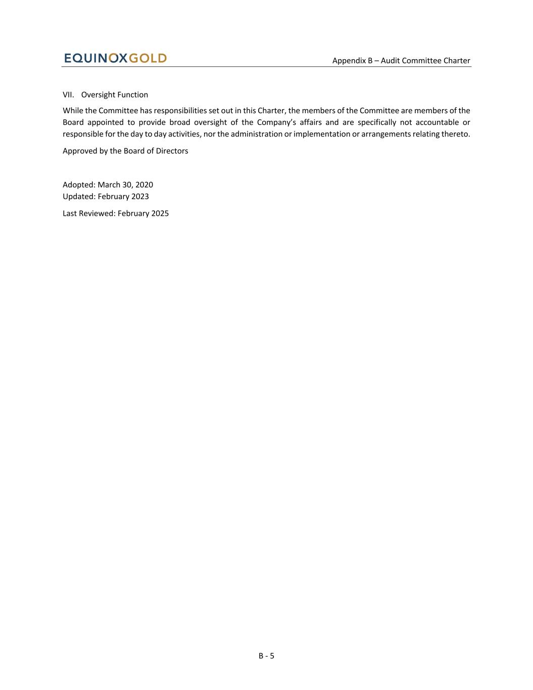Appendix B – Audit Committee Charter B - 5 VII. Oversight Function While the Committee has responsibilities set out in this Charter, the members of the Committee are members of the Board appointed to provide broad oversight of the Company’s affairs and are specifically not accountable or responsible for the day to day activities, nor the administration or implementation or arrangements relating thereto. Approved by the Board of Directors Adopted: March 30, 2020 Updated: February 2023 Last Reviewed: February 2025