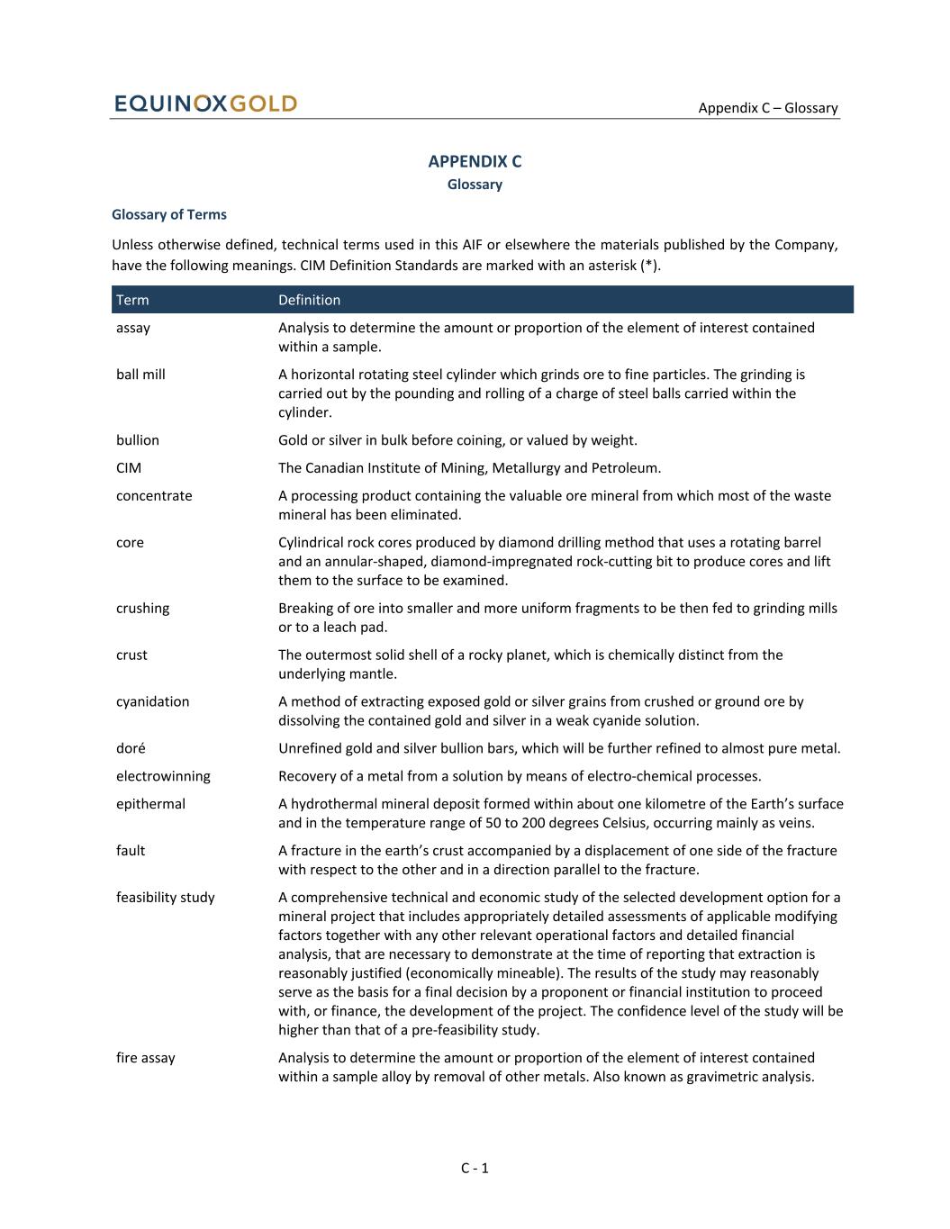 Appendix C – Glossary C - 1 APPENDIX C Glossary Glossary of Terms Unless otherwise defined, technical terms used in this AIF or elsewhere the materials published by the Company, have the following meanings. CIM Definition Standards are marked with an asterisk (*). Term Definition assay Analysis to determine the amount or proportion of the element of interest contained within a sample. ball mill A horizontal rotating steel cylinder which grinds ore to fine particles. The grinding is carried out by the pounding and rolling of a charge of steel balls carried within the cylinder. bullion Gold or silver in bulk before coining, or valued by weight. CIM The Canadian Institute of Mining, Metallurgy and Petroleum. concentrate A processing product containing the valuable ore mineral from which most of the waste mineral has been eliminated. core Cylindrical rock cores produced by diamond drilling method that uses a rotating barrel and an annular-shaped, diamond-impregnated rock-cutting bit to produce cores and lift them to the surface to be examined. crushing Breaking of ore into smaller and more uniform fragments to be then fed to grinding mills or to a leach pad. crust The outermost solid shell of a rocky planet, which is chemically distinct from the underlying mantle. cyanidation A method of extracting exposed gold or silver grains from crushed or ground ore by dissolving the contained gold and silver in a weak cyanide solution. doré Unrefined gold and silver bullion bars, which will be further refined to almost pure metal. electrowinning Recovery of a metal from a solution by means of electro-chemical processes. epithermal A hydrothermal mineral deposit formed within about one kilometre of the Earth’s surface and in the temperature range of 50 to 200 degrees Celsius, occurring mainly as veins. fault A fracture in the earth’s crust accompanied by a displacement of one side of the fracture with respect to the other and in a direction parallel to the fracture. feasibility study A comprehensive technical and economic study of the selected development option for a mineral project that includes appropriately detailed assessments of applicable modifying factors together with any other relevant operational factors and detailed financial analysis, that are necessary to demonstrate at the time of reporting that extraction is reasonably justified (economically mineable). The results of the study may reasonably serve as the basis for a final decision by a proponent or financial institution to proceed with, or finance, the development of the project. The confidence level of the study will be higher than that of a pre-feasibility study. fire assay Analysis to determine the amount or proportion of the element of interest contained within a sample alloy by removal of other metals. Also known as gravimetric analysis.