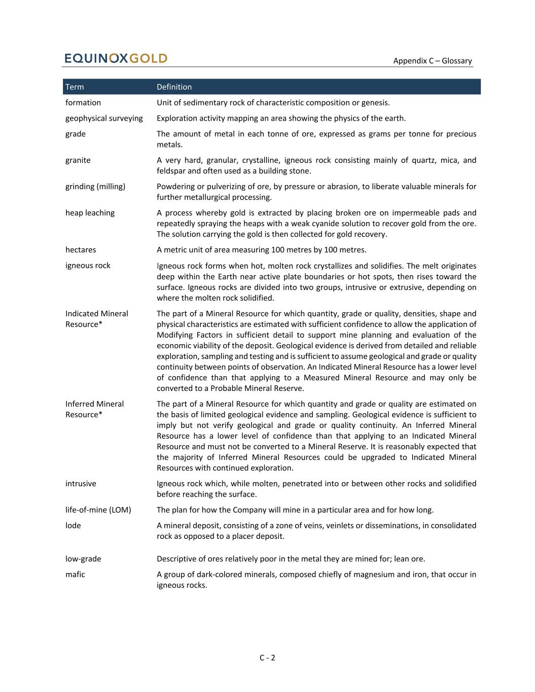Appendix C – Glossary C - 2 Term Definition formation Unit of sedimentary rock of characteristic composition or genesis. geophysical surveying Exploration activity mapping an area showing the physics of the earth. grade The amount of metal in each tonne of ore, expressed as grams per tonne for precious metals. granite A very hard, granular, crystalline, igneous rock consisting mainly of quartz, mica, and feldspar and often used as a building stone. grinding (milling) Powdering or pulverizing of ore, by pressure or abrasion, to liberate valuable minerals for further metallurgical processing. heap leaching A process whereby gold is extracted by placing broken ore on impermeable pads and repeatedly spraying the heaps with a weak cyanide solution to recover gold from the ore. The solution carrying the gold is then collected for gold recovery. hectares A metric unit of area measuring 100 metres by 100 metres. igneous rock Igneous rock forms when hot, molten rock crystallizes and solidifies. The melt originates deep within the Earth near active plate boundaries or hot spots, then rises toward the surface. Igneous rocks are divided into two groups, intrusive or extrusive, depending on where the molten rock solidified. Indicated Mineral Resource* The part of a Mineral Resource for which quantity, grade or quality, densities, shape and physical characteristics are estimated with sufficient confidence to allow the application of Modifying Factors in sufficient detail to support mine planning and evaluation of the economic viability of the deposit. Geological evidence is derived from detailed and reliable exploration, sampling and testing and is sufficient to assume geological and grade or quality continuity between points of observation. An Indicated Mineral Resource has a lower level of confidence than that applying to a Measured Mineral Resource and may only be converted to a Probable Mineral Reserve. Inferred Mineral Resource* The part of a Mineral Resource for which quantity and grade or quality are estimated on the basis of limited geological evidence and sampling. Geological evidence is sufficient to imply but not verify geological and grade or quality continuity. An Inferred Mineral Resource has a lower level of confidence than that applying to an Indicated Mineral Resource and must not be converted to a Mineral Reserve. It is reasonably expected that the majority of Inferred Mineral Resources could be upgraded to Indicated Mineral Resources with continued exploration. intrusive Igneous rock which, while molten, penetrated into or between other rocks and solidified before reaching the surface. life-of-mine (LOM) The plan for how the Company will mine in a particular area and for how long. lode A mineral deposit, consisting of a zone of veins, veinlets or disseminations, in consolidated rock as opposed to a placer deposit. low-grade Descriptive of ores relatively poor in the metal they are mined for; lean ore. mafic A group of dark-colored minerals, composed chiefly of magnesium and iron, that occur in igneous rocks.