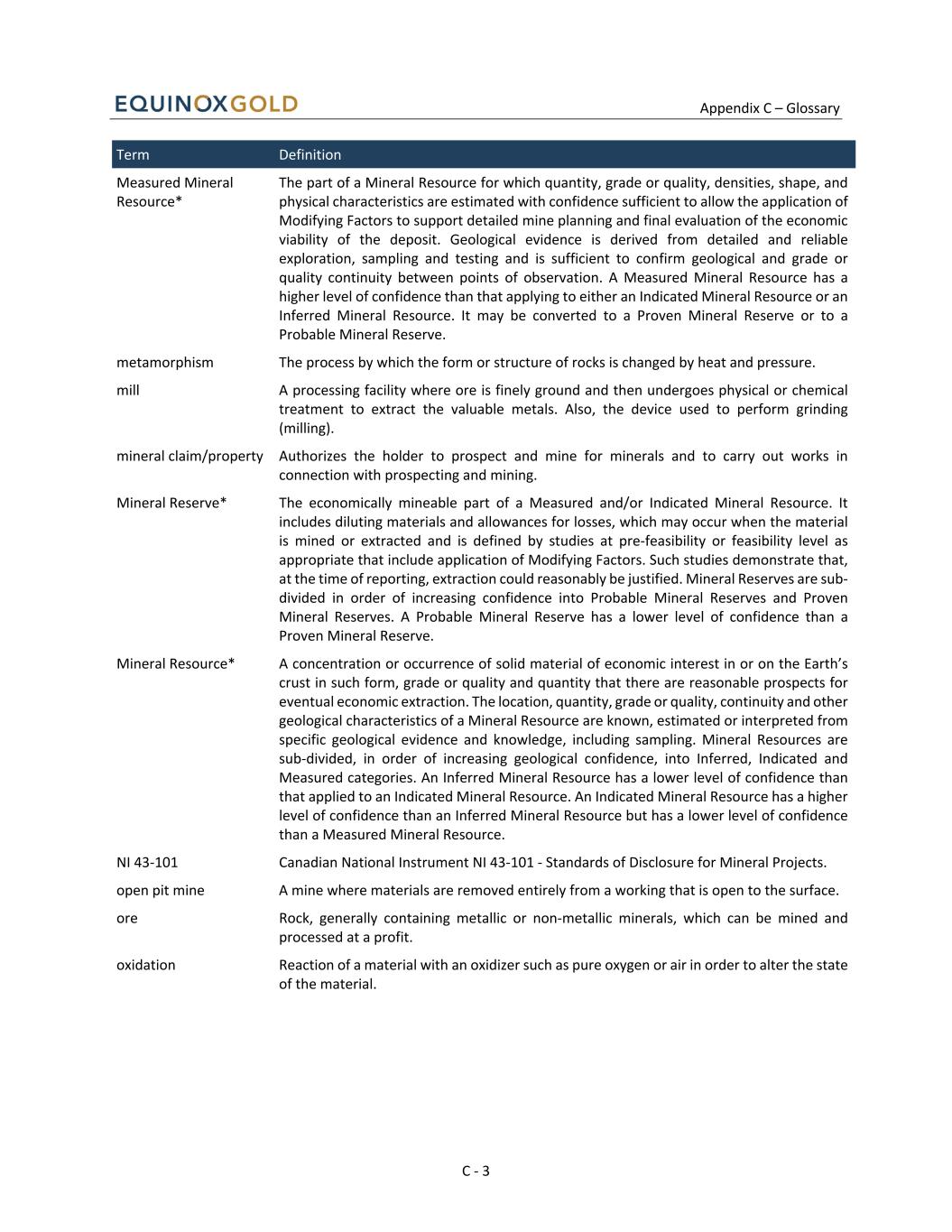 Appendix C – Glossary C - 3 Term Definition Measured Mineral Resource* The part of a Mineral Resource for which quantity, grade or quality, densities, shape, and physical characteristics are estimated with confidence sufficient to allow the application of Modifying Factors to support detailed mine planning and final evaluation of the economic viability of the deposit. Geological evidence is derived from detailed and reliable exploration, sampling and testing and is sufficient to confirm geological and grade or quality continuity between points of observation. A Measured Mineral Resource has a higher level of confidence than that applying to either an Indicated Mineral Resource or an Inferred Mineral Resource. It may be converted to a Proven Mineral Reserve or to a Probable Mineral Reserve. metamorphism The process by which the form or structure of rocks is changed by heat and pressure. mill A processing facility where ore is finely ground and then undergoes physical or chemical treatment to extract the valuable metals. Also, the device used to perform grinding (milling). mineral claim/property Authorizes the holder to prospect and mine for minerals and to carry out works in connection with prospecting and mining. Mineral Reserve* The economically mineable part of a Measured and/or Indicated Mineral Resource. It includes diluting materials and allowances for losses, which may occur when the material is mined or extracted and is defined by studies at pre-feasibility or feasibility level as appropriate that include application of Modifying Factors. Such studies demonstrate that, at the time of reporting, extraction could reasonably be justified. Mineral Reserves are sub- divided in order of increasing confidence into Probable Mineral Reserves and Proven Mineral Reserves. A Probable Mineral Reserve has a lower level of confidence than a Proven Mineral Reserve. Mineral Resource* A concentration or occurrence of solid material of economic interest in or on the Earth’s crust in such form, grade or quality and quantity that there are reasonable prospects for eventual economic extraction. The location, quantity, grade or quality, continuity and other geological characteristics of a Mineral Resource are known, estimated or interpreted from specific geological evidence and knowledge, including sampling. Mineral Resources are sub-divided, in order of increasing geological confidence, into Inferred, Indicated and Measured categories. An Inferred Mineral Resource has a lower level of confidence than that applied to an Indicated Mineral Resource. An Indicated Mineral Resource has a higher level of confidence than an Inferred Mineral Resource but has a lower level of confidence than a Measured Mineral Resource. NI 43-101 Canadian National Instrument NI 43-101 - Standards of Disclosure for Mineral Projects. open pit mine A mine where materials are removed entirely from a working that is open to the surface. ore Rock, generally containing metallic or non-metallic minerals, which can be mined and processed at a profit. oxidation Reaction of a material with an oxidizer such as pure oxygen or air in order to alter the state of the material.