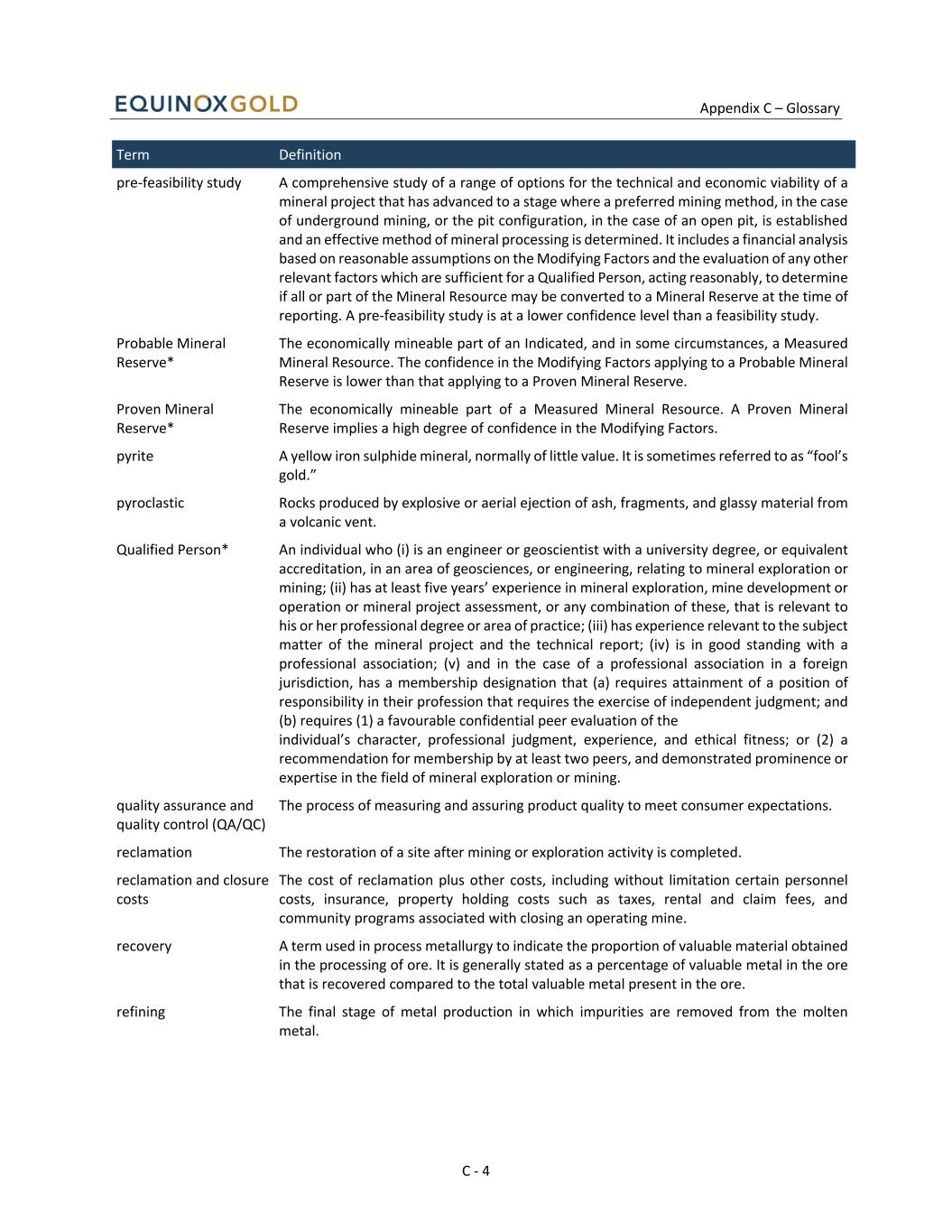 Appendix C – Glossary C - 4 Term Definition pre-feasibility study A comprehensive study of a range of options for the technical and economic viability of a mineral project that has advanced to a stage where a preferred mining method, in the case of underground mining, or the pit configuration, in the case of an open pit, is established and an effective method of mineral processing is determined. It includes a financial analysis based on reasonable assumptions on the Modifying Factors and the evaluation of any other relevant factors which are sufficient for a Qualified Person, acting reasonably, to determine if all or part of the Mineral Resource may be converted to a Mineral Reserve at the time of reporting. A pre-feasibility study is at a lower confidence level than a feasibility study. Probable Mineral Reserve* The economically mineable part of an Indicated, and in some circumstances, a Measured Mineral Resource. The confidence in the Modifying Factors applying to a Probable Mineral Reserve is lower than that applying to a Proven Mineral Reserve. Proven Mineral Reserve* The economically mineable part of a Measured Mineral Resource. A Proven Mineral Reserve implies a high degree of confidence in the Modifying Factors. pyrite A yellow iron sulphide mineral, normally of little value. It is sometimes referred to as “fool’s gold.” pyroclastic Rocks produced by explosive or aerial ejection of ash, fragments, and glassy material from a volcanic vent. Qualified Person* An individual who (i) is an engineer or geoscientist with a university degree, or equivalent accreditation, in an area of geosciences, or engineering, relating to mineral exploration or mining; (ii) has at least five years’ experience in mineral exploration, mine development or operation or mineral project assessment, or any combination of these, that is relevant to his or her professional degree or area of practice; (iii) has experience relevant to the subject matter of the mineral project and the technical report; (iv) is in good standing with a professional association; (v) and in the case of a professional association in a foreign jurisdiction, has a membership designation that (a) requires attainment of a position of responsibility in their profession that requires the exercise of independent judgment; and (b) requires (1) a favourable confidential peer evaluation of the individual’s character, professional judgment, experience, and ethical fitness; or (2) a recommendation for membership by at least two peers, and demonstrated prominence or expertise in the field of mineral exploration or mining. quality assurance and quality control (QA/QC) The process of measuring and assuring product quality to meet consumer expectations. reclamation The restoration of a site after mining or exploration activity is completed. reclamation and closure costs The cost of reclamation plus other costs, including without limitation certain personnel costs, insurance, property holding costs such as taxes, rental and claim fees, and community programs associated with closing an operating mine. recovery A term used in process metallurgy to indicate the proportion of valuable material obtained in the processing of ore. It is generally stated as a percentage of valuable metal in the ore that is recovered compared to the total valuable metal present in the ore. refining The final stage of metal production in which impurities are removed from the molten metal.
