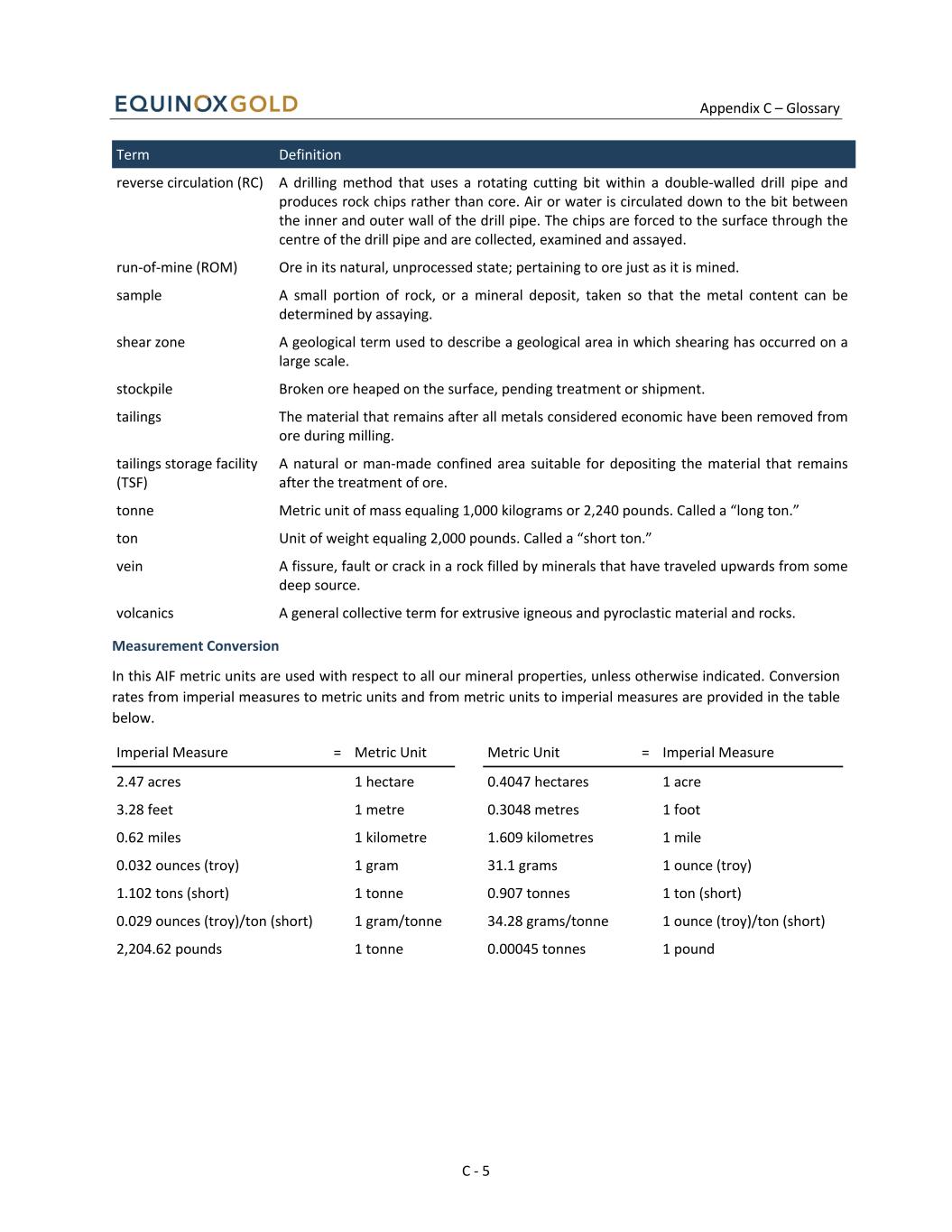 Appendix C – Glossary C - 5 Term Definition reverse circulation (RC) A drilling method that uses a rotating cutting bit within a double-walled drill pipe and produces rock chips rather than core. Air or water is circulated down to the bit between the inner and outer wall of the drill pipe. The chips are forced to the surface through the centre of the drill pipe and are collected, examined and assayed. run-of-mine (ROM) Ore in its natural, unprocessed state; pertaining to ore just as it is mined. sample A small portion of rock, or a mineral deposit, taken so that the metal content can be determined by assaying. shear zone A geological term used to describe a geological area in which shearing has occurred on a large scale. stockpile Broken ore heaped on the surface, pending treatment or shipment. tailings The material that remains after all metals considered economic have been removed from ore during milling. tailings storage facility (TSF) A natural or man-made confined area suitable for depositing the material that remains after the treatment of ore. tonne Metric unit of mass equaling 1,000 kilograms or 2,240 pounds. Called a “long ton.” ton Unit of weight equaling 2,000 pounds. Called a “short ton.” vein A fissure, fault or crack in a rock filled by minerals that have traveled upwards from some deep source. volcanics A general collective term for extrusive igneous and pyroclastic material and rocks. Measurement Conversion In this AIF metric units are used with respect to all our mineral properties, unless otherwise indicated. Conversion rates from imperial measures to metric units and from metric units to imperial measures are provided in the table below. Imperial Measure = Metric Unit Metric Unit = Imperial Measure 2.47 acres 1 hectare 0.4047 hectares 1 acre 3.28 feet 1 metre 0.3048 metres 1 foot 0.62 miles 1 kilometre 1.609 kilometres 1 mile 0.032 ounces (troy) 1 gram 31.1 grams 1 ounce (troy) 1.102 tons (short) 1 tonne 0.907 tonnes 1 ton (short) 0.029 ounces (troy)/ton (short) 1 gram/tonne 34.28 grams/tonne 1 ounce (troy)/ton (short) 2,204.62 pounds 1 tonne 0.00045 tonnes 1 pound