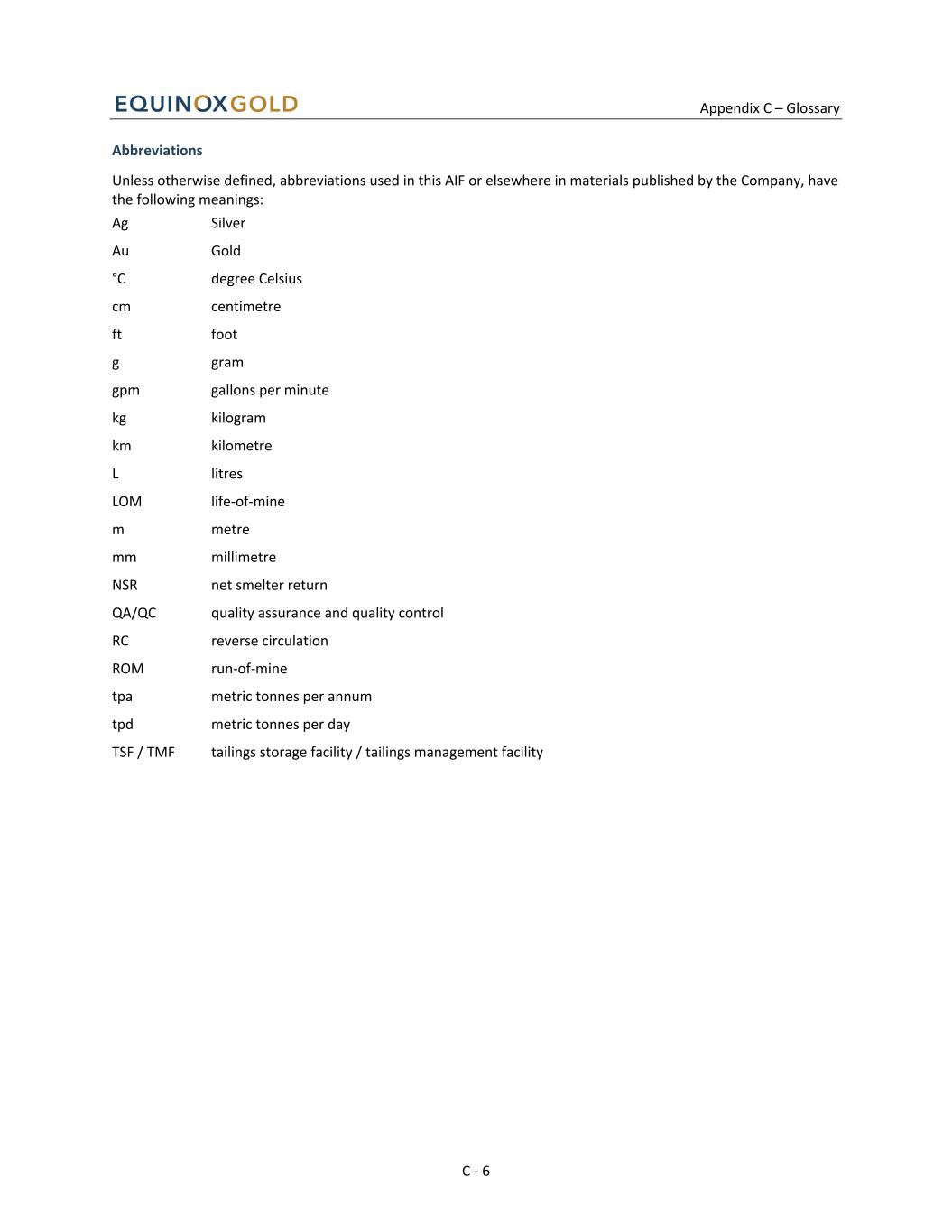 Appendix C – Glossary C - 6 Abbreviations Unless otherwise defined, abbreviations used in this AIF or elsewhere in materials published by the Company, have the following meanings: Ag Silver Au Gold °C degree Celsius cm centimetre ft foot g gram gpm gallons per minute kg kilogram km kilometre L litres LOM life-of-mine m metre mm millimetre NSR net smelter return QA/QC quality assurance and quality control RC reverse circulation ROM run-of-mine tpa metric tonnes per annum tpd metric tonnes per day TSF / TMF tailings storage facility / tailings management facility