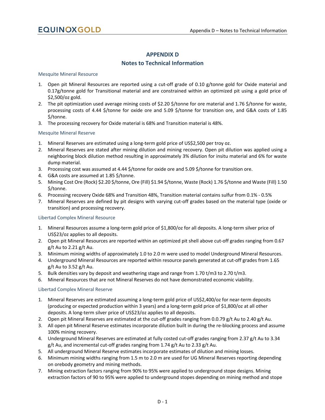 Appendix D – Notes to Technical Information D - 1 APPENDIX D Notes to Technical Information Mesquite Mineral Resource 1. Open pit Mineral Resources are reported using a cut-off grade of 0.10 g/tonne gold for Oxide material and 0.17g/tonne gold for Transitional material and are constrained within an optimized pit using a gold price of $2,500/oz gold. 2. The pit optimization used average mining costs of $2.20 $/tonne for ore material and 1.76 $/tonne for waste, processing costs of 4.44 $/tonne for oxide ore and 5.09 $/tonne for transition ore, and G&A costs of 1.85 $/tonne. 3. The processing recovery for Oxide material is 68% and Transition material is 48%. Mesquite Mineral Reserve 1. Mineral Reserves are estimated using a long-term gold price of US$2,500 per troy oz. 2. Mineral Reserves are stated after mining dilution and mining recovery. Open pit dilution was applied using a neighboring block dilution method resulting in approximately 3% dilution for insitu material and 6% for waste dump material. 3. Processing cost was assumed at 4.44 $/tonne for oxide ore and 5.09 $/tonne for transition ore. 4. G&A costs are assumed at 1.85 $/tonne. 5. Mining Cost Ore (Rock) $2.20 $/tonne, Ore (Fill) $1.94 $/tonne, Waste (Rock) 1.76 $/tonne and Waste (Fill) 1.50 $/tonne. 6. Processing recovery Oxide 68% and Transition 48%, Transition material contains sulfur from 0.1% - 0.5% 7. Mineral Reserves are defined by pit designs with varying cut-off grades based on the material type (oxide or transition) and processing recovery. Libertad Complex Mineral Resource 1. Mineral Resources assume a long-term gold price of $1,800/oz for all deposits. A long-term silver price of US$23/oz applies to all deposits. 2. Open pit Mineral Resources are reported within an optimized pit shell above cut-off grades ranging from 0.67 g/t Au to 2.21 g/t Au. 3. Minimum mining widths of approximately 1.0 to 2.0 m were used to model Underground Mineral Resources. 4. Underground Mineral Resources are reported within resource panels generated at cut-off grades from 1.65 g/t Au to 3.52 g/t Au. 5. Bulk densities vary by deposit and weathering stage and range from 1.70 t/m3 to 2.70 t/m3. 6. Mineral Resources that are not Mineral Reserves do not have demonstrated economic viability. Libertad Complex Mineral Reserve 1. Mineral Reserves are estimated assuming a long-term gold price of US$2,400/oz for near-term deposits (producing or expected production within 3 years) and a long-term gold price of $1,800/oz at all other deposits. A long-term silver price of US$23/oz applies to all deposits. 2. Open pit Mineral Reserves are estimated at the cut-off grades ranging from 0.0.79 g/t Au to 2.40 g/t Au. 3. All open pit Mineral Reserve estimates incorporate dilution built in during the re-blocking process and assume 100% mining recovery. 4. Underground Mineral Reserves are estimated at fully costed cut-off grades ranging from 2.37 g/t Au to 3.34 g/t Au, and incremental cut-off grades ranging from 1.74 g/t Au to 2.33 g/t Au. 5. All underground Mineral Reserve estimates incorporate estimates of dilution and mining losses. 6. Minimum mining widths ranging from 1.5 m to 2.0 m are used for UG Mineral Reserves reporting depending on orebody geometry and mining methods. 7. Mining extraction factors ranging from 90% to 95% were applied to underground stope designs. Mining extraction factors of 90 to 95% were applied to underground stopes depending on mining method and stope