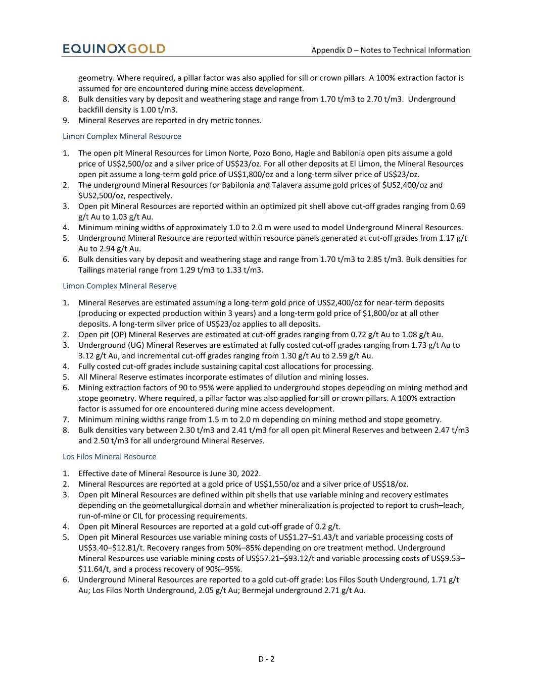 Appendix D – Notes to Technical Information D - 2 geometry. Where required, a pillar factor was also applied for sill or crown pillars. A 100% extraction factor is assumed for ore encountered during mine access development. 8. Bulk densities vary by deposit and weathering stage and range from 1.70 t/m3 to 2.70 t/m3. Underground backfill density is 1.00 t/m3. 9. Mineral Reserves are reported in dry metric tonnes. Limon Complex Mineral Resource 1. The open pit Mineral Resources for Limon Norte, Pozo Bono, Hagie and Babilonia open pits assume a gold price of US$2,500/oz and a silver price of US$23/oz. For all other deposits at El Limon, the Mineral Resources open pit assume a long-term gold price of US$1,800/oz and a long-term silver price of US$23/oz. 2. The underground Mineral Resources for Babilonia and Talavera assume gold prices of $US2,400/oz and $US2,500/oz, respectively. 3. Open pit Mineral Resources are reported within an optimized pit shell above cut-off grades ranging from 0.69 g/t Au to 1.03 g/t Au. 4. Minimum mining widths of approximately 1.0 to 2.0 m were used to model Underground Mineral Resources. 5. Underground Mineral Resource are reported within resource panels generated at cut-off grades from 1.17 g/t Au to 2.94 g/t Au. 6. Bulk densities vary by deposit and weathering stage and range from 1.70 t/m3 to 2.85 t/m3. Bulk densities for Tailings material range from 1.29 t/m3 to 1.33 t/m3. Limon Complex Mineral Reserve 1. Mineral Reserves are estimated assuming a long-term gold price of US$2,400/oz for near-term deposits (producing or expected production within 3 years) and a long-term gold price of $1,800/oz at all other deposits. A long-term silver price of US$23/oz applies to all deposits. 2. Open pit (OP) Mineral Reserves are estimated at cut-off grades ranging from 0.72 g/t Au to 1.08 g/t Au. 3. Underground (UG) Mineral Reserves are estimated at fully costed cut-off grades ranging from 1.73 g/t Au to 3.12 g/t Au, and incremental cut-off grades ranging from 1.30 g/t Au to 2.59 g/t Au. 4. Fully costed cut-off grades include sustaining capital cost allocations for processing. 5. All Mineral Reserve estimates incorporate estimates of dilution and mining losses. 6. Mining extraction factors of 90 to 95% were applied to underground stopes depending on mining method and stope geometry. Where required, a pillar factor was also applied for sill or crown pillars. A 100% extraction factor is assumed for ore encountered during mine access development. 7. Minimum mining widths range from 1.5 m to 2.0 m depending on mining method and stope geometry. 8. Bulk densities vary between 2.30 t/m3 and 2.41 t/m3 for all open pit Mineral Reserves and between 2.47 t/m3 and 2.50 t/m3 for all underground Mineral Reserves. Los Filos Mineral Resource 1. Effective date of Mineral Resource is June 30, 2022. 2. Mineral Resources are reported at a gold price of US$1,550/oz and a silver price of US$18/oz. 3. Open pit Mineral Resources are defined within pit shells that use variable mining and recovery estimates depending on the geometallurgical domain and whether mineralization is projected to report to crush–leach, run-of-mine or CIL for processing requirements. 4. Open pit Mineral Resources are reported at a gold cut-off grade of 0.2 g/t. 5. Open pit Mineral Resources use variable mining costs of US$1.27–$1.43/t and variable processing costs of US$3.40–$12.81/t. Recovery ranges from 50%–85% depending on ore treatment method. Underground Mineral Resources use variable mining costs of US$57.21–$93.12/t and variable processing costs of US$9.53– $11.64/t, and a process recovery of 90%–95%. 6. Underground Mineral Resources are reported to a gold cut-off grade: Los Filos South Underground, 1.71 g/t Au; Los Filos North Underground, 2.05 g/t Au; Bermejal underground 2.71 g/t Au.