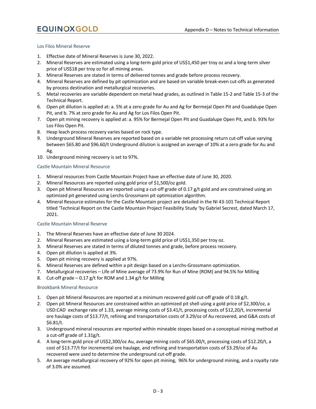 Appendix D – Notes to Technical Information D - 3 Los Filos Mineral Reserve 1. Effective date of Mineral Reserves is June 30, 2022. 2. Mineral Reserves are estimated using a long-term gold price of US$1,450 per troy oz and a long-term silver price of US$18 per troy oz for all mining areas. 3. Mineral Reserves are stated in terms of delivered tonnes and grade before process recovery. 4. Mineral Reserves are defined by pit optimization and are based on variable break-even cut-offs as generated by process destination and metallurgical recoveries. 5. Metal recoveries are variable dependent on metal head grades, as outlined in Table 15-2 and Table 15-3 of the Technical Report. 6. Open pit dilution is applied at: a. 5% at a zero grade for Au and Ag for Bermejal Open Pit and Guadalupe Open Pit, and b. 7% at zero grade for Au and Ag for Los Filos Open Pit. 7. Open pit mining recovery is applied at: a. 95% for Bermejal Open Pit and Guadalupe Open Pit, and b. 93% for Los Filos Open Pit. 8. Heap leach process recovery varies based on rock type. 9. Underground Mineral Reserves are reported based on a variable net processing return cut-off value varying between $65.80 and $96.60/t Underground dilution is assigned an average of 10% at a zero grade for Au and Ag. 10. Underground mining recovery is set to 97%. Castle Mountain Mineral Resource 1. Mineral resources from Castle Mountain Project have an effective date of June 30, 2020. 2. Mineral Resources are reported using gold price of $1,500/oz gold. 3. Open pit Mineral Resources are reported using a cut-off grade of 0.17 g/t gold and are constrained using an optimized pit generated using Lerchs Grossmann pit optimization algorithm. 4. Mineral Resource estimates for the Castle Mountain project are detailed in the NI 43-101 Technical Report titled ‘Technical Report on the Castle Mountain Project Feasibility Study ‘by Gabriel Secrest, dated March 17, 2021. Castle Mountain Mineral Reserve 1. The Mineral Reserves have an effective date of June 30 2024. 2. Mineral Reserves are estimated using a long-term gold price of US$1,350 per troy oz. 3. Mineral Reserves are stated in terms of diluted tonnes and grade, before process recovery. 4. Open pit dilution is applied at 3%. 5. Open pit mining recovery is applied at 97%. 6. Mineral Reserves are defined within a pit design based on a Lerchs-Grossmann optimization. 7. Metallurgical recoveries – Life of Mine average of 73.9% for Run of Mine (ROM) and 94.5% for Milling 8. Cut-off grade – 0.17 g/t for ROM and 1.34 g/t for Milling Brookbank Mineral Resource 1. Open pit Mineral Resources are reported at a minimum recovered gold cut-off grade of 0.18 g/t. 2. Open pit Mineral Resources are constrained within an optimized pit shell using a gold price of $2,300/oz, a USD:CAD exchange rate of 1.33, average mining costs of $3.41/t, processing costs of $12,20/t, incremental ore haulage costs of $13.77/t, refining and transportation costs of 3.29/oz of Au recovered, and G&A costs of $6.81/t. 3. Underground mineral resources are reported within mineable stopes based on a conceptual mining method at a cut-off grade of 1.31g/t. 4. A long-term gold price of US$2,300/oz Au, average mining costs of $65.00/t, processing costs of $12.20/t, a cost of $13.77/t for incremental ore haulage, and refining and transportation costs of $3.29/oz of Au recovered were used to determine the underground cut-off grade. 5. An average metallurgical recovery of 92% for open pit mining, 96% for underground mining, and a royalty rate of 3.0% are assumed.