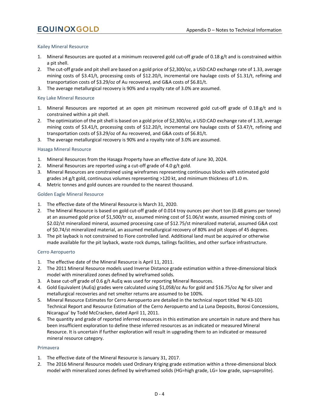 Appendix D – Notes to Technical Information D - 4 Kailey Mineral Resource 1. Mineral Resources are quoted at a minimum recovered gold cut-off grade of 0.18 g/t and is constrained within a pit shell. 2. The cut-off grade and pit shell are based on a gold price of $2,300/oz, a USD:CAD exchange rate of 1.33, average mining costs of $3.41/t, processing costs of $12.20/t, incremental ore haulage costs of $1.31/t, refining and transportation costs of $3.29/oz of Au recovered, and G&A costs of $6.81/t. 3. The average metallurgical recovery is 90% and a royalty rate of 3.0% are assumed. Key Lake Mineral Resource 1. Mineral Resources are reported at an open pit minimum recovered gold cut-off grade of 0.18 g/t and is constrained within a pit shell. 2. The optimization of the pit shell is based on a gold price of $2,300/oz, a USD:CAD exchange rate of 1.33, average mining costs of $3.41/t, processing costs of $12.20/t, incremental ore haulage costs of $3.47/t, refining and transportation costs of $3.29/oz of Au recovered, and G&A costs of $6.81/t. 3. The average metallurgical recovery is 90% and a royalty rate of 3.0% are assumed. Hasaga Mineral Resource 1. Mineral Resources from the Hasaga Property have an effective date of June 30, 2024. 2. Mineral Resources are reported using a cut-off grade of 4.0 g/t gold. 3. Mineral Resources are constrained using wireframes representing continuous blocks with estimated gold grades ≥4 g/t gold, continuous volumes representing >120 kt, and minimum thickness of 1.0 m. 4. Metric tonnes and gold ounces are rounded to the nearest thousand. Golden Eagle Mineral Resource 1. The effective date of the Mineral Resource is March 31, 2020. 2. The Mineral Resource is based on gold cut-off grade of 0.014 troy ounces per short ton (0.48 grams per tonne) at an assumed gold price of $1,500/tr oz, assumed mining cost of $1.06/st waste, assumed mining costs of $2.02/st mineralized mineral, assumed processing case of $12.75/st mineralized material, assumed G&A cost of $0.74/st mineralized material, an assumed metallurgical recovery of 80% and pit slopes of 45 degrees. 3. The pit layback is not constrained to Fiore controlled land. Additional land must be acquired or otherwise made available for the pit layback, waste rock dumps, tailings facilities, and other surface infrastructure. Cerro Aeropuerto 1. The effective date of the Mineral Resource is April 11, 2011. 2. The 2011 Mineral Resource models used Inverse Distance grade estimation within a three-dimensional block model with mineralized zones defined by wireframed solids. 3. A base cut-off grade of 0.6 g/t AuEq was used for reporting Mineral Resources. 4. Gold Equivalent (AuEq) grades were calculated using $1,058/oz Au for gold and $16.75/oz Ag for silver and metallurgical recoveries and net smelter returns are assumed to be 100%. 5. Mineral Resource Estimates for Cerro Aeropuerto are detailed in the technical report titled ‘NI 43-101 Technical Report and Resource Estimation of the Cerro Aeropuerto and La Luna Deposits, Borosi Concessions, Nicaragua’ by Todd McCracken, dated April 11, 2011. 6. The quantity and grade of reported inferred resources in this estimation are uncertain in nature and there has been insufficient exploration to define these inferred resources as an indicated or measured Mineral Resource. It is uncertain if further exploration will result in upgrading them to an indicated or measured mineral resource category. Primavera 1. The effective date of the Mineral Resource is January 31, 2017. 2. The 2016 Mineral Resource models used Ordinary Kriging grade estimation within a three-dimensional block model with mineralized zones defined by wireframed solids (HG=high grade, LG= low grade, sap=saprolite).