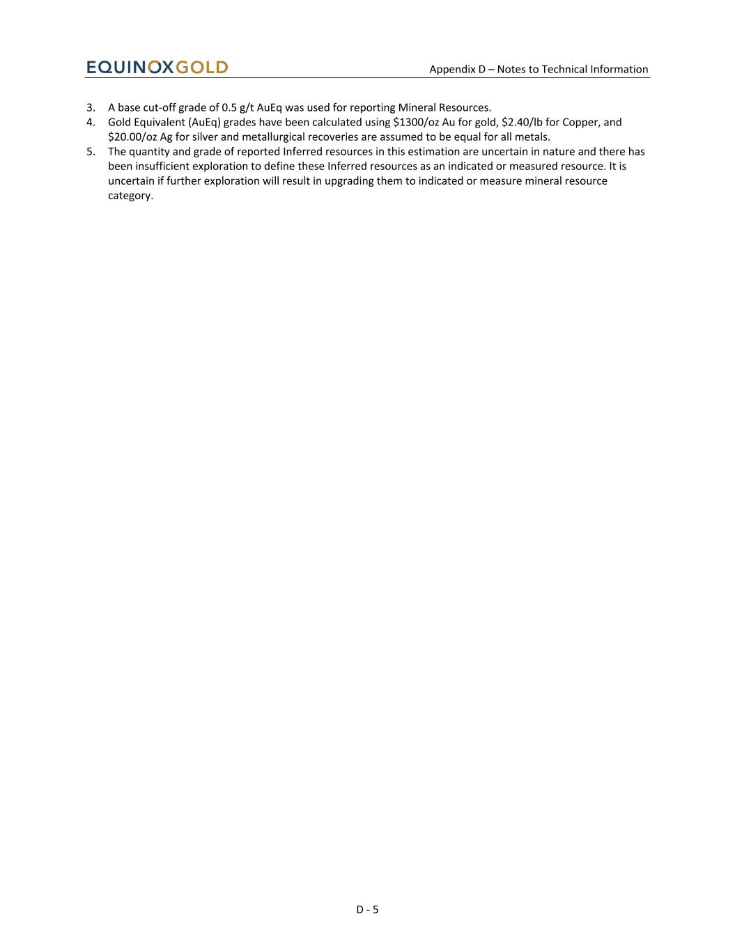 Appendix D – Notes to Technical Information D - 5 3. A base cut-off grade of 0.5 g/t AuEq was used for reporting Mineral Resources. 4. Gold Equivalent (AuEq) grades have been calculated using $1300/oz Au for gold, $2.40/lb for Copper, and $20.00/oz Ag for silver and metallurgical recoveries are assumed to be equal for all metals. 5. The quantity and grade of reported Inferred resources in this estimation are uncertain in nature and there has been insufficient exploration to define these Inferred resources as an indicated or measured resource. It is uncertain if further exploration will result in upgrading them to indicated or measure mineral resource category.