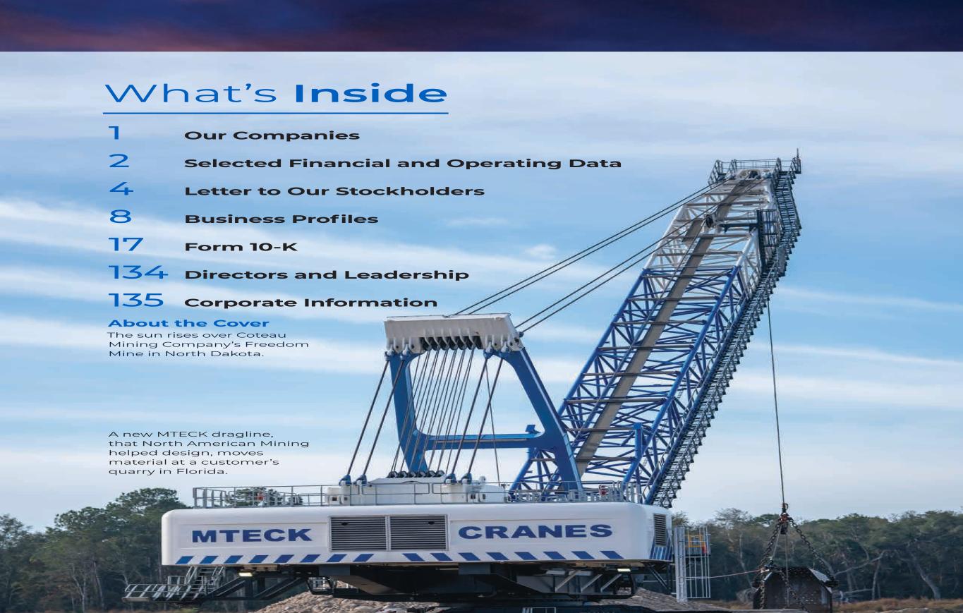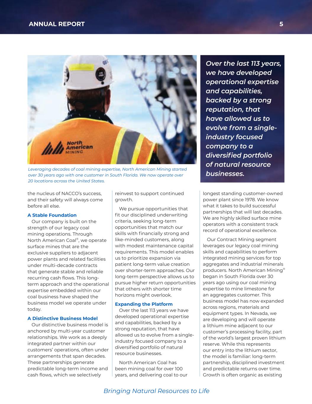 5ANNUAL REPORT Bringing Natural Resources to Life Over the last 113 years, we have developed operational expertise and capabilities, backed by a strong reputation, that have allowed us to evolve from a single- industry focused company to a diversified portfolio of natural resource businesses. the nucleus of NACCO’s success, and their safety will always come before all else. A Stable Foundation Our company is built on the strength of our legacy coal mining operations. Through North American Coal®, we operate surface mines that are the exclusive suppliers to adjacent power plants and related facilities under multi-decade contracts that generate stable and reliable recurring cash flows. This long- term approach and the operational expertise embedded within our coal business have shaped the business model we operate under today. A Distinctive Business Model Our distinctive business model is anchored by multi-year customer relationships. We work as a deeply integrated partner within our customers’ operations, often under arrangements that span decades. These partnerships generate predictable long-term income and cash flows, which we selectively Leveraging decades of coal mining expertise, North American Mining started over 30 years ago with one customer in South Florida. We now operate over 20 locations across the United States. reinvest to support continued growth. We pursue opportunities that fit our disciplined underwriting criteria, seeking long-term opportunities that match our skills with financially strong and like-minded customers, along with modest maintenance capital requirements. This model enables us to prioritize expansion via patient long-term value creation over shorter-term approaches. Our long-term perspective allows us to pursue higher return opportunities that others with shorter time horizons might overlook. Expanding the Platform Over the last 113 years we have developed operational expertise and capabilities, backed by a strong reputation, that have allowed us to evolve from a single- industry focused company to a diversified portfolio of natural resource businesses. North American Coal has been mining coal for over 100 years, and delivering coal to our longest standing customer-owned power plant since 1978. We know what it takes to build successful partnerships that will last decades. We are highly skilled surface mine operators with a consistent track record of operational excellence. Our Contract Mining segment leverages our legacy coal mining skills and capabilities to perform integrated mining services for top aggregates and industrial minerals producers. North American Mining® began in South Florida over 30 years ago using our coal mining expertise to mine limestone for an aggregates customer. This business model has now expanded across regions, materials and equipment types. In Nevada, we are developing and will operate a lithium mine adjacent to our customer’s processing facility, part of the world’s largest proven lithium reserve. While this represents our entry into the lithium sector, the model is familiar: long-term partnership, disciplined investment and predictable returns over time. Growth is often organic as existing 35425_NACCO_Rev0_3-18.pdf 5 2026/3/10 10:41˜AM