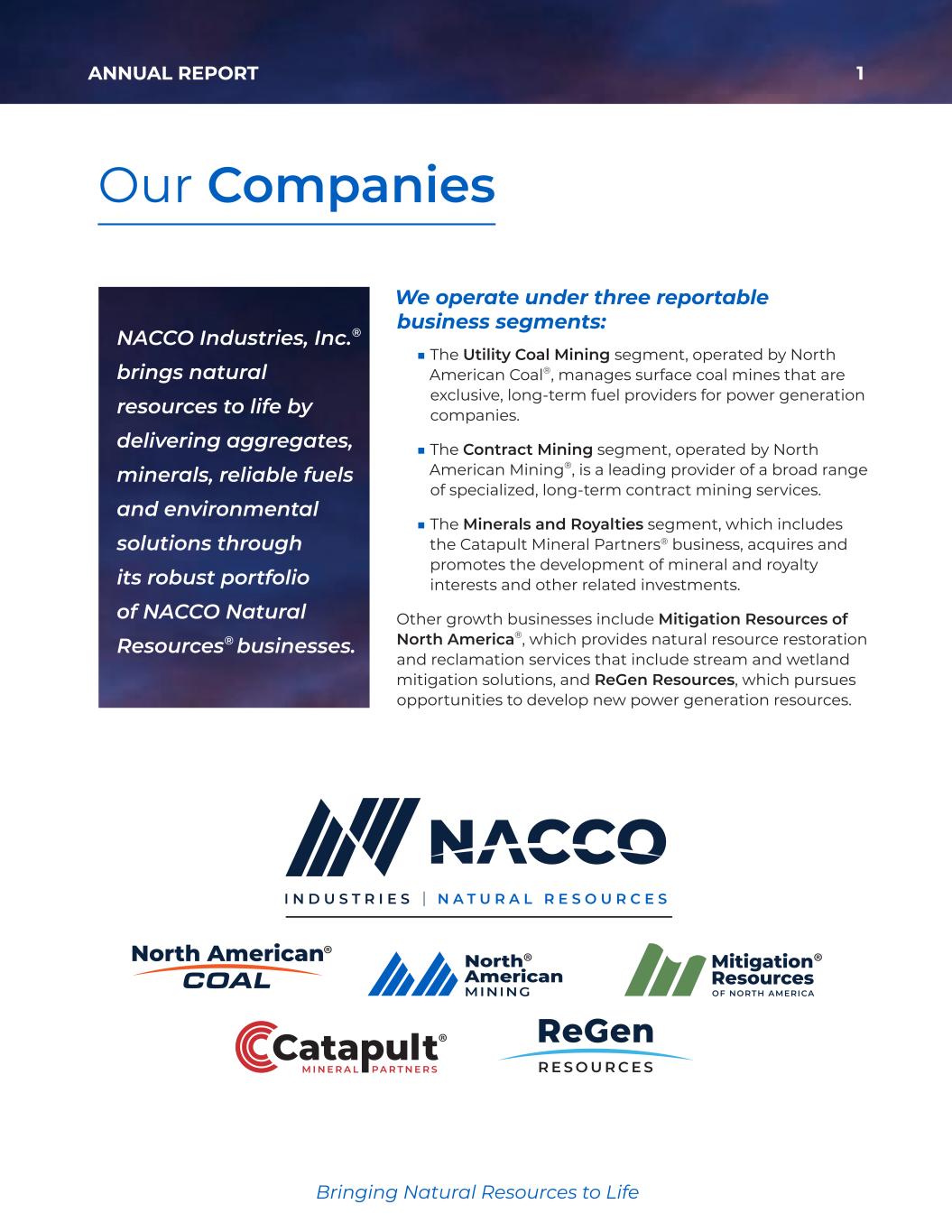 Bringing Natural Resources to Life 1ANNUAL REPORT Bringing Natural Resources to Life Our Companies We operate under three reportable business segments: ■ The Utility Coal Mining segment, operated by North American Coal®, manages surface coal mines that are exclusive, long-term fuel providers for power generation companies. ■ The Contract Mining segment, operated by North American Mining®, is a leading provider of a broad range of specialized, long-term contract mining services. ■ The Minerals and Royalties segment, which includes the Catapult Mineral Partners® business, acquires and promotes the development of mineral and royalty interests and other related investments. Other growth businesses include Mitigation Resources of North America®, which provides natural resource restoration and reclamation services that include stream and wetland mitigation solutions, and ReGen Resources, which pursues opportunities to develop new power generation resources. NACCO Industries, Inc.® brings natural resources to life by delivering aggregates, minerals, reliable fuels and environmental solutions through its robust portfolio of NACCO Natural Resources® businesses. 35425_NACCO_Color_ACG.indd 1 2026/3/12 : 0AM
