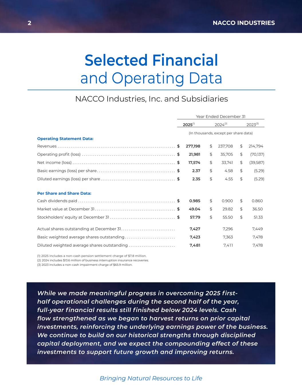 2 NACCO INDUSTRIES Bringing Natural Resources to Life Selected Financial and Operating Data Operating Statement Data: Revenues . . . . . . . . . . . . . . . . . . . . . . . . . . . . . . . . . . . . . . . . . . . . . . . . . . . . . . . . . . . . . . . Operating profit (loss) . . . . . . . . . . . . . . . . . . . . . . . . . . . . . . . . . . . . . . . . . . . . . . . . . . Net income (loss) . . . . . . . . . . . . . . . . . . . . . . . . . . . . . . . . . . . . . . . . . . . . . . . . . . . . . . . Basic earnings (loss) per share . . . . . . . . . . . . . . . . . . . . . . . . . . . . . . . . . . . . . . . . . . Diluted earnings (loss) per share . . . . . . . . . . . . . . . . . . . . . . . . . . . . . . . . . . . . . . . . Per Share and Share Data: Cash dividends paid . . . . . . . . . . . . . . . . . . . . . . . . . . . . . . . . . . . . . . . . . . . . . . . . . . . . Market value at December 31 . . . . . . . . . . . . . . . . . . . . . . . . . . . . . . . . . . . . . . . . . . . Stockholders’ equity at December 31 . . . . . . . . . . . . . . . . . . . . . . . . . . . . . . . . . . . Actual shares outstanding at December 31 . . . . . . . . . . . . . . . . . . . . . . . . . . . . . Basic weighted average shares outstanding . . . . . . . . . . . . . . . . . . . . . . . . . . . Diluted weighted average shares outstanding . . . . . . . . . . . . . . . . . . . . . . . . . (1) 2025 includes a non-cash pension settlement charge of $7.8 million. (2) 2024 includes $13.6 million of business interruption insurance recoveries. (3) 2023 includes a non-cash impairment charge of $65.9 million. $ 214,794 $ (70,137) $ (39,587) $ (5.29) $ (5.29) $ 0.860 $ 36.50 $ 51.33 7,449 7,478 7,478 Year Ended December 31 2025(1) 2024(2) 2023(3) (In thousands, except per share data) $ 277,198 $ 21,981 $ 17,574 $ 2.37 $ 2.35 $ 0.985 $ 49.04 $ 57.79 7,427 7,423 7,481 While we made meaningful progress in overcoming 2025 first- half operational challenges during the second half of the year, full-year financial results still f inished below 2024 levels. Cash flow strengthened as we began to harvest returns on prior capital investments, reinforcing the underlying earnings power of the business. We continue to build on our historical strengths through disciplined capital deployment, and we expect the compounding effect of these investments to support future growth and improving returns. $ 237,708 $ 35,705 $ 33,741 $ 4.58 $ 4.55 $ 0.900 $ 29.82 $ 55.50 7,296 7,363 7,411 NACCO Industries, Inc. and Subsidiaries 35425_NACCO_Rev0_3-18.pdf 2 2026/3/10 10:41˜AM
