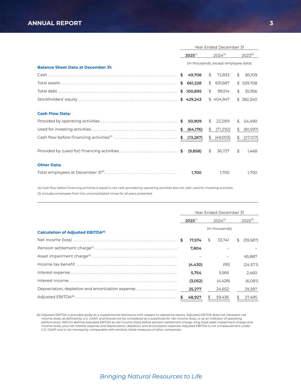 3ANNUAL REPORT Bringing Natural Resources to Life Bringing Natural Resources to Life Balance Sheet Data at December 31: Cash . . . . . . . . . . . . . . . . . . . . . . . . . . . . . . . . . . . . . . . . . . . . . . . . . . . . . . . . . . . . . . . . . . . . . Total assets . . . . . . . . . . . . . . . . . . . . . . . . . . . . . . . . . . . . . . . . . . . . . . . . . . . . . . . . . . . . . . Total debt . . . . . . . . . . . . . . . . . . . . . . . . . . . . . . . . . . . . . . . . . . . . . . . . . . . . . . . . . . . . . . . . Stockholders’ equity . . . . . . . . . . . . . . . . . . . . . . . . . . . . . . . . . . . . . . . . . . . . . . . . . . . . . Cash Flow Data: Provided by operating activities . . . . . . . . . . . . . . . . . . . . . . . . . . . . . . . . . . . . . . . . . Used for investing activities . . . . . . . . . . . . . . . . . . . . . . . . . . . . . . . . . . . . . . . . . . . . . . Cash flow before financing activities(4) . . . . . . . . . . . . . . . . . . . . . . . . . . . . . . . . . . Provided by (used for) financing activities . . . . . . . . . . . . . . . . . . . . . . . . . . . . . . . Other Data: Total employees at December 31(5). . . . . . . . . . . . . . . . . . . . . . . . . . . . . . . . . . . . . . . $ 85,109 $ 539,708 $ 35,956 $ 382,340 $ 54,490 $ (81,597) $ (27,107) $ 1,468 1,700 (4) Cash flow before financing activities is equal to net cash provided by operating activities less net cash used for investing activities. (5) Includes employees from the unconsolidated mines for all years presented. Calculation of Adjusted EBITDA(6) Net income (loss) . . . . . . . . . . . . . . . . . . . . . . . . . . . . . . . . . . . . . . . . . . . . . . . . . . . . . . . . Pension settlement charge(1) . . . . . . . . . . . . . . . . . . . . . . . . . . . . . . . . . . . . . . . . . . . . Asset impairment charge(3) . . . . . . . . . . . . . . . . . . . . . . . . . . . . . . . . . . . . . . . . . . . . . . Income tax benefit . . . . . . . . . . . . . . . . . . . . . . . . . . . . . . . . . . . . . . . . . . . . . . . . . . . . . . Interest expense . . . . . . . . . . . . . . . . . . . . . . . . . . . . . . . . . . . . . . . . . . . . . . . . . . . . . . . . . Interest income . . . . . . . . . . . . . . . . . . . . . . . . . . . . . . . . . . . . . . . . . . . . . . . . . . . . . . . . . . Depreciation, depletion and amortization expense . . . . . . . . . . . . . . . . . . . . . . Adjusted EBITDA(6). . . . . . . . . . . . . . . . . . . . . . . . . . . . . . . . . . . . . . . . . . . . . . . . . . . . . . . (6) Adjusted EBITDA is provided solely as a supplemental disclosure with respect to operating results. Adjusted EBITDA does not represent net income (loss), as defined by U.S. GAAP, and should not be considered as a substitute for net income (loss), or as an indicator of operating performance. NACCO defines Adjusted EBITDA as net income (loss) before pension settlement charge, long-lived asset impairment charge and income taxes, plus net interest expense and depreciation, depletion and amortization expense. Adjusted EBITDA is not a measurement under U.S. GAAP and is not necessarily comparable with similarly titled measures of other companies. Year Ended December 31 2025(1) 2024(2) 2023(3) (In thousands) Year Ended December 31 2025(1) 2024(2) 2023(3) (In thousands, except employee data) $ (39,587) – 65,887 (24,571) 2,460 (6,081) 29,387 $ 27,495 $ 17,574 7,804 – (4,430) 5,754 (3,052) 25,277 $ 48,927 $ 49,708 $ 661,228 $ 100,895 $ 429,243 $ 50,909 $ (64,176) $ (13,267) $ (9,858) 1,700 $ 72,833 $ 631,687 $ 99,514 $ 404,947 $ 22,289 $ (71,292) $ (49,003) $ 36,727 1,700 $ 33,741 – – (95) 5,566 (4,428) 24,652 $ 59,436 35425_NACCO_Color_ACG.indd 3 2026/3/11 2:00 M