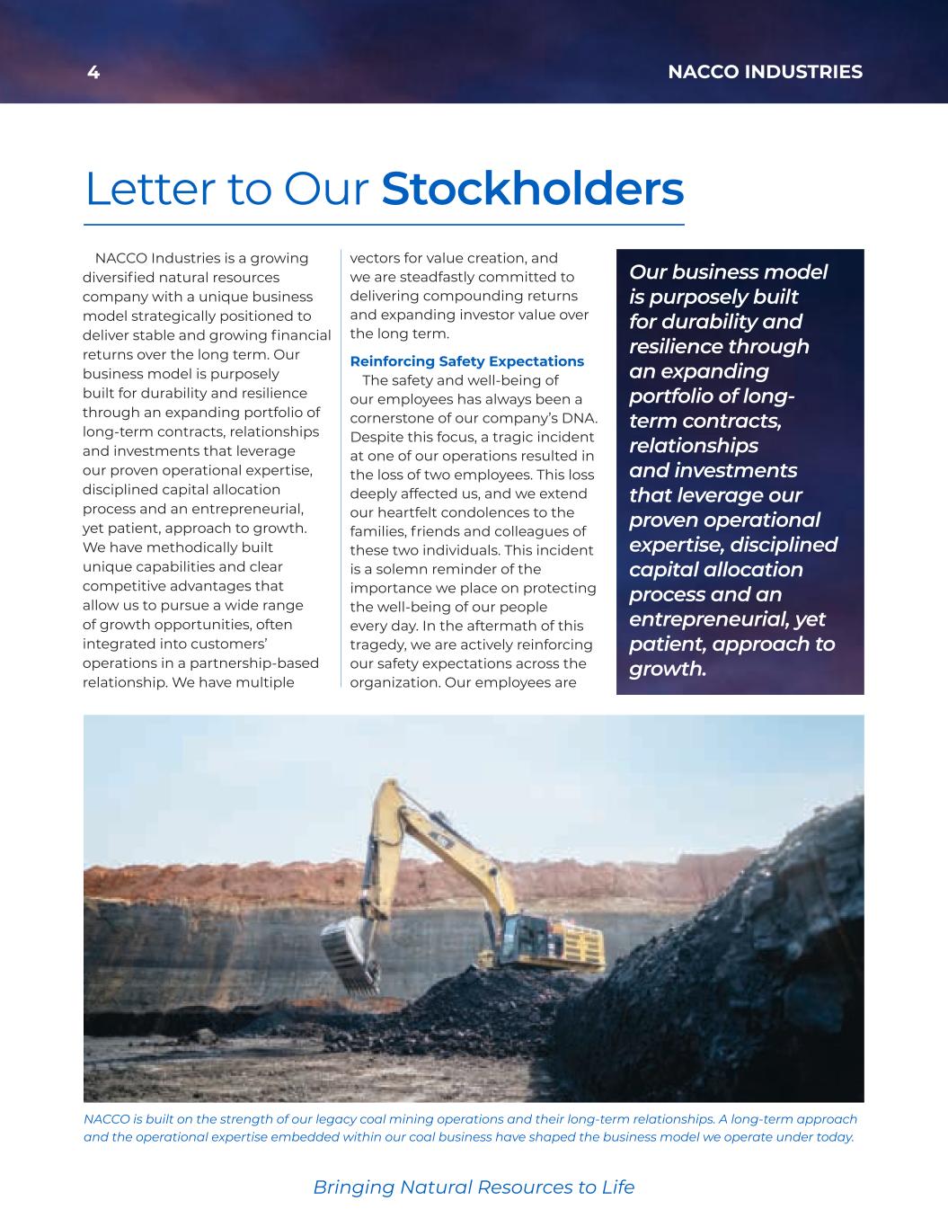 4 NACCO INDUSTRIES Bringing Natural Resources to Life Letter to Our Stockholders NACCO is built on the strength of our legacy coal mining operations and their long-term relationships. A long-term approach and the operational expertise embedded within our coal business have shaped the business model we operate under today. NACCO Industries is a growing diversified natural resources company with a unique business model strategically positioned to deliver stable and growing financial returns over the long term. Our business model is purposely built for durability and resilience through an expanding portfolio of long-term contracts, relationships and investments that leverage our proven operational expertise, disciplined capital allocation process and an entrepreneurial, yet patient, approach to growth. We have methodically built unique capabilities and clear competitive advantages that allow us to pursue a wide range of growth opportunities, often integrated into customers’ operations in a partnership-based relationship. We have multiple vectors for value creation, and we are steadfastly committed to delivering compounding returns and expanding investor value over the long term. Reinforcing Safety Expectations The safety and well-being of our employees has always been a cornerstone of our company’s DNA. Despite this focus, a tragic incident at one of our operations resulted in the loss of two employees. This loss deeply affected us, and we extend our heartfelt condolences to the families, friends and colleagues of these two individuals. This incident is a solemn reminder of the importance we place on protecting the well-being of our people every day. In the aftermath of this tragedy, we are actively reinforcing our safety expectations across the organization. Our employees are Our business model is purposely built for durability and resilience through an expanding portfolio of long- term contracts, relationships and investments that leverage our proven operational expertise, disciplined capital allocation process and an entrepreneurial, yet patient, approach to growth. 35425_NACCO_Rev0_3-18.pdf 4 2026/3/10 10:41˜AM