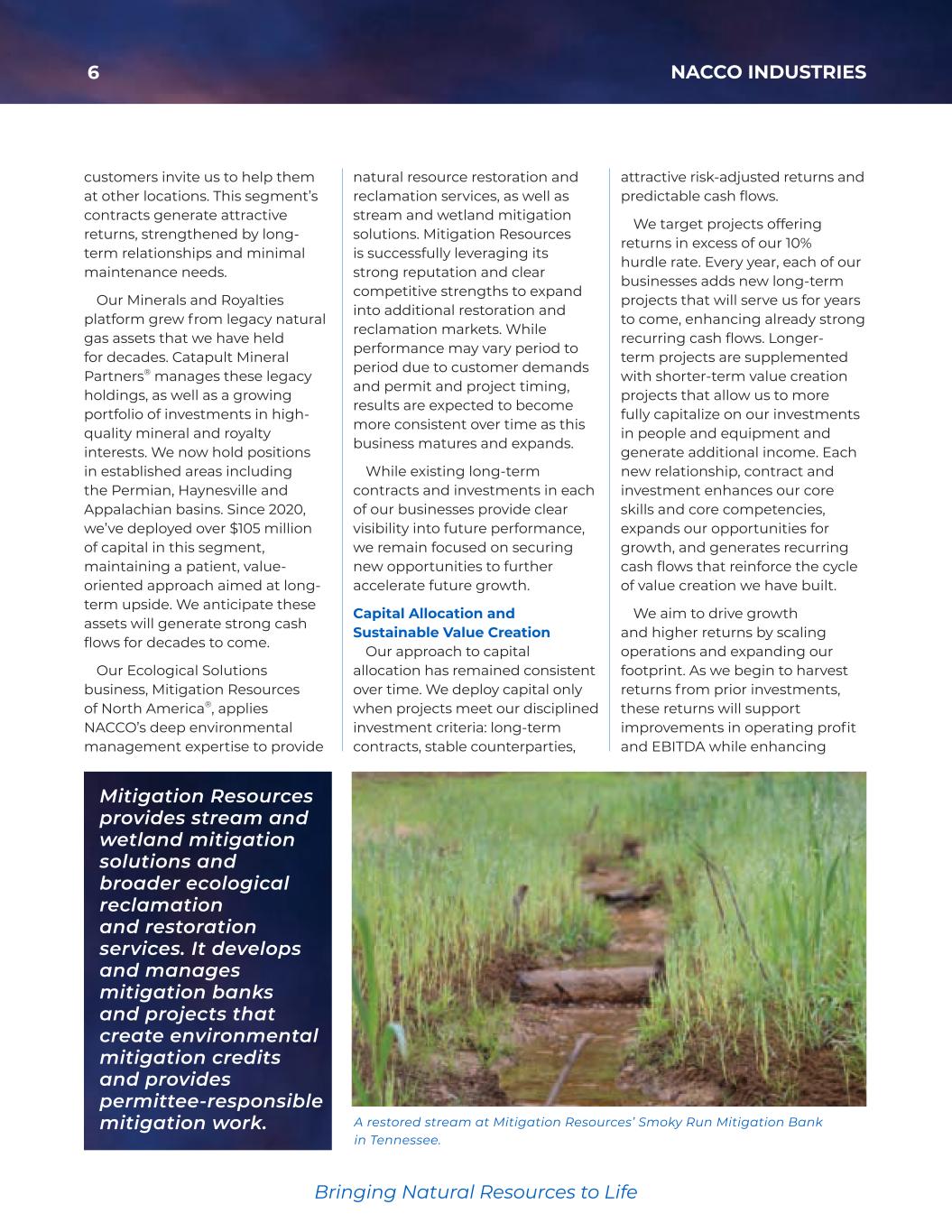 6 NACCO INDUSTRIES Bringing Natural Resources to Life A restored stream at Mitigation Resources’ Smoky Run Mitigation Bank in Tennessee. Mitigation Resources provides stream and wetland mitigation solutions and broader ecological reclamation and restoration services. It develops and manages mitigation banks and projects that create environmental mitigation credits and provides permittee-responsible mitigation work. attractive risk-adjusted returns and predictable cash flows. We target projects offering returns in excess of our 10% hurdle rate. Every year, each of our businesses adds new long-term projects that will serve us for years to come, enhancing already strong recurring cash flows. Longer- term projects are supplemented with shorter-term value creation projects that allow us to more fully capitalize on our investments in people and equipment and generate additional income. Each new relationship, contract and investment enhances our core skills and core competencies, expands our opportunities for growth, and generates recurring cash flows that reinforce the cycle of value creation we have built. We aim to drive growth and higher returns by scaling operations and expanding our footprint. As we begin to harvest returns from prior investments, these returns will support improvements in operating profit and EBITDA while enhancing customers invite us to help them at other locations. This segment’s contracts generate attractive returns, strengthened by long- term relationships and minimal maintenance needs. Our Minerals and Royalties platform grew from legacy natural gas assets that we have held for decades. Catapult Mineral Partners® manages these legacy holdings, as well as a growing portfolio of investments in high- quality mineral and royalty interests. We now hold positions in established areas including the Permian, Haynesville and Appalachian basins. Since 2020, we’ve deployed over $105 million of capital in this segment, maintaining a patient, value- oriented approach aimed at long- term upside. We anticipate these assets will generate strong cash flows for decades to come. Our Ecological Solutions business, Mitigation Resources of North America®, applies NACCO’s deep environmental management expertise to provide natural resource restoration and reclamation services, as well as stream and wetland mitigation solutions. Mitigation Resources is successfully leveraging its strong reputation and clear competitive strengths to expand into additional restoration and reclamation markets. While performance may vary period to period due to customer demands and permit and project timing, results are expected to become more consistent over time as this business matures and expands. While existing long-term contracts and investments in each of our businesses provide clear visibility into future performance, we remain focused on securing new opportunities to further accelerate future growth. Capital Allocation and Sustainable Value Creation Our approach to capital allocation has remained consistent over time. We deploy capital only when projects meet our disciplined investment criteria: long-term contracts, stable counterparties, 35425_NACCO_Rev0_3-18.pdf 6 2026/3/10 10:41˜AM