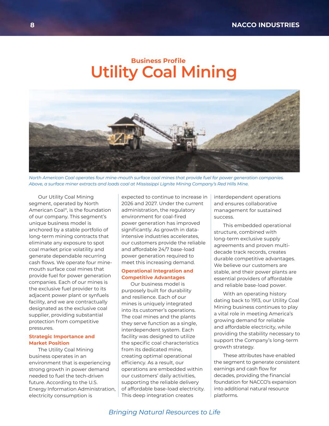 8 NACCO INDUSTRIES Bringing Natural Resources to Life Our Utility Coal Mining segment, operated by North American Coal®, is the foundation of our company. This segment’s unique business model is anchored by a stable portfolio of long-term mining contracts that eliminate any exposure to spot coal market price volatility and generate dependable recurring cash flows. We operate four mine- mouth surface coal mines that provide fuel for power generation companies. Each of our mines is the exclusive fuel provider to its adjacent power plant or synfuels facility, and we are contractually designated as the exclusive coal supplier, providing substantial protection from competitive pressures. Strategic Importance and Market Position The Utility Coal Mining business operates in an environment that is experiencing strong growth in power demand needed to fuel the tech-driven future. According to the U.S. Energy Information Administration, electricity consumption is expected to continue to increase in 2026 and 2027. Under the current administration, the regulatory environment for coal-fired power generation has improved significantly. As growth in data- intensive industries accelerates, our customers provide the reliable and affordable 24/7 base-load power generation required to meet this increasing demand. Operational Integration and Competitive Advantages Our business model is purposely built for durability and resilience. Each of our mines is uniquely integrated into its customer’s operations. The coal mines and the plants they serve function as a single, interdependent system. Each facility was designed to utilize the specific coal characteristics from its dedicated mine, creating optimal operational efficiency. As a result, our operations are embedded within our customers’ daily activities, supporting the reliable delivery of affordable base-load electricity. This deep integration creates interdependent operations and ensures collaborative management for sustained success. This embedded operational structure, combined with long-term exclusive supply agreements and proven multi- decade track records, creates durable competitive advantages. We believe our customers are stable, and their power plants are essential providers of affordable and reliable base-load power. With an operating history dating back to 1913, our Utility Coal Mining business continues to play a vital role in meeting America’s growing demand for reliable and affordable electricity, while providing the stability necessary to support the Company’s long-term growth strategy. These attributes have enabled the segment to generate consistent earnings and cash flow for decades, providing the financial foundation for NACCO’s expansion into additional natural resource platforms. North American Coal operates four mine-mouth surface coal mines that provide fuel for power generation companies. Above, a surface miner extracts and loads coal at Mississippi Lignite Mining Company’s Red Hills Mine. Utility Coal Mining Business Profile 35425_NACCO_Rev0_3-18.pdf 8 2026/3/10 10:41˜AM