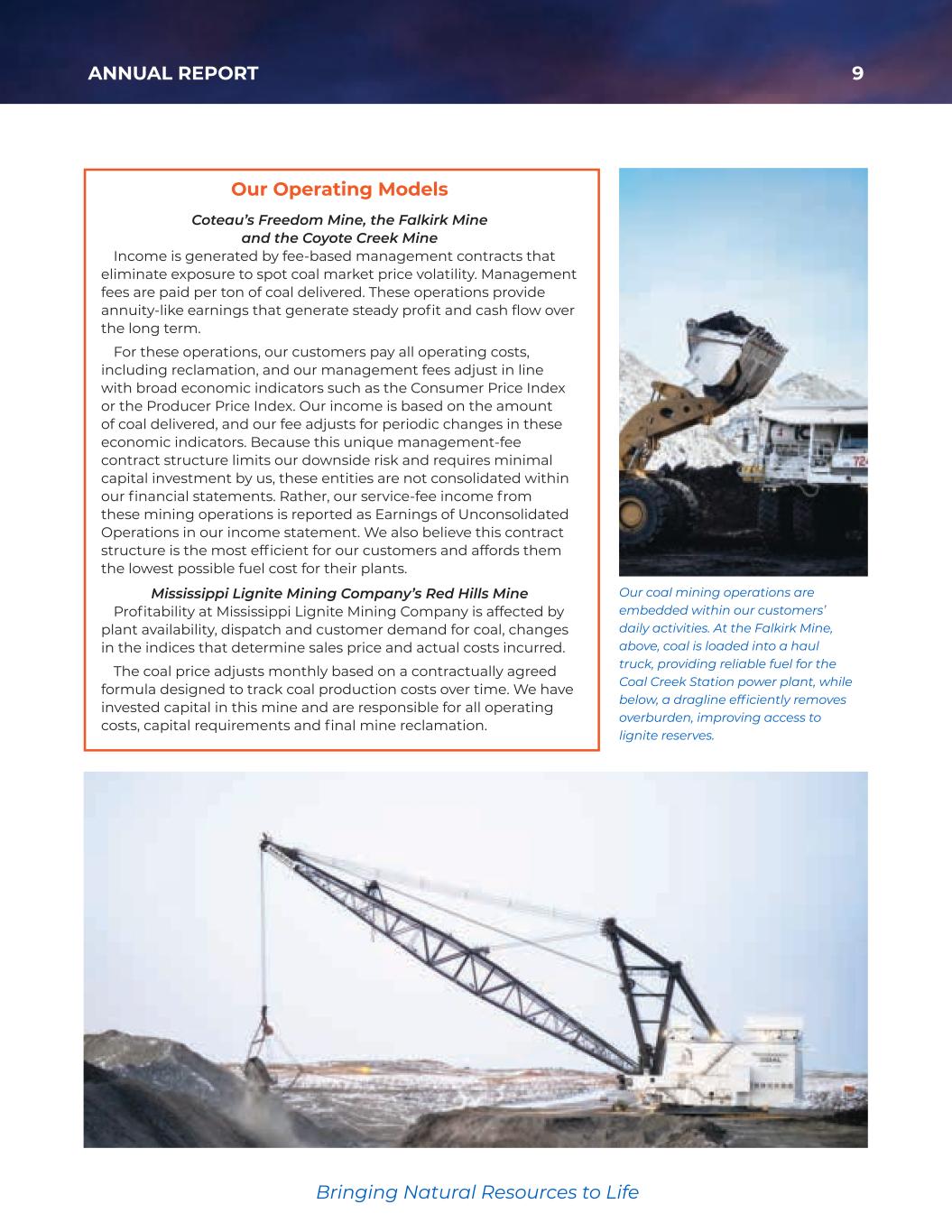 9ANNUAL REPORT Bringing Natural Resources to Life Our Operating Models Coteau’s Freedom Mine, the Falkirk Mine and the Coyote Creek Mine Income is generated by fee-based management contracts that eliminate exposure to spot coal market price volatility. Management fees are paid per ton of coal delivered. These operations provide annuity-like earnings that generate steady profit and cash flow over the long term. For these operations, our customers pay all operating costs, including reclamation, and our management fees adjust in line with broad economic indicators such as the Consumer Price Index or the Producer Price Index. Our income is based on the amount of coal delivered, and our fee adjusts for periodic changes in these economic indicators. Because this unique management-fee contract structure limits our downside risk and requires minimal capital investment by us, these entities are not consolidated within our financial statements. Rather, our service-fee income from these mining operations is reported as Earnings of Unconsolidated Operations in our income statement. We also believe this contract structure is the most efficient for our customers and affords them the lowest possible fuel cost for their plants. Mississippi Lignite Mining Company’s Red Hills Mine Profitability at Mississippi Lignite Mining Company is affected by plant availability, dispatch and customer demand for coal, changes in the indices that determine sales price and actual costs incurred. The coal price adjusts monthly based on a contractually agreed formula designed to track coal production costs over time. We have invested capital in this mine and are responsible for all operating costs, capital requirements and final mine reclamation. Our coal mining operations are embedded within our customers’ daily activities. At the Falkirk Mine, above, coal is loaded into a haul truck, providing reliable fuel for the Coal Creek Station power plant, while below, a dragline efficiently removes overburden, improving access to lignite reserves. 35425_NACCO_Rev0_3-18.pdf 9 2026/3/10 10:41˜AM