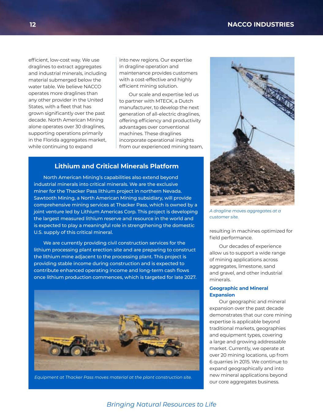 12 NACCO INDUSTRIES Bringing Natural Resources to Life Bringing Natural Resources to Life efficient, low-cost way. We use draglines to extract aggregates and industrial minerals, including material submerged below the water table. We believe NACCO operates more draglines than any other provider in the United States, with a fleet that has grown significantly over the past decade. North American Mining alone operates over 30 draglines, supporting operations primarily in the Florida aggregates market, while continuing to expand into new regions. Our expertise in dragline operation and maintenance provides customers with a cost-effective and highly efficient mining solution. Our scale and expertise led us to partner with MTECK, a Dutch manufacturer, to develop the next generation of all-electric draglines, offering efficiency and productivity advantages over conventional machines. These draglines incorporate operational insights from our experienced mining team, resulting in machines optimized for field performance. Our decades of experience allow us to support a wide range of mining applications across aggregates, limestone, sand and gravel, and other industrial minerals. Geographic and Mineral Expansion Our geographic and mineral expansion over the past decade demonstrates that our core mining expertise is applicable beyond traditional markets, geographies and equipment types, covering a large and growing addressable market. Currently, we operate at over 20 mining locations, up from 6 quarries in 2015. We continue to expand geographically and into new mineral applications beyond our core aggregates business. A dragline moves aggregates at a customer site. Lithium and Critical Minerals Platform North American Mining’s capabilities also extend beyond industrial minerals into critical minerals. We are the exclusive miner for the Thacker Pass lithium project in northern Nevada. Sawtooth Mining, a North American Mining subsidiary, will provide comprehensive mining services at Thacker Pass, which is owned by a joint venture led by Lithium Americas Corp. This project is developing the largest measured lithium reserve and resource in the world and is expected to play a meaningful role in strengthening the domestic U.S. supply of this critical mineral. We are currently providing civil construction services for the lithium processing plant erection site and are preparing to construct the lithiummine adjacent to the processing plant. This project is providing stable income during construction and is expected to contribute enhanced operating income and long-term cash flows once lithium production commences, which is targeted for late 2027. Equipment at Thacker Pass moves material at the plant construction site. 35425_NACCO_Color_ACG.indd 12 2026/3/11 2:0 M