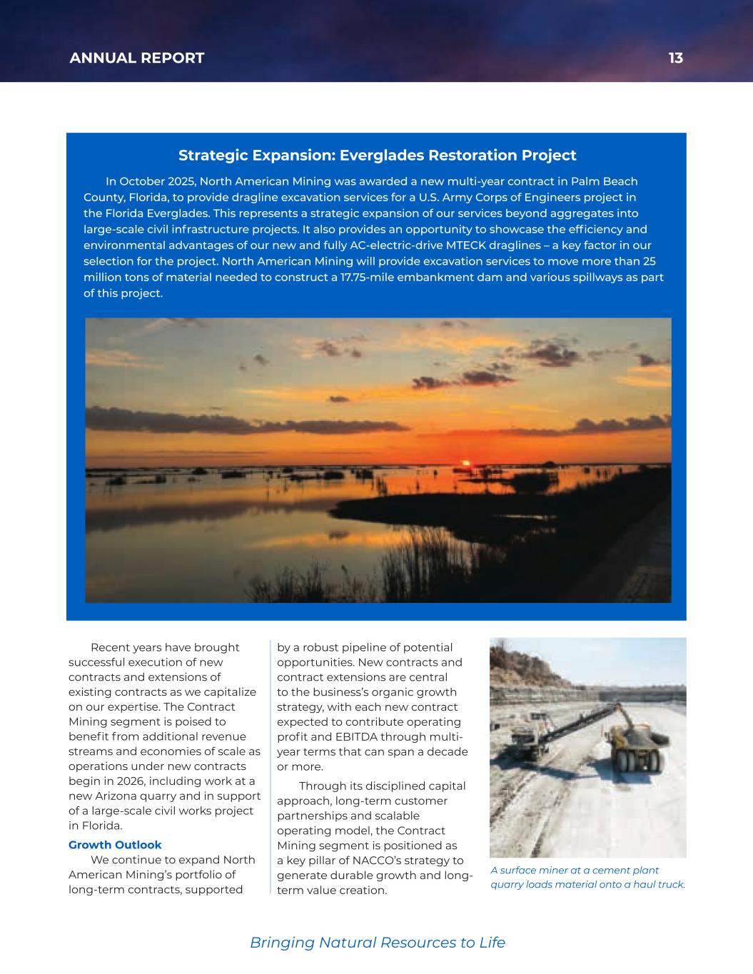 13ANNUAL REPORT Bringing Natural Resources to Life Strategic Expansion: Everglades Restoration Project In October 2025, North American Mining was awarded a newmulti-year contract in Palm Beach County, Florida, to provide dragline excavation services for a U.S. Army Corps of Engineers project in the Florida Everglades. This represents a strategic expansion of our services beyond aggregates into large-scale civil infrastructure projects. It also provides an opportunity to showcase the efficiency and environmental advantages of our new and fully AC-electric-drive MTECK draglines – a key factor in our selection for the project. North American Mining will provide excavation services to move more than 25 million tons of material needed to construct a 17.75-mile embankment dam and various spillways as part of this project. A surface miner at a cement plant quarry loads material onto a haul truck. Recent years have brought successful execution of new contracts and extensions of existing contracts as we capitalize on our expertise. The Contract Mining segment is poised to benefit from additional revenue streams and economies of scale as operations under new contracts begin in 2026, including work at a new Arizona quarry and in support of a large-scale civil works project in Florida. Growth Outlook We continue to expand North American Mining’s portfolio of long-term contracts, supported by a robust pipeline of potential opportunities. New contracts and contract extensions are central to the business’s organic growth strategy, with each new contract expected to contribute operating profit and EBITDA through multi- year terms that can span a decade or more. Through its disciplined capital approach, long-term customer partnerships and scalable operating model, the Contract Mining segment is positioned as a key pillar of NACCO’s strategy to generate durable growth and long- term value creation. 35425_NACCO_Rev0_3-18.pdf 13 2026/3/10 10:41˜AM