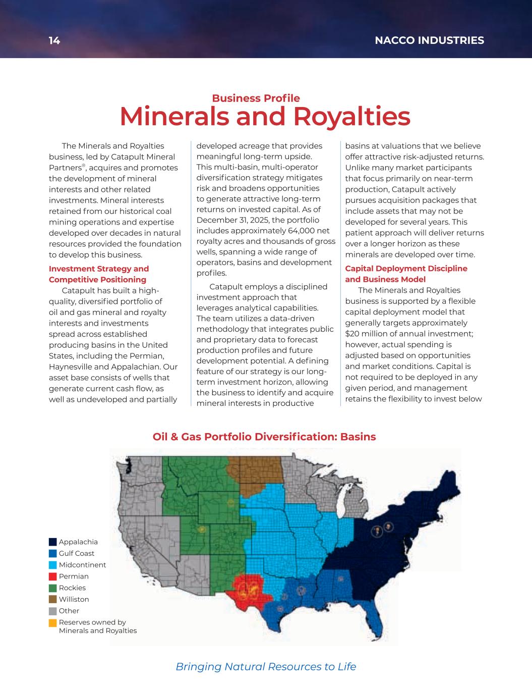 14 NACCO INDUSTRIES Bringing Natural Resources to Life Bringing Natural Resources to Life The Minerals and Royalties business, led by Catapult Mineral Partners®, acquires and promotes the development of mineral interests and other related investments. Mineral interests retained from our historical coal mining operations and expertise developed over decades in natural resources provided the foundation to develop this business. Investment Strategy and Competitive Positioning Catapult has built a high- quality, diversified portfolio of oil and gas mineral and royalty interests and investments spread across established producing basins in the United States, including the Permian, Haynesville and Appalachian. Our asset base consists of wells that generate current cash flow, as well as undeveloped and partially developed acreage that provides meaningful long-term upside. This multi-basin, multi-operator diversification strategy mitigates risk and broadens opportunities to generate attractive long-term returns on invested capital. As of December 31, 2025, the portfolio includes approximately 64,000 net royalty acres and thousands of gross wells, spanning a wide range of operators, basins and development profiles. Catapult employs a disciplined investment approach that leverages analytical capabilities. The team utilizes a data-driven methodology that integrates public and proprietary data to forecast production profiles and future development potential. A defining feature of our strategy is our long- term investment horizon, allowing the business to identify and acquire mineral interests in productive basins at valuations that we believe offer attractive risk-adjusted returns. Unlike many market participants that focus primarily on near-term production, Catapult actively pursues acquisition packages that include assets that may not be developed for several years. This patient approach will deliver returns over a longer horizon as these minerals are developed over time. Capital Deployment Discipline and Business Model The Minerals and Royalties business is supported by a flexible capital deployment model that generally targets approximately $20 million of annual investment; however, actual spending is adjusted based on opportunities and market conditions. Capital is not required to be deployed in any given period, and management retains the flexibility to invest below Oil & Gas Portfolio Diversification: Basins Minerals and Royalties Business Profile Appalachia Gulf Coast Midcontinent Permian Rockies Williston Other Reserves owned by Minerals and Royalties 35425_NACCO_Color_ACG.indd 14 2026/3/12 : AM