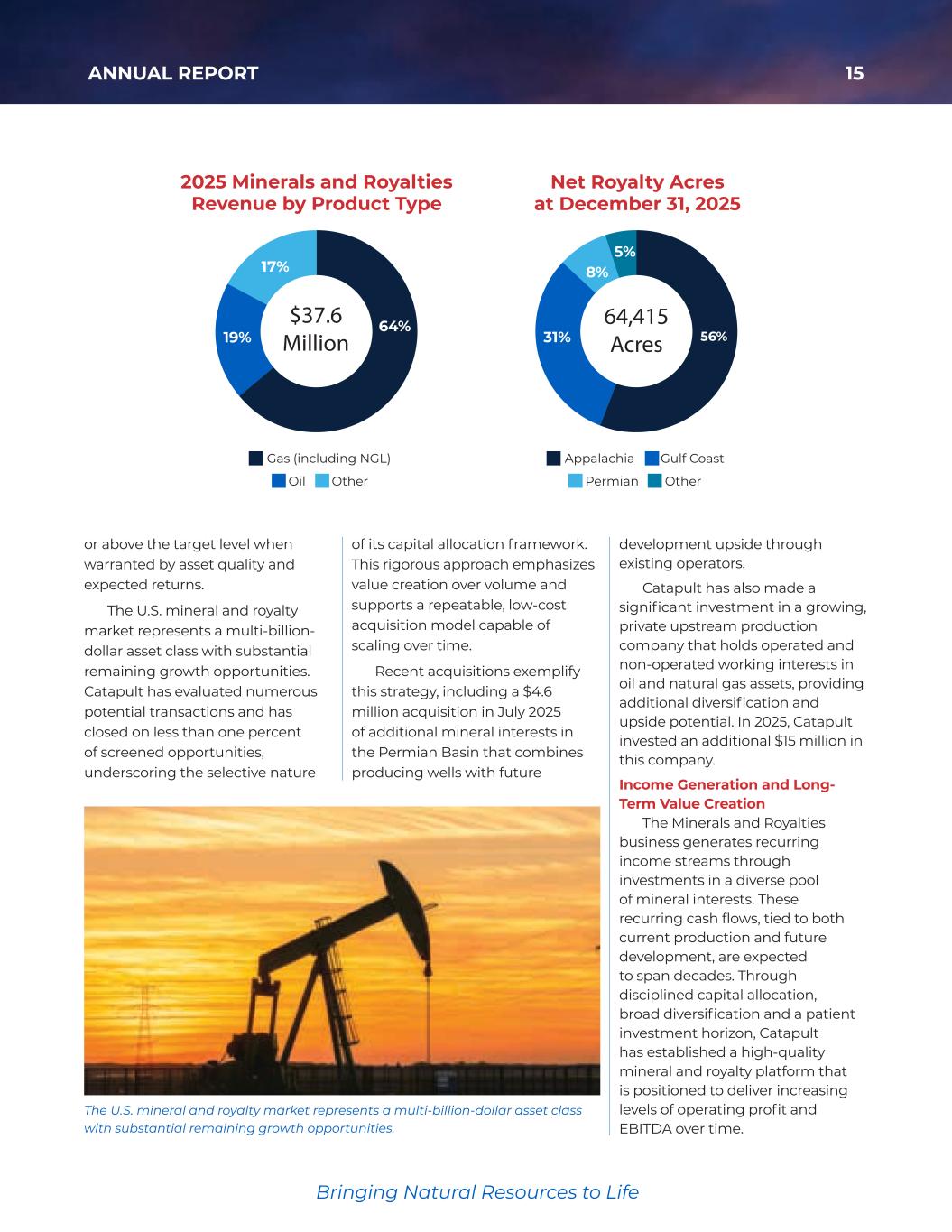 15ANNUAL REPORT Bringing Natural Resources to Life Bringing Natural Resources to Life or above the target level when warranted by asset quality and expected returns. The U.S. mineral and royalty market represents a multi-billion- dollar asset class with substantial remaining growth opportunities. Catapult has evaluated numerous potential transactions and has closed on less than one percent of screened opportunities, underscoring the selective nature of its capital allocation framework. This rigorous approach emphasizes value creation over volume and supports a repeatable, low-cost acquisition model capable of scaling over time. Recent acquisitions exemplify this strategy, including a $4.6 million acquisition in July 2025 of additional mineral interests in the Permian Basin that combines producing wells with future development upside through existing operators. Catapult has also made a significant investment in a growing, private upstream production company that holds operated and non-operated working interests in oil and natural gas assets, providing additional diversification and upside potential. In 2025, Catapult invested an additional $15 million in this company. Income Generation and Long- Term Value Creation The Minerals and Royalties business generates recurring income streams through investments in a diverse pool of mineral interests. These recurring cash flows, tied to both current production and future development, are expected to span decades. Through disciplined capital allocation, broad diversification and a patient investment horizon, Catapult has established a high-quality mineral and royalty platform that is positioned to deliver increasing levels of operating profit and EBITDA over time. The U.S. mineral and royalty market represents a multi-billion-dollar asset class with substantial remaining growth opportunities. 17% 19% 64% Gas (including NGL) Oil Other Appalachia Gulf Coast Permian Other 2025 Minerals and Royalties Revenue by Product Type Net Royalty Acres at December 31, 2025 31% 56% 8% 5% $37.6 Million 64,415 Acres 2025 inerals and Royalties Revenue by roduct Type Net Royalty Acres at ece ber 31, 2025 Appalachia Gulf Coast Permian Other Gas (including NGL) Oil Other 35425_NACCO_Color_ACG.indd 15 2026/3/12 : AM