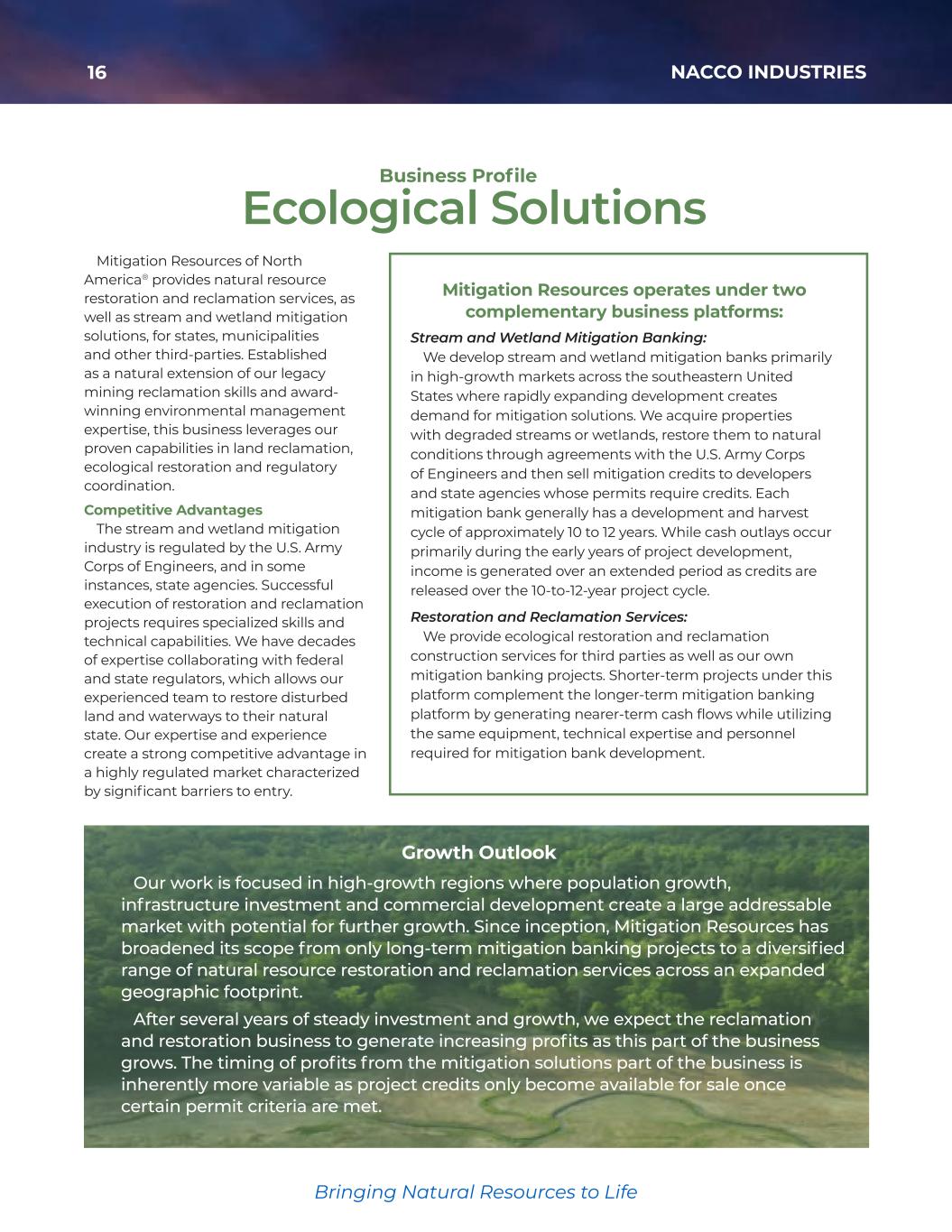 16 NACCO INDUSTRIES Bringing Natural Resources to Life Our work is focused in high-growth regions where population growth, infrastructure investment and commercial development create a large addressable market with potential for further growth. Since inception, Mitigation Resources has broadened its scope from only long-termmitigation banking projects to a diversified range of natural resource restoration and reclamation services across an expanded geographic footprint. After several years of steady investment and growth, we expect the reclamation and restoration business to generate increasing profits as this part of the business grows. The timing of profits from themitigation solutions part of the business is inherently more variable as project credits only become available for sale once certain permit criteria are met. Growth Outlook Mitigation Resources of North America® provides natural resource restoration and reclamation services, as well as stream and wetland mitigation solutions, for states, municipalities and other third-parties. Established as a natural extension of our legacy mining reclamation skills and award- winning environmental management expertise, this business leverages our proven capabilities in land reclamation, ecological restoration and regulatory coordination. Competitive Advantages The stream and wetland mitigation industry is regulated by the U.S. Army Corps of Engineers, and in some instances, state agencies. Successful execution of restoration and reclamation projects requires specialized skills and technical capabilities. We have decades of expertise collaborating with federal and state regulators, which allows our experienced team to restore disturbed land and waterways to their natural state. Our expertise and experience create a strong competitive advantage in a highly regulated market characterized by significant barriers to entry. Mitigation Resources operates under two complementary business platforms: Stream and Wetland Mitigation Banking: We develop stream and wetland mitigation banks primarily in high-growth markets across the southeastern United States where rapidly expanding development creates demand for mitigation solutions. We acquire properties with degraded streams or wetlands, restore them to natural conditions through agreements with the U.S. Army Corps of Engineers and then sell mitigation credits to developers and state agencies whose permits require credits. Each mitigation bank generally has a development and harvest cycle of approximately 10 to 12 years. While cash outlays occur primarily during the early years of project development, income is generated over an extended period as credits are released over the 10-to-12-year project cycle. Restoration and Reclamation Services: We provide ecological restoration and reclamation construction services for third parties as well as our own mitigation banking projects. Shorter-term projects under this platform complement the longer-term mitigation banking platform by generating nearer-term cash flows while utilizing the same equipment, technical expertise and personnel required for mitigation bank development. Ecological Solutions Business Profile 35425_NACCO_Rev0_3-18.pdf 16 2026/3/10 10:41˜AM