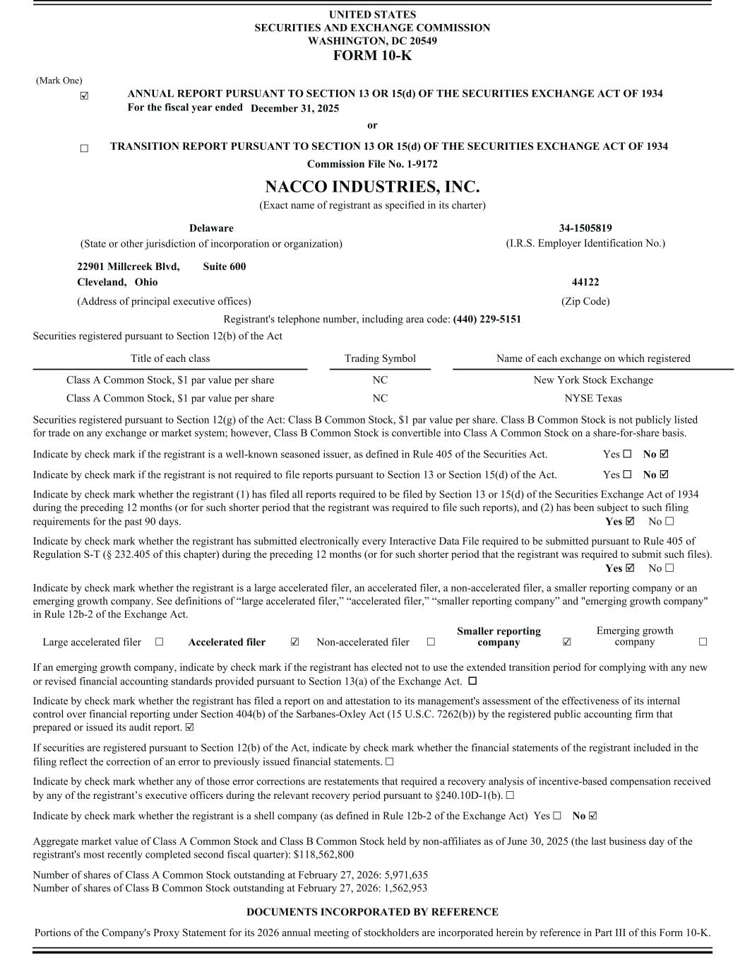 UNITED STATES SECURITIES AND EXCHANGE COMMISSION WASHINGTON, DC 20549 FORM 10-K (Mark One) ☑ ANNUAL REPORT PURSUANT TO SECTION 13 OR 15(d) OF THE SECURITIES EXCHANGE ACT OF 1934 For the fiscal year ended December 31, 2025 or ☐ TRANSITION REPORT PURSUANT TO SECTION 13 OR 15(d) OF THE SECURITIES EXCHANGE ACT OF 1934 Commission File No. 1-9172 NACCO INDUSTRIES, INC. (Exact name of registrant as specified in its charter) Delaware 34-1505819 (State or other jurisdiction of incorporation or organization) (I.R.S. Employer Identification No.) 22901 Millcreek Blvd, Suite 600 Cleveland, Ohio 44122 (Address of principal executive offices) (Zip Code) Registrant's telephone number, including area code: (440) 229-5151 Securities registered pursuant to Section 12(b) of the Act Title of each class Trading Symbol Name of each exchange on which registered Class A Common Stock, $1 par value per share NC New York Stock Exchange Class A Common Stock, $1 par value per share NC NYSE Texas Securities registered pursuant to Section 12(g) of the Act: Class B Common Stock, $1 par value per share. Class B Common Stock is not publicly listed for trade on any exchange or market system; however, Class B Common Stock is convertible into Class A Common Stock on a share-for-share basis. Indicate by check mark if the registrant is a well-known seasoned issuer, as defined in Rule 405 of the Securities Act. Yes ¨ No þ Indicate by check mark if the registrant is not required to file reports pursuant to Section 13 or Section 15(d) of the Act. Yes ¨ No þ Indicate by check mark whether the registrant (1) has filed all reports required to be filed by Section 13 or 15(d) of the Securities Exchange Act of 1934 during the preceding 12 months (or for such shorter period that the registrant was required to file such reports), and (2) has been subject to such filing requirements for the past 90 days. Yes þ No £ Indicate by check mark whether the registrant has submitted electronically every Interactive Data File required to be submitted pursuant to Rule 405 of Regulation S-T (§ 232.405 of this chapter) during the preceding 12 months (or for such shorter period that the registrant was required to submit such files). Yes þ No £ Indicate by check mark whether the registrant is a large accelerated filer, an accelerated filer, a non-accelerated filer, a smaller reporting company or an emerging growth company. See definitions of “large accelerated filer,” “accelerated filer,” “smaller reporting company” and "emerging growth company" in Rule 12b-2 of the Exchange Act. Large accelerated filer ☐ Accelerated filer ☑ Non-accelerated filer ☐ Smaller reporting company ☑ Emerging growth company ☐ If an emerging growth company, indicate by check mark if the registrant has elected not to use the extended transition period for complying with any new or revised financial accounting standards provided pursuant to Section 13(a) of the Exchange Act. o Indicate by check mark whether the registrant has filed a report on and attestation to its management's assessment of the effectiveness of its internal control over financial reporting under Section 404(b) of the Sarbanes-Oxley Act (15 U.S.C. 7262(b)) by the registered public accounting firm that prepared or issued its audit report. ☑ If securities are registered pursuant to Section 12(b) of the Act, indicate by check mark whether the financial statements of the registrant included in the filing reflect the correction of an error to previously issued financial statements. ☐ Indicate by check mark whether any of those error corrections are restatements that required a recovery analysis of incentive-based compensation received by any of the registrant’s executive officers during the relevant recovery period pursuant to §240.10D-1(b). ☐ Indicate by check mark whether the registrant is a shell company (as defined in Rule 12b-2 of the Exchange Act) Yes ☐ No ☑ Aggregate market value of Class A Common Stock and Class B Common Stock held by non-affiliates as of June 30, 2025 (the last business day of the registrant's most recently completed second fiscal quarter): $118,562,800 Number of shares of Class A Common Stock outstanding at February 27, 2026: 5,971,635 Number of shares of Class B Common Stock outstanding at February 27, 2026: 1,562,953 DOCUMENTS INCORPORATED BY REFERENCE Portions of the Company's Proxy Statement for its 2026 annual meeting of stockholders are incorporated herein by reference in Part III of this Form 10-K.