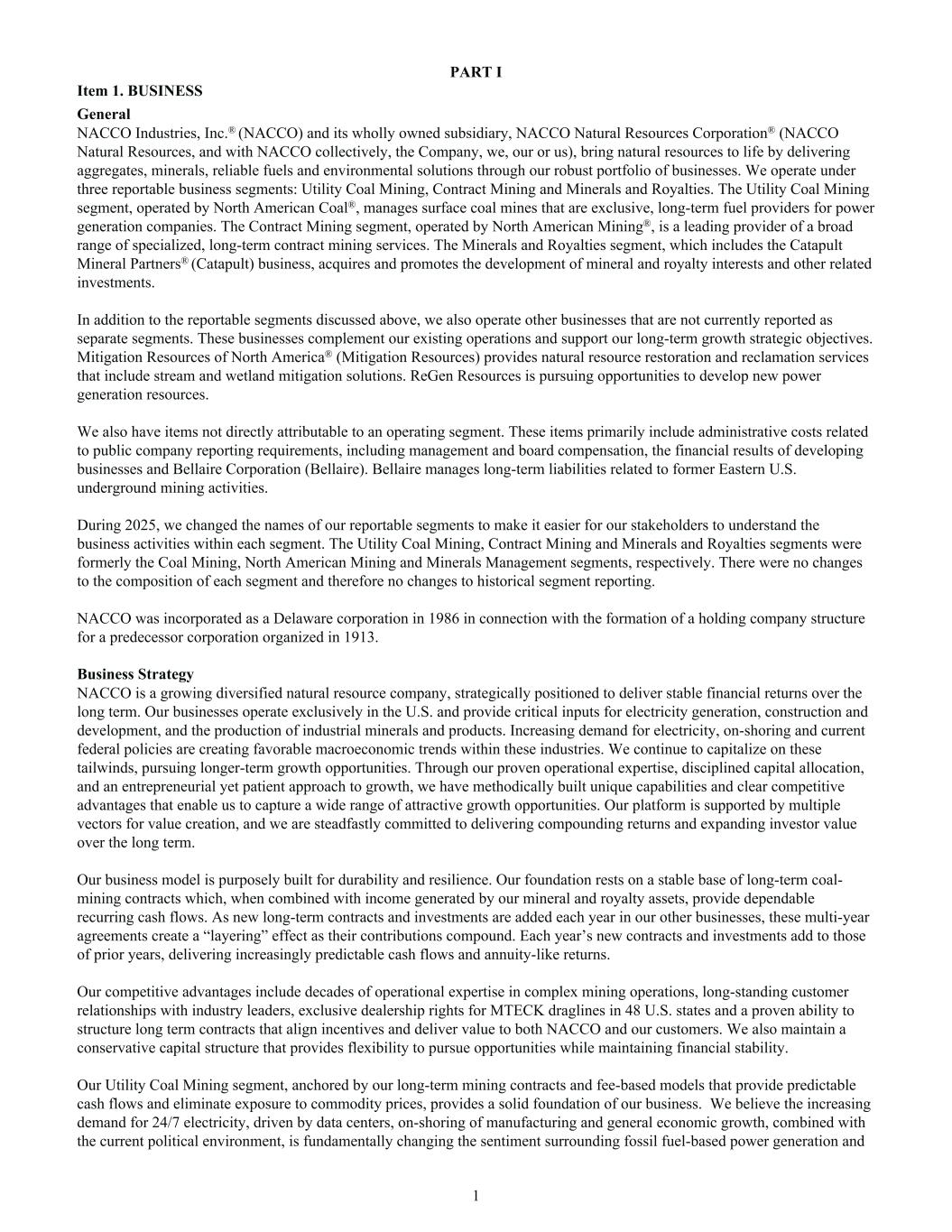 PART I Item 1. BUSINESS General NACCO Industries, Inc.® (NACCO) and its wholly owned subsidiary, NACCO Natural Resources Corporation® (NACCO Natural Resources, and with NACCO collectively, the Company, we, our or us), bring natural resources to life by delivering aggregates, minerals, reliable fuels and environmental solutions through our robust portfolio of businesses. We operate under three reportable business segments: Utility Coal Mining, Contract Mining and Minerals and Royalties. The Utility Coal Mining segment, operated by North American Coal®, manages surface coal mines that are exclusive, long-term fuel providers for power generation companies. The Contract Mining segment, operated by North American Mining®, is a leading provider of a broad range of specialized, long-term contract mining services. The Minerals and Royalties segment, which includes the Catapult Mineral Partners® (Catapult) business, acquires and promotes the development of mineral and royalty interests and other related investments. In addition to the reportable segments discussed above, we also operate other businesses that are not currently reported as separate segments. These businesses complement our existing operations and support our long-term growth strategic objectives. Mitigation Resources of North America® (Mitigation Resources) provides natural resource restoration and reclamation services that include stream and wetland mitigation solutions. ReGen Resources is pursuing opportunities to develop new power generation resources. We also have items not directly attributable to an operating segment. These items primarily include administrative costs related to public company reporting requirements, including management and board compensation, the financial results of developing businesses and Bellaire Corporation (Bellaire). Bellaire manages long-term liabilities related to former Eastern U.S. underground mining activities. During 2025, we changed the names of our reportable segments to make it easier for our stakeholders to understand the business activities within each segment. The Utility Coal Mining, Contract Mining and Minerals and Royalties segments were formerly the Coal Mining, North American Mining and Minerals Management segments, respectively. There were no changes to the composition of each segment and therefore no changes to historical segment reporting. NACCO was incorporated as a Delaware corporation in 1986 in connection with the formation of a holding company structure for a predecessor corporation organized in 1913. Business Strategy NACCO is a growing diversified natural resource company, strategically positioned to deliver stable financial returns over the long term. Our businesses operate exclusively in the U.S. and provide critical inputs for electricity generation, construction and development, and the production of industrial minerals and products. Increasing demand for electricity, on-shoring and current federal policies are creating favorable macroeconomic trends within these industries. We continue to capitalize on these tailwinds, pursuing longer-term growth opportunities. Through our proven operational expertise, disciplined capital allocation, and an entrepreneurial yet patient approach to growth, we have methodically built unique capabilities and clear competitive advantages that enable us to capture a wide range of attractive growth opportunities. Our platform is supported by multiple vectors for value creation, and we are steadfastly committed to delivering compounding returns and expanding investor value over the long term. Our business model is purposely built for durability and resilience. Our foundation rests on a stable base of long-term coal- mining contracts which, when combined with income generated by our mineral and royalty assets, provide dependable recurring cash flows. As new long-term contracts and investments are added each year in our other businesses, these multi-year agreements create a “layering” effect as their contributions compound. Each year’s new contracts and investments add to those of prior years, delivering increasingly predictable cash flows and annuity-like returns. Our competitive advantages include decades of operational expertise in complex mining operations, long-standing customer relationships with industry leaders, exclusive dealership rights for MTECK draglines in 48 U.S. states and a proven ability to structure long term contracts that align incentives and deliver value to both NACCO and our customers. We also maintain a conservative capital structure that provides flexibility to pursue opportunities while maintaining financial stability. Our Utility Coal Mining segment, anchored by our long-term mining contracts and fee-based models that provide predictable cash flows and eliminate exposure to commodity prices, provides a solid foundation of our business. We believe the increasing demand for 24/7 electricity, driven by data centers, on-shoring of manufacturing and general economic growth, combined with the current political environment, is fundamentally changing the sentiment surrounding fossil fuel-based power generation and 1
