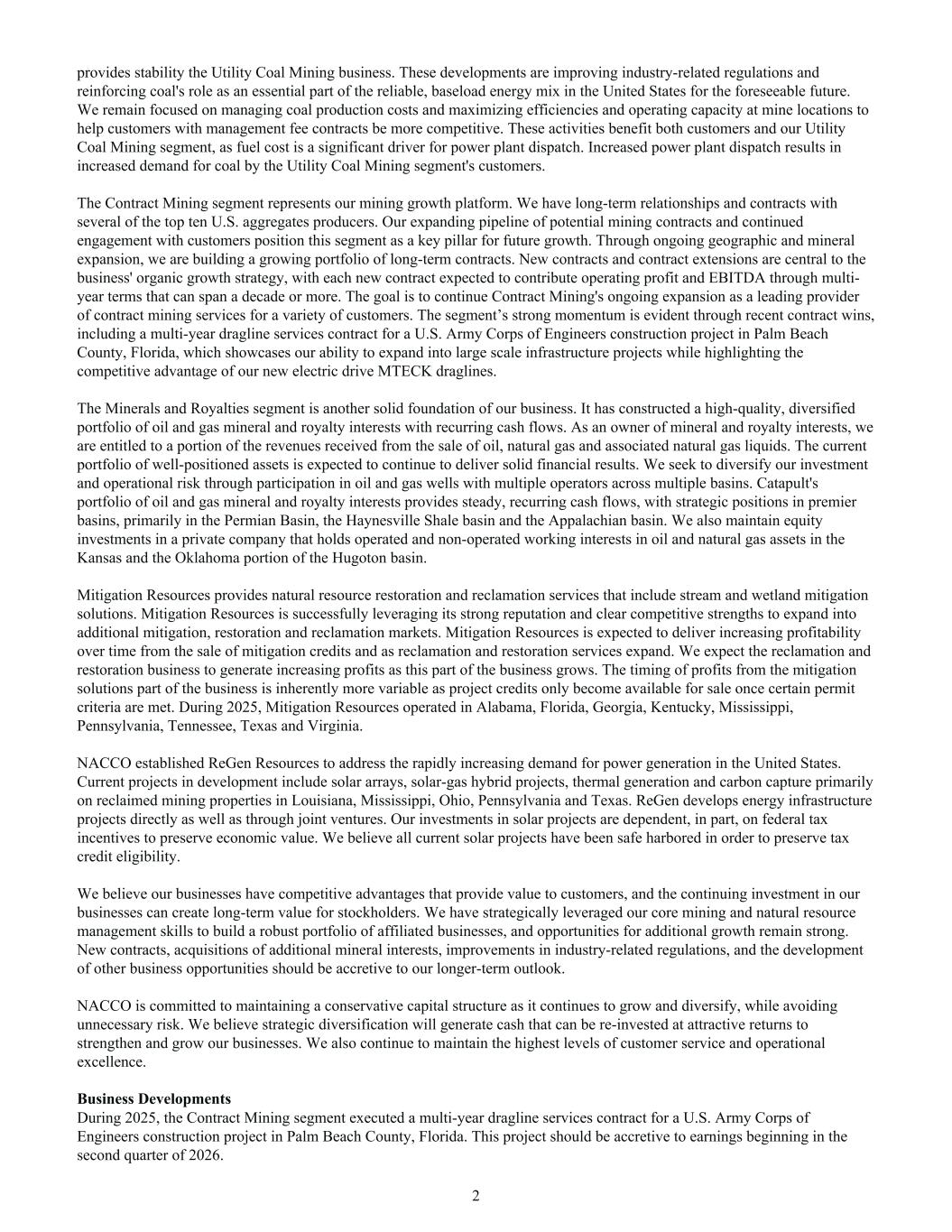 provides stability the Utility Coal Mining business. These developments are improving industry-related regulations and reinforcing coal's role as an essential part of the reliable, baseload energy mix in the United States for the foreseeable future. We remain focused on managing coal production costs and maximizing efficiencies and operating capacity at mine locations to help customers with management fee contracts be more competitive. These activities benefit both customers and our Utility Coal Mining segment, as fuel cost is a significant driver for power plant dispatch. Increased power plant dispatch results in increased demand for coal by the Utility Coal Mining segment's customers. The Contract Mining segment represents our mining growth platform. We have long-term relationships and contracts with several of the top ten U.S. aggregates producers. Our expanding pipeline of potential mining contracts and continued engagement with customers position this segment as a key pillar for future growth. Through ongoing geographic and mineral expansion, we are building a growing portfolio of long-term contracts. New contracts and contract extensions are central to the business' organic growth strategy, with each new contract expected to contribute operating profit and EBITDA through multi- year terms that can span a decade or more. The goal is to continue Contract Mining's ongoing expansion as a leading provider of contract mining services for a variety of customers. The segment’s strong momentum is evident through recent contract wins, including a multi-year dragline services contract for a U.S. Army Corps of Engineers construction project in Palm Beach County, Florida, which showcases our ability to expand into large scale infrastructure projects while highlighting the competitive advantage of our new electric drive MTECK draglines. The Minerals and Royalties segment is another solid foundation of our business. It has constructed a high-quality, diversified portfolio of oil and gas mineral and royalty interests with recurring cash flows. As an owner of mineral and royalty interests, we are entitled to a portion of the revenues received from the sale of oil, natural gas and associated natural gas liquids. The current portfolio of well-positioned assets is expected to continue to deliver solid financial results. We seek to diversify our investment and operational risk through participation in oil and gas wells with multiple operators across multiple basins. Catapult's portfolio of oil and gas mineral and royalty interests provides steady, recurring cash flows, with strategic positions in premier basins, primarily in the Permian Basin, the Haynesville Shale basin and the Appalachian basin. We also maintain equity investments in a private company that holds operated and non-operated working interests in oil and natural gas assets in the Kansas and the Oklahoma portion of the Hugoton basin. Mitigation Resources provides natural resource restoration and reclamation services that include stream and wetland mitigation solutions. Mitigation Resources is successfully leveraging its strong reputation and clear competitive strengths to expand into additional mitigation, restoration and reclamation markets. Mitigation Resources is expected to deliver increasing profitability over time from the sale of mitigation credits and as reclamation and restoration services expand. We expect the reclamation and restoration business to generate increasing profits as this part of the business grows. The timing of profits from the mitigation solutions part of the business is inherently more variable as project credits only become available for sale once certain permit criteria are met. During 2025, Mitigation Resources operated in Alabama, Florida, Georgia, Kentucky, Mississippi, Pennsylvania, Tennessee, Texas and Virginia. NACCO established ReGen Resources to address the rapidly increasing demand for power generation in the United States. Current projects in development include solar arrays, solar-gas hybrid projects, thermal generation and carbon capture primarily on reclaimed mining properties in Louisiana, Mississippi, Ohio, Pennsylvania and Texas. ReGen develops energy infrastructure projects directly as well as through joint ventures. Our investments in solar projects are dependent, in part, on federal tax incentives to preserve economic value. We believe all current solar projects have been safe harbored in order to preserve tax credit eligibility. We believe our businesses have competitive advantages that provide value to customers, and the continuing investment in our businesses can create long-term value for stockholders. We have strategically leveraged our core mining and natural resource management skills to build a robust portfolio of affiliated businesses, and opportunities for additional growth remain strong. New contracts, acquisitions of additional mineral interests, improvements in industry-related regulations, and the development of other business opportunities should be accretive to our longer-term outlook. NACCO is committed to maintaining a conservative capital structure as it continues to grow and diversify, while avoiding unnecessary risk. We believe strategic diversification will generate cash that can be re-invested at attractive returns to strengthen and grow our businesses. We also continue to maintain the highest levels of customer service and operational excellence. Business Developments During 2025, the Contract Mining segment executed a multi-year dragline services contract for a U.S. Army Corps of Engineers construction project in Palm Beach County, Florida. This project should be accretive to earnings beginning in the second quarter of 2026. 2