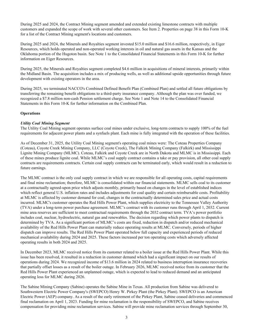 During 2025 and 2024, the Contract Mining segment amended and extended existing limestone contracts with multiple customers and expanded the scope of work with several other customers. See Item 2. Properties on page 38 in this Form 10-K for a list of the Contract Mining segment's locations and customers. During 2025 and 2024, the Minerals and Royalties segment invested $15.0 million and $16.6 million, respectively, in Eiger Resources, which holds operated and non-operated working interests in oil and natural gas assets in the Kansas and the Oklahoma portion of the Hugoton basin. See Note 1 to the Consolidated Financial Statements in this Form 10-K for further information on Eiger Resources. During 2025, the Minerals and Royalties segment completed $4.6 million in acquisitions of mineral interests, primarily within the Midland Basin. The acquisition includes a mix of producing wells, as well as additional upside opportunities through future development with existing operators in the area. During 2025, we terminated NACCO's Combined Defined Benefit Plan (Combined Plan) and settled all future obligations by transferring the remaining benefit obligations to a third-party insurance company. Although the plan was over funded, we recognized a $7.8 million non-cash Pension settlement charge. See Note 1 and Note 14 to the Consolidated Financial Statements in this Form 10-K for further information on the Combined Plan. Operations Utility Coal Mining Segment The Utility Coal Mining segment operates surface coal mines under exclusive, long-term contracts to supply 100% of the fuel requirements for adjacent power plants and a synfuels plant. Each mine is fully integrated with the operation of these facilities. As of December 31, 2025, the Utility Coal Mining segment's operating coal mines were: The Coteau Properties Company (Coteau), Coyote Creek Mining Company, LLC (Coyote Creek), The Falkirk Mining Company (Falkirk) and Mississippi Lignite Mining Company (MLMC). Coteau, Falkirk and Coyote Creek are in North Dakota and MLMC is in Mississippi. Each of these mines produce lignite coal. While MLMC’s coal supply contract contains a take or pay provision, all other coal supply contracts are requirements contracts. Certain coal supply contracts can be terminated early, which would result in a reduction to future earnings. The MLMC contract is the only coal supply contract in which we are responsible for all operating costs, capital requirements and final mine reclamation; therefore, MLMC is consolidated within our financial statements. MLMC sells coal to its customer at a contractually agreed-upon price which adjusts monthly, primarily based on changes in the level of established indices which reflect general U.S. inflation rates and includes adjustments for coal quality and certain reimbursable costs. Profitability at MLMC is affected by customer demand for coal, changes in the contractually determined sales price and actual costs incurred. MLMC's customer operates the Red Hills Power Plant, which supplies electricity to the Tennessee Valley Authority (TVA) under a long-term power purchase agreement. MLMC’s contract with its customer runs through April 1, 2032. Current mine area reserves are sufficient to meet contractual requirements through the 2032 contract term. TVA’s power portfolio includes coal, nuclear, hydroelectric, natural gas and renewables. The decision regarding which power plants to dispatch is determined by TVA. As a significant portion of MLMC’s costs are fixed, reduction in dispatch and/or reduced mechanical availability of the Red Hills Power Plant can materially reduce operating results at MLMC. Conversely, periods of higher dispatch can improve results. The Red Hills Power Plant operated below full capacity and experienced periods of reduced mechanical availability during 2024 and 2025. These factors increased per ton operating costs which adversely affected operating results in both 2024 and 2025. In December 2023, MLMC received notice from its customer related to a boiler issue at the Red Hills Power Plant. While this issue has been resolved, it resulted in a reduction in customer demand which had a significant impact on our results of operations during 2024. We recognized income of $13.6 million in 2024 related to business interruption insurance recoveries that partially offset losses as a result of the boiler outage. In February 2026, MLMC received notice from its customer that the Red Hills Power Plant experienced an unplanned outage, which is expected to lead to reduced demand and an anticipated operating loss for MLMC during 2026. The Sabine Mining Company (Sabine) operates the Sabine Mine in Texas. All production from Sabine was delivered to Southwestern Electric Power Company's (SWEPCO) Henry W. Pirkey Plant (the Pirkey Plant). SWEPCO is an American Electric Power (AEP) company. As a result of the early retirement of the Pirkey Plant, Sabine ceased deliveries and commenced final reclamation on April 1, 2023. Funding for mine reclamation is the responsibility of SWEPCO, and Sabine receives compensation for providing mine reclamation services. Sabine will provide mine reclamation services through September 30, 3