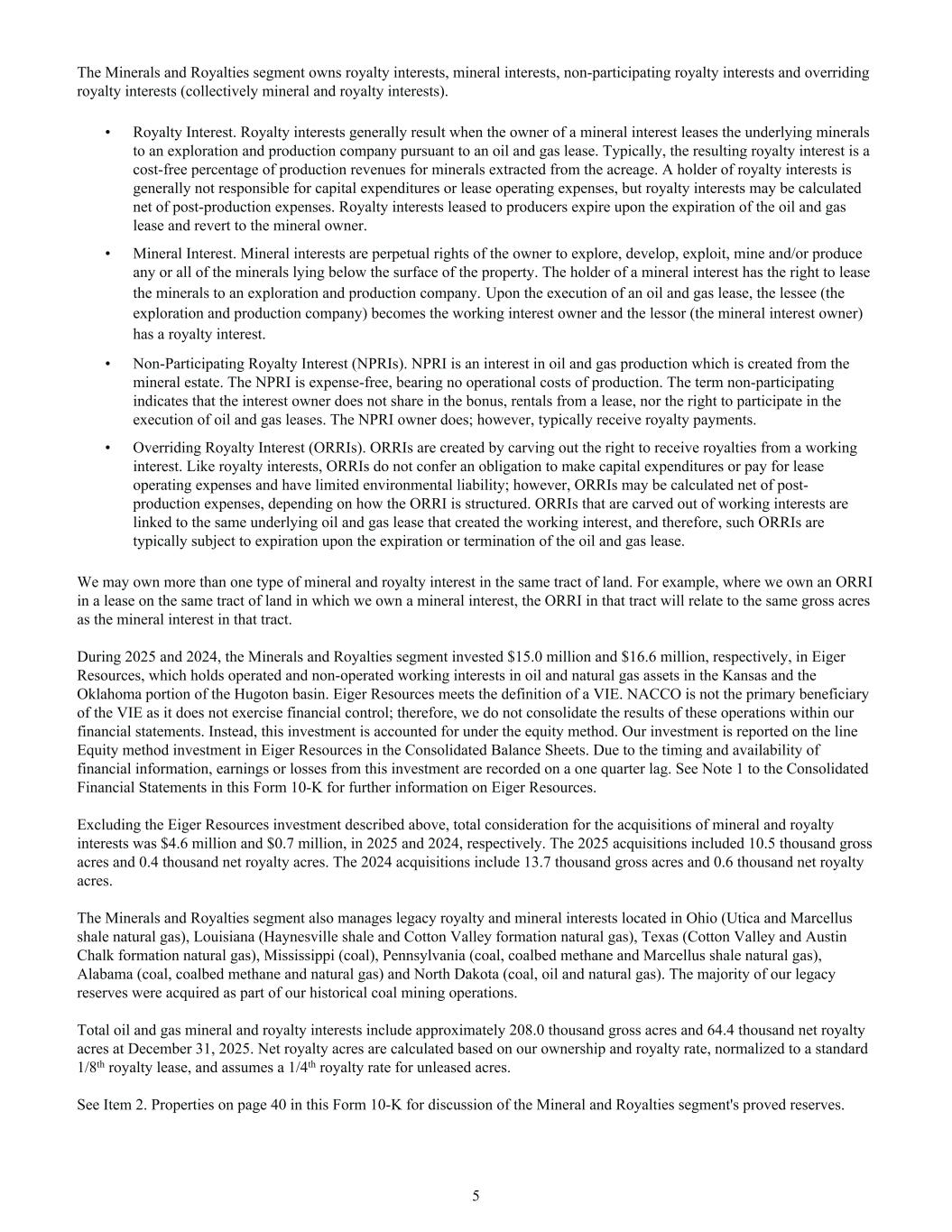The Minerals and Royalties segment owns royalty interests, mineral interests, non-participating royalty interests and overriding royalty interests (collectively mineral and royalty interests). • Royalty Interest. Royalty interests generally result when the owner of a mineral interest leases the underlying minerals to an exploration and production company pursuant to an oil and gas lease. Typically, the resulting royalty interest is a cost-free percentage of production revenues for minerals extracted from the acreage. A holder of royalty interests is generally not responsible for capital expenditures or lease operating expenses, but royalty interests may be calculated net of post-production expenses. Royalty interests leased to producers expire upon the expiration of the oil and gas lease and revert to the mineral owner. • Mineral Interest. Mineral interests are perpetual rights of the owner to explore, develop, exploit, mine and/or produce any or all of the minerals lying below the surface of the property. The holder of a mineral interest has the right to lease the minerals to an exploration and production company. Upon the execution of an oil and gas lease, the lessee (the exploration and production company) becomes the working interest owner and the lessor (the mineral interest owner) has a royalty interest. • Non-Participating Royalty Interest (NPRIs). NPRI is an interest in oil and gas production which is created from the mineral estate. The NPRI is expense-free, bearing no operational costs of production. The term non-participating indicates that the interest owner does not share in the bonus, rentals from a lease, nor the right to participate in the execution of oil and gas leases. The NPRI owner does; however, typically receive royalty payments. • Overriding Royalty Interest (ORRIs). ORRIs are created by carving out the right to receive royalties from a working interest. Like royalty interests, ORRIs do not confer an obligation to make capital expenditures or pay for lease operating expenses and have limited environmental liability; however, ORRIs may be calculated net of post- production expenses, depending on how the ORRI is structured. ORRIs that are carved out of working interests are linked to the same underlying oil and gas lease that created the working interest, and therefore, such ORRIs are typically subject to expiration upon the expiration or termination of the oil and gas lease. We may own more than one type of mineral and royalty interest in the same tract of land. For example, where we own an ORRI in a lease on the same tract of land in which we own a mineral interest, the ORRI in that tract will relate to the same gross acres as the mineral interest in that tract. During 2025 and 2024, the Minerals and Royalties segment invested $15.0 million and $16.6 million, respectively, in Eiger Resources, which holds operated and non-operated working interests in oil and natural gas assets in the Kansas and the Oklahoma portion of the Hugoton basin. Eiger Resources meets the definition of a VIE. NACCO is not the primary beneficiary of the VIE as it does not exercise financial control; therefore, we do not consolidate the results of these operations within our financial statements. Instead, this investment is accounted for under the equity method. Our investment is reported on the line Equity method investment in Eiger Resources in the Consolidated Balance Sheets. Due to the timing and availability of financial information, earnings or losses from this investment are recorded on a one quarter lag. See Note 1 to the Consolidated Financial Statements in this Form 10-K for further information on Eiger Resources. Excluding the Eiger Resources investment described above, total consideration for the acquisitions of mineral and royalty interests was $4.6 million and $0.7 million, in 2025 and 2024, respectively. The 2025 acquisitions included 10.5 thousand gross acres and 0.4 thousand net royalty acres. The 2024 acquisitions include 13.7 thousand gross acres and 0.6 thousand net royalty acres. The Minerals and Royalties segment also manages legacy royalty and mineral interests located in Ohio (Utica and Marcellus shale natural gas), Louisiana (Haynesville shale and Cotton Valley formation natural gas), Texas (Cotton Valley and Austin Chalk formation natural gas), Mississippi (coal), Pennsylvania (coal, coalbed methane and Marcellus shale natural gas), Alabama (coal, coalbed methane and natural gas) and North Dakota (coal, oil and natural gas). The majority of our legacy reserves were acquired as part of our historical coal mining operations. Total oil and gas mineral and royalty interests include approximately 208.0 thousand gross acres and 64.4 thousand net royalty acres at December 31, 2025. Net royalty acres are calculated based on our ownership and royalty rate, normalized to a standard 1/8th royalty lease, and assumes a 1/4th royalty rate for unleased acres. See Item 2. Properties on page 40 in this Form 10-K for discussion of the Mineral and Royalties segment's proved reserves. 5