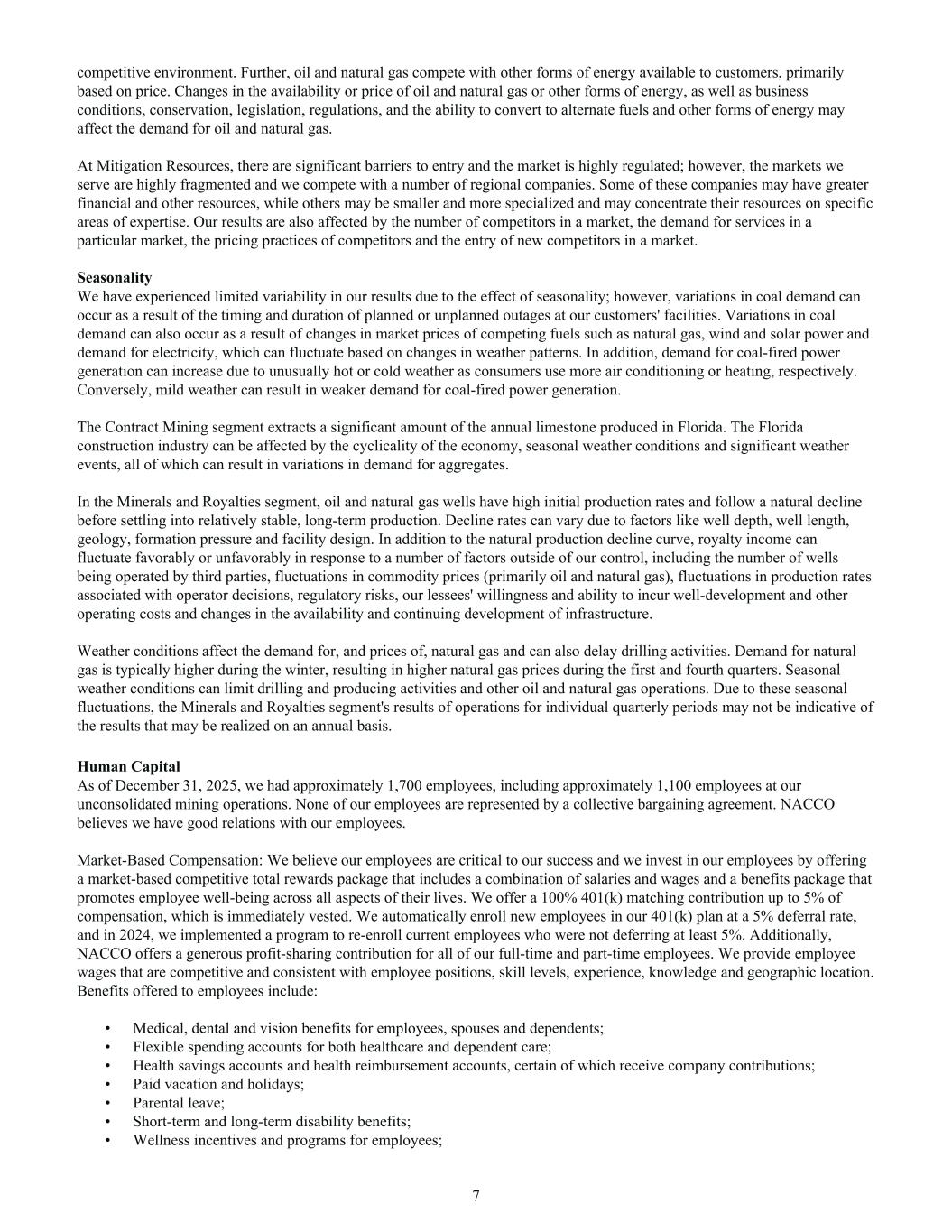 competitive environment. Further, oil and natural gas compete with other forms of energy available to customers, primarily based on price. Changes in the availability or price of oil and natural gas or other forms of energy, as well as business conditions, conservation, legislation, regulations, and the ability to convert to alternate fuels and other forms of energy may affect the demand for oil and natural gas. At Mitigation Resources, there are significant barriers to entry and the market is highly regulated; however, the markets we serve are highly fragmented and we compete with a number of regional companies. Some of these companies may have greater financial and other resources, while others may be smaller and more specialized and may concentrate their resources on specific areas of expertise. Our results are also affected by the number of competitors in a market, the demand for services in a particular market, the pricing practices of competitors and the entry of new competitors in a market. Seasonality We have experienced limited variability in our results due to the effect of seasonality; however, variations in coal demand can occur as a result of the timing and duration of planned or unplanned outages at our customers' facilities. Variations in coal demand can also occur as a result of changes in market prices of competing fuels such as natural gas, wind and solar power and demand for electricity, which can fluctuate based on changes in weather patterns. In addition, demand for coal-fired power generation can increase due to unusually hot or cold weather as consumers use more air conditioning or heating, respectively. Conversely, mild weather can result in weaker demand for coal-fired power generation. The Contract Mining segment extracts a significant amount of the annual limestone produced in Florida. The Florida construction industry can be affected by the cyclicality of the economy, seasonal weather conditions and significant weather events, all of which can result in variations in demand for aggregates. In the Minerals and Royalties segment, oil and natural gas wells have high initial production rates and follow a natural decline before settling into relatively stable, long-term production. Decline rates can vary due to factors like well depth, well length, geology, formation pressure and facility design. In addition to the natural production decline curve, royalty income can fluctuate favorably or unfavorably in response to a number of factors outside of our control, including the number of wells being operated by third parties, fluctuations in commodity prices (primarily oil and natural gas), fluctuations in production rates associated with operator decisions, regulatory risks, our lessees' willingness and ability to incur well-development and other operating costs and changes in the availability and continuing development of infrastructure. Weather conditions affect the demand for, and prices of, natural gas and can also delay drilling activities. Demand for natural gas is typically higher during the winter, resulting in higher natural gas prices during the first and fourth quarters. Seasonal weather conditions can limit drilling and producing activities and other oil and natural gas operations. Due to these seasonal fluctuations, the Minerals and Royalties segment's results of operations for individual quarterly periods may not be indicative of the results that may be realized on an annual basis. Human Capital As of December 31, 2025, we had approximately 1,700 employees, including approximately 1,100 employees at our unconsolidated mining operations. None of our employees are represented by a collective bargaining agreement. NACCO believes we have good relations with our employees. Market-Based Compensation: We believe our employees are critical to our success and we invest in our employees by offering a market-based competitive total rewards package that includes a combination of salaries and wages and a benefits package that promotes employee well-being across all aspects of their lives. We offer a 100% 401(k) matching contribution up to 5% of compensation, which is immediately vested. We automatically enroll new employees in our 401(k) plan at a 5% deferral rate, and in 2024, we implemented a program to re-enroll current employees who were not deferring at least 5%. Additionally, NACCO offers a generous profit-sharing contribution for all of our full-time and part-time employees. We provide employee wages that are competitive and consistent with employee positions, skill levels, experience, knowledge and geographic location. Benefits offered to employees include: • Medical, dental and vision benefits for employees, spouses and dependents; • Flexible spending accounts for both healthcare and dependent care; • Health savings accounts and health reimbursement accounts, certain of which receive company contributions; • Paid vacation and holidays; • Parental leave; • Short-term and long-term disability benefits; • Wellness incentives and programs for employees; 7