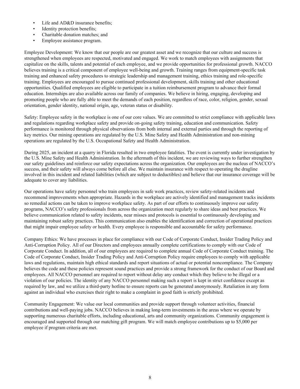 • Life and AD&D insurance benefits; • Identity protection benefits; • Charitable donation matches; and • Employee assistance program. Employee Development: We know that our people are our greatest asset and we recognize that our culture and success is strengthened when employees are respected, motivated and engaged. We work to match employees with assignments that capitalize on the skills, talents and potential of each employee, and we provide opportunities for professional growth. NACCO believes training is a critical component of employee well-being and growth. Training ranges from equipment-specific task training and enhanced safety procedures to strategic leadership and management training, ethics training and role-specific training. Employees are encouraged to pursue continued professional development, skills training and other educational opportunities. Qualified employees are eligible to participate in a tuition reimbursement program to advance their formal education. Internships are also available across our family of companies. We believe in hiring, engaging, developing and promoting people who are fully able to meet the demands of each position, regardless of race, color, religion, gender, sexual orientation, gender identity, national origin, age, veteran status or disability. Safety: Employee safety in the workplace is one of our core values. We are committed to strict compliance with applicable laws and regulations regarding workplace safety and provide on-going safety training, education and communication. Safety performance is monitored through physical observations from both internal and external parties and through the reporting of key metrics. Our mining operations are regulated by the U.S. Mine Safety and Health Administration and non-mining operations are regulated by the U.S. Occupational Safety and Health Administration. During 2025, an incident at a quarry in Florida resulted in two employee fatalities. The event is currently under investigation by the U.S. Mine Safety and Health Administration. In the aftermath of this incident, we are reviewing ways to further strengthen our safety guidelines and reinforce our safety expectations across the organization. Our employees are the nucleus of NACCO’s success, and their safety will always come before all else. We maintain insurance with respect to operating the dragline involved in this incident and related liabilities (which are subject to deductibles) and believe that our insurance coverage will be adequate to cover any liabilities. Our operations have safety personnel who train employees in safe work practices, review safety-related incidents and recommend improvements when appropriate. Hazards in the workplace are actively identified and management tracks incidents so remedial actions can be taken to improve workplace safety. As part of our efforts to continuously improve our safety programs, NACCO’s safety professionals from across the organization meet regularly to share ideas and best practices. We believe communication related to safety incidents, near misses and protocols is essential to continuously developing and maintaining robust safety practices. This communication also enables the identification and correction of operational practices that might impair employee safety or health. Every employee is responsible and accountable for safety performance. Company Ethics: We have processes in place for compliance with our Code of Corporate Conduct, Insider Trading Policy and Anti-Corruption Policy. All of our Directors and employees annually complete certifications to comply with our Code of Corporate Conduct. In addition, all of our employees are required to complete annual Code of Corporate Conduct training. The Code of Corporate Conduct, Insider Trading Policy and Anti-Corruption Policy require employees to comply with applicable laws and regulations, maintain high ethical standards and report situations of actual or potential noncompliance. The Company believes the code and these policies represent sound practices and provide a strong framework for the conduct of our Board and employees. All NACCO personnel are required to report without delay any conduct which they believe to be illegal or a violation of our policies. The identity of any NACCO personnel making such a report is kept in strict confidence except as required by law, and we utilize a third-party hotline to ensure reports can be generated anonymously. Retaliation in any form against an individual who exercises their right to make a complaint in good faith is strictly prohibited. Community Engagement: We value our local communities and provide support through volunteer activities, financial contributions and well-paying jobs. NACCO believes in making long-term investments in the areas where we operate by supporting numerous charitable efforts, including educational, arts and community organizations. Community engagement is encouraged and supported through our matching gift program. We will match employee contributions up to $5,000 per employee if program criteria are met. 8