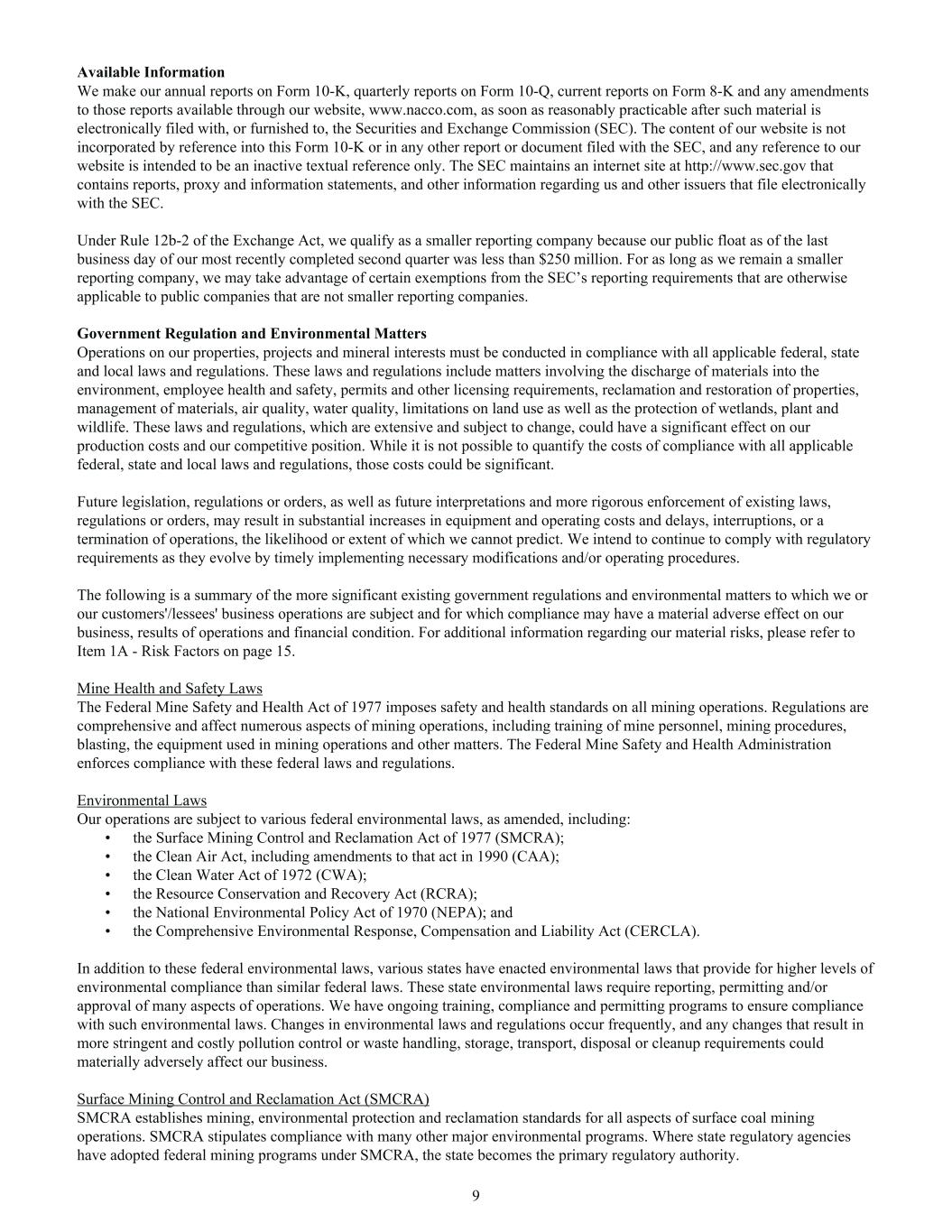 Available Information We make our annual reports on Form 10-K, quarterly reports on Form 10-Q, current reports on Form 8-K and any amendments to those reports available through our website, www.nacco.com, as soon as reasonably practicable after such material is electronically filed with, or furnished to, the Securities and Exchange Commission (SEC). The content of our website is not incorporated by reference into this Form 10-K or in any other report or document filed with the SEC, and any reference to our website is intended to be an inactive textual reference only. The SEC maintains an internet site at http://www.sec.gov that contains reports, proxy and information statements, and other information regarding us and other issuers that file electronically with the SEC. Under Rule 12b-2 of the Exchange Act, we qualify as a smaller reporting company because our public float as of the last business day of our most recently completed second quarter was less than $250 million. For as long as we remain a smaller reporting company, we may take advantage of certain exemptions from the SEC’s reporting requirements that are otherwise applicable to public companies that are not smaller reporting companies. Government Regulation and Environmental Matters Operations on our properties, projects and mineral interests must be conducted in compliance with all applicable federal, state and local laws and regulations. These laws and regulations include matters involving the discharge of materials into the environment, employee health and safety, permits and other licensing requirements, reclamation and restoration of properties, management of materials, air quality, water quality, limitations on land use as well as the protection of wetlands, plant and wildlife. These laws and regulations, which are extensive and subject to change, could have a significant effect on our production costs and our competitive position. While it is not possible to quantify the costs of compliance with all applicable federal, state and local laws and regulations, those costs could be significant. Future legislation, regulations or orders, as well as future interpretations and more rigorous enforcement of existing laws, regulations or orders, may result in substantial increases in equipment and operating costs and delays, interruptions, or a termination of operations, the likelihood or extent of which we cannot predict. We intend to continue to comply with regulatory requirements as they evolve by timely implementing necessary modifications and/or operating procedures. The following is a summary of the more significant existing government regulations and environmental matters to which we or our customers'/lessees' business operations are subject and for which compliance may have a material adverse effect on our business, results of operations and financial condition. For additional information regarding our material risks, please refer to Item 1A - Risk Factors on page 15. Mine Health and Safety Laws The Federal Mine Safety and Health Act of 1977 imposes safety and health standards on all mining operations. Regulations are comprehensive and affect numerous aspects of mining operations, including training of mine personnel, mining procedures, blasting, the equipment used in mining operations and other matters. The Federal Mine Safety and Health Administration enforces compliance with these federal laws and regulations. Environmental Laws Our operations are subject to various federal environmental laws, as amended, including: • the Surface Mining Control and Reclamation Act of 1977 (SMCRA); • the Clean Air Act, including amendments to that act in 1990 (CAA); • the Clean Water Act of 1972 (CWA); • the Resource Conservation and Recovery Act (RCRA); • the National Environmental Policy Act of 1970 (NEPA); and • the Comprehensive Environmental Response, Compensation and Liability Act (CERCLA). In addition to these federal environmental laws, various states have enacted environmental laws that provide for higher levels of environmental compliance than similar federal laws. These state environmental laws require reporting, permitting and/or approval of many aspects of operations. We have ongoing training, compliance and permitting programs to ensure compliance with such environmental laws. Changes in environmental laws and regulations occur frequently, and any changes that result in more stringent and costly pollution control or waste handling, storage, transport, disposal or cleanup requirements could materially adversely affect our business. Surface Mining Control and Reclamation Act (SMCRA) SMCRA establishes mining, environmental protection and reclamation standards for all aspects of surface coal mining operations. SMCRA stipulates compliance with many other major environmental programs. Where state regulatory agencies have adopted federal mining programs under SMCRA, the state becomes the primary regulatory authority. 9