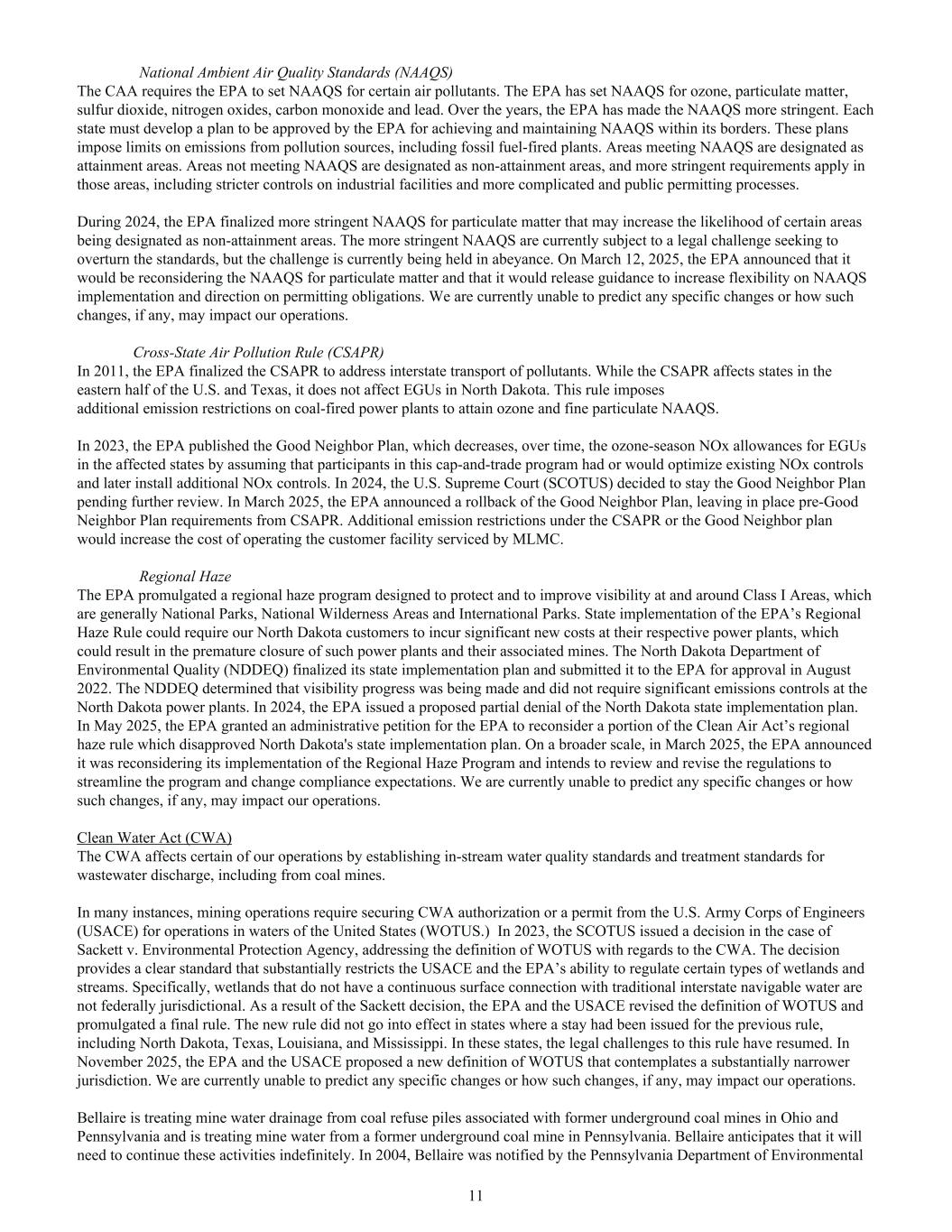 National Ambient Air Quality Standards (NAAQS) The CAA requires the EPA to set NAAQS for certain air pollutants. The EPA has set NAAQS for ozone, particulate matter, sulfur dioxide, nitrogen oxides, carbon monoxide and lead. Over the years, the EPA has made the NAAQS more stringent. Each state must develop a plan to be approved by the EPA for achieving and maintaining NAAQS within its borders. These plans impose limits on emissions from pollution sources, including fossil fuel-fired plants. Areas meeting NAAQS are designated as attainment areas. Areas not meeting NAAQS are designated as non-attainment areas, and more stringent requirements apply in those areas, including stricter controls on industrial facilities and more complicated and public permitting processes. During 2024, the EPA finalized more stringent NAAQS for particulate matter that may increase the likelihood of certain areas being designated as non-attainment areas. The more stringent NAAQS are currently subject to a legal challenge seeking to overturn the standards, but the challenge is currently being held in abeyance. On March 12, 2025, the EPA announced that it would be reconsidering the NAAQS for particulate matter and that it would release guidance to increase flexibility on NAAQS implementation and direction on permitting obligations. We are currently unable to predict any specific changes or how such changes, if any, may impact our operations. Cross-State Air Pollution Rule (CSAPR) In 2011, the EPA finalized the CSAPR to address interstate transport of pollutants. While the CSAPR affects states in the eastern half of the U.S. and Texas, it does not affect EGUs in North Dakota. This rule imposes additional emission restrictions on coal-fired power plants to attain ozone and fine particulate NAAQS. In 2023, the EPA published the Good Neighbor Plan, which decreases, over time, the ozone-season NOx allowances for EGUs in the affected states by assuming that participants in this cap-and-trade program had or would optimize existing NOx controls and later install additional NOx controls. In 2024, the U.S. Supreme Court (SCOTUS) decided to stay the Good Neighbor Plan pending further review. In March 2025, the EPA announced a rollback of the Good Neighbor Plan, leaving in place pre-Good Neighbor Plan requirements from CSAPR. Additional emission restrictions under the CSAPR or the Good Neighbor plan would increase the cost of operating the customer facility serviced by MLMC. Regional Haze The EPA promulgated a regional haze program designed to protect and to improve visibility at and around Class I Areas, which are generally National Parks, National Wilderness Areas and International Parks. State implementation of the EPA’s Regional Haze Rule could require our North Dakota customers to incur significant new costs at their respective power plants, which could result in the premature closure of such power plants and their associated mines. The North Dakota Department of Environmental Quality (NDDEQ) finalized its state implementation plan and submitted it to the EPA for approval in August 2022. The NDDEQ determined that visibility progress was being made and did not require significant emissions controls at the North Dakota power plants. In 2024, the EPA issued a proposed partial denial of the North Dakota state implementation plan. In May 2025, the EPA granted an administrative petition for the EPA to reconsider a portion of the Clean Air Act’s regional haze rule which disapproved North Dakota's state implementation plan. On a broader scale, in March 2025, the EPA announced it was reconsidering its implementation of the Regional Haze Program and intends to review and revise the regulations to streamline the program and change compliance expectations. We are currently unable to predict any specific changes or how such changes, if any, may impact our operations. Clean Water Act (CWA) The CWA affects certain of our operations by establishing in-stream water quality standards and treatment standards for wastewater discharge, including from coal mines. In many instances, mining operations require securing CWA authorization or a permit from the U.S. Army Corps of Engineers (USACE) for operations in waters of the United States (WOTUS.) In 2023, the SCOTUS issued a decision in the case of Sackett v. Environmental Protection Agency, addressing the definition of WOTUS with regards to the CWA. The decision provides a clear standard that substantially restricts the USACE and the EPA’s ability to regulate certain types of wetlands and streams. Specifically, wetlands that do not have a continuous surface connection with traditional interstate navigable water are not federally jurisdictional. As a result of the Sackett decision, the EPA and the USACE revised the definition of WOTUS and promulgated a final rule. The new rule did not go into effect in states where a stay had been issued for the previous rule, including North Dakota, Texas, Louisiana, and Mississippi. In these states, the legal challenges to this rule have resumed. In November 2025, the EPA and the USACE proposed a new definition of WOTUS that contemplates a substantially narrower jurisdiction. We are currently unable to predict any specific changes or how such changes, if any, may impact our operations. Bellaire is treating mine water drainage from coal refuse piles associated with former underground coal mines in Ohio and Pennsylvania and is treating mine water from a former underground coal mine in Pennsylvania. Bellaire anticipates that it will need to continue these activities indefinitely. In 2004, Bellaire was notified by the Pennsylvania Department of Environmental 11