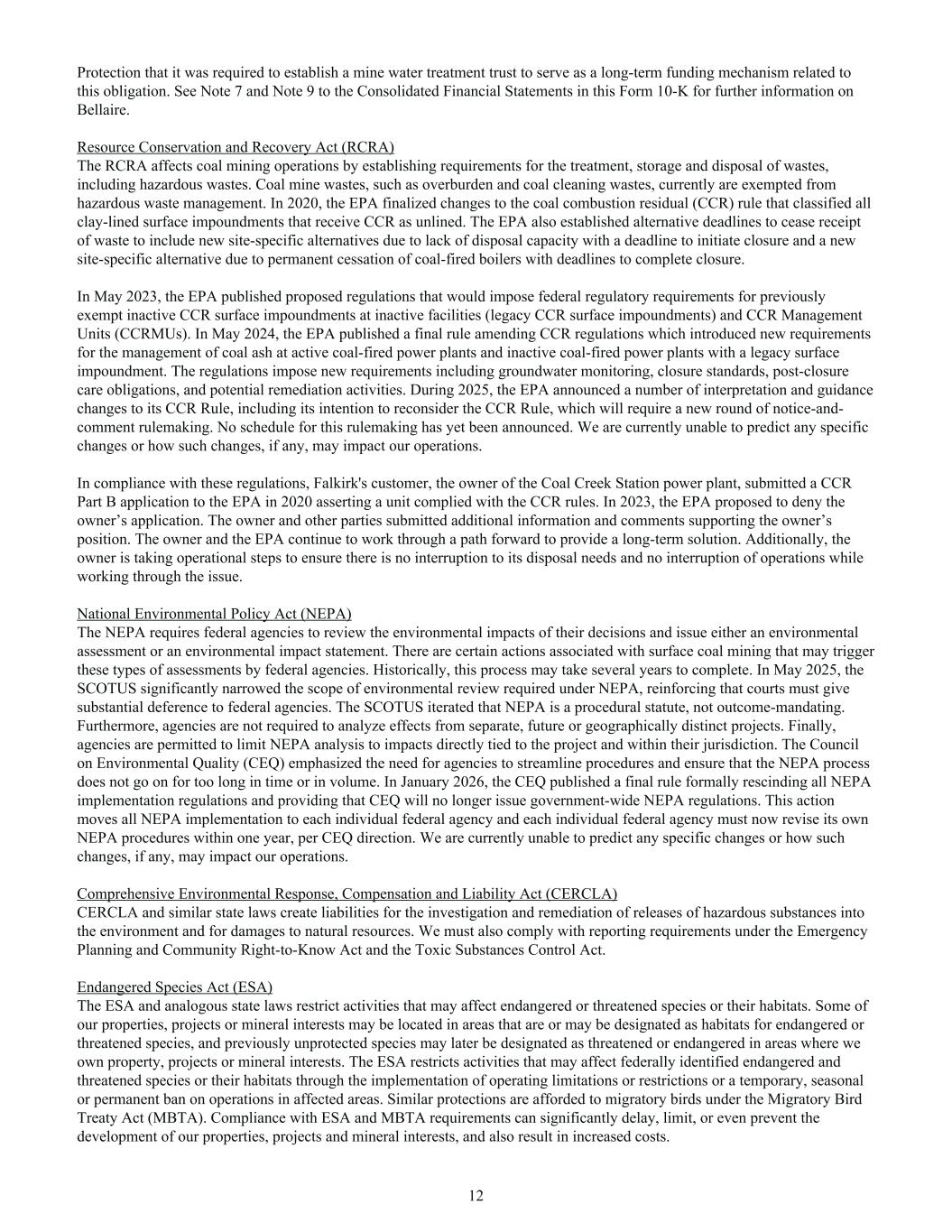 Protection that it was required to establish a mine water treatment trust to serve as a long-term funding mechanism related to this obligation. See Note 7 and Note 9 to the Consolidated Financial Statements in this Form 10-K for further information on Bellaire. Resource Conservation and Recovery Act (RCRA) The RCRA affects coal mining operations by establishing requirements for the treatment, storage and disposal of wastes, including hazardous wastes. Coal mine wastes, such as overburden and coal cleaning wastes, currently are exempted from hazardous waste management. In 2020, the EPA finalized changes to the coal combustion residual (CCR) rule that classified all clay-lined surface impoundments that receive CCR as unlined. The EPA also established alternative deadlines to cease receipt of waste to include new site-specific alternatives due to lack of disposal capacity with a deadline to initiate closure and a new site-specific alternative due to permanent cessation of coal-fired boilers with deadlines to complete closure. In May 2023, the EPA published proposed regulations that would impose federal regulatory requirements for previously exempt inactive CCR surface impoundments at inactive facilities (legacy CCR surface impoundments) and CCR Management Units (CCRMUs). In May 2024, the EPA published a final rule amending CCR regulations which introduced new requirements for the management of coal ash at active coal-fired power plants and inactive coal-fired power plants with a legacy surface impoundment. The regulations impose new requirements including groundwater monitoring, closure standards, post-closure care obligations, and potential remediation activities. During 2025, the EPA announced a number of interpretation and guidance changes to its CCR Rule, including its intention to reconsider the CCR Rule, which will require a new round of notice-and- comment rulemaking. No schedule for this rulemaking has yet been announced. We are currently unable to predict any specific changes or how such changes, if any, may impact our operations. In compliance with these regulations, Falkirk's customer, the owner of the Coal Creek Station power plant, submitted a CCR Part B application to the EPA in 2020 asserting a unit complied with the CCR rules. In 2023, the EPA proposed to deny the owner’s application. The owner and other parties submitted additional information and comments supporting the owner’s position. The owner and the EPA continue to work through a path forward to provide a long-term solution. Additionally, the owner is taking operational steps to ensure there is no interruption to its disposal needs and no interruption of operations while working through the issue. National Environmental Policy Act (NEPA) The NEPA requires federal agencies to review the environmental impacts of their decisions and issue either an environmental assessment or an environmental impact statement. There are certain actions associated with surface coal mining that may trigger these types of assessments by federal agencies. Historically, this process may take several years to complete. In May 2025, the SCOTUS significantly narrowed the scope of environmental review required under NEPA, reinforcing that courts must give substantial deference to federal agencies. The SCOTUS iterated that NEPA is a procedural statute, not outcome-mandating. Furthermore, agencies are not required to analyze effects from separate, future or geographically distinct projects. Finally, agencies are permitted to limit NEPA analysis to impacts directly tied to the project and within their jurisdiction. The Council on Environmental Quality (CEQ) emphasized the need for agencies to streamline procedures and ensure that the NEPA process does not go on for too long in time or in volume. In January 2026, the CEQ published a final rule formally rescinding all NEPA implementation regulations and providing that CEQ will no longer issue government-wide NEPA regulations. This action moves all NEPA implementation to each individual federal agency and each individual federal agency must now revise its own NEPA procedures within one year, per CEQ direction. We are currently unable to predict any specific changes or how such changes, if any, may impact our operations. Comprehensive Environmental Response, Compensation and Liability Act (CERCLA) CERCLA and similar state laws create liabilities for the investigation and remediation of releases of hazardous substances into the environment and for damages to natural resources. We must also comply with reporting requirements under the Emergency Planning and Community Right-to-Know Act and the Toxic Substances Control Act. Endangered Species Act (ESA) The ESA and analogous state laws restrict activities that may affect endangered or threatened species or their habitats. Some of our properties, projects or mineral interests may be located in areas that are or may be designated as habitats for endangered or threatened species, and previously unprotected species may later be designated as threatened or endangered in areas where we own property, projects or mineral interests. The ESA restricts activities that may affect federally identified endangered and threatened species or their habitats through the implementation of operating limitations or restrictions or a temporary, seasonal or permanent ban on operations in affected areas. Similar protections are afforded to migratory birds under the Migratory Bird Treaty Act (MBTA). Compliance with ESA and MBTA requirements can significantly delay, limit, or even prevent the development of our properties, projects and mineral interests, and also result in increased costs. 12