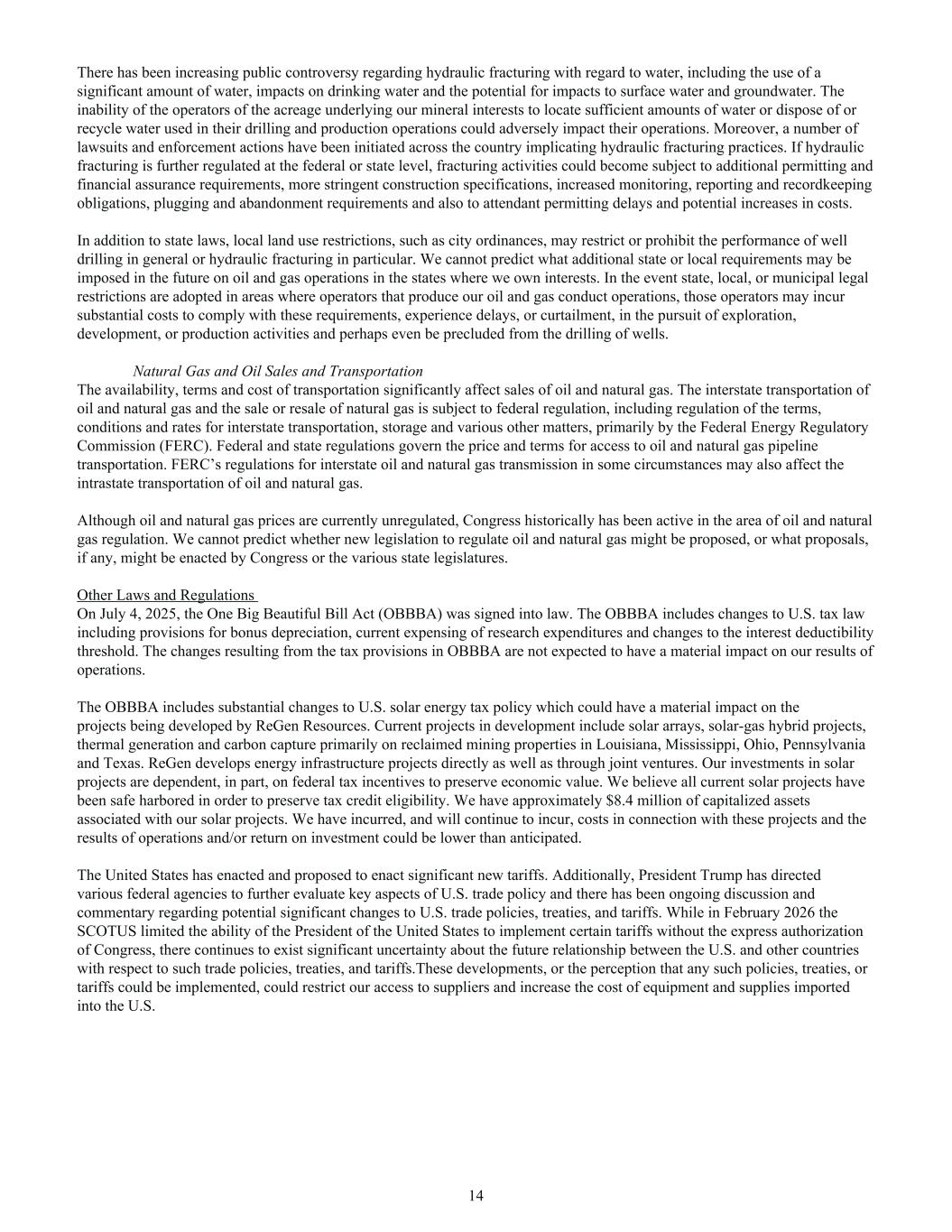 There has been increasing public controversy regarding hydraulic fracturing with regard to water, including the use of a significant amount of water, impacts on drinking water and the potential for impacts to surface water and groundwater. The inability of the operators of the acreage underlying our mineral interests to locate sufficient amounts of water or dispose of or recycle water used in their drilling and production operations could adversely impact their operations. Moreover, a number of lawsuits and enforcement actions have been initiated across the country implicating hydraulic fracturing practices. If hydraulic fracturing is further regulated at the federal or state level, fracturing activities could become subject to additional permitting and financial assurance requirements, more stringent construction specifications, increased monitoring, reporting and recordkeeping obligations, plugging and abandonment requirements and also to attendant permitting delays and potential increases in costs. In addition to state laws, local land use restrictions, such as city ordinances, may restrict or prohibit the performance of well drilling in general or hydraulic fracturing in particular. We cannot predict what additional state or local requirements may be imposed in the future on oil and gas operations in the states where we own interests. In the event state, local, or municipal legal restrictions are adopted in areas where operators that produce our oil and gas conduct operations, those operators may incur substantial costs to comply with these requirements, experience delays, or curtailment, in the pursuit of exploration, development, or production activities and perhaps even be precluded from the drilling of wells. Natural Gas and Oil Sales and Transportation The availability, terms and cost of transportation significantly affect sales of oil and natural gas. The interstate transportation of oil and natural gas and the sale or resale of natural gas is subject to federal regulation, including regulation of the terms, conditions and rates for interstate transportation, storage and various other matters, primarily by the Federal Energy Regulatory Commission (FERC). Federal and state regulations govern the price and terms for access to oil and natural gas pipeline transportation. FERC’s regulations for interstate oil and natural gas transmission in some circumstances may also affect the intrastate transportation of oil and natural gas. Although oil and natural gas prices are currently unregulated, Congress historically has been active in the area of oil and natural gas regulation. We cannot predict whether new legislation to regulate oil and natural gas might be proposed, or what proposals, if any, might be enacted by Congress or the various state legislatures. Other Laws and Regulations On July 4, 2025, the One Big Beautiful Bill Act (OBBBA) was signed into law. The OBBBA includes changes to U.S. tax law including provisions for bonus depreciation, current expensing of research expenditures and changes to the interest deductibility threshold. The changes resulting from the tax provisions in OBBBA are not expected to have a material impact on our results of operations. The OBBBA includes substantial changes to U.S. solar energy tax policy which could have a material impact on the projects being developed by ReGen Resources. Current projects in development include solar arrays, solar-gas hybrid projects, thermal generation and carbon capture primarily on reclaimed mining properties in Louisiana, Mississippi, Ohio, Pennsylvania and Texas. ReGen develops energy infrastructure projects directly as well as through joint ventures. Our investments in solar projects are dependent, in part, on federal tax incentives to preserve economic value. We believe all current solar projects have been safe harbored in order to preserve tax credit eligibility. We have approximately $8.4 million of capitalized assets associated with our solar projects. We have incurred, and will continue to incur, costs in connection with these projects and the results of operations and/or return on investment could be lower than anticipated. The United States has enacted and proposed to enact significant new tariffs. Additionally, President Trump has directed various federal agencies to further evaluate key aspects of U.S. trade policy and there has been ongoing discussion and commentary regarding potential significant changes to U.S. trade policies, treaties, and tariffs. While in February 2026 the SCOTUS limited the ability of the President of the United States to implement certain tariffs without the express authorization of Congress, there continues to exist significant uncertainty about the future relationship between the U.S. and other countries with respect to such trade policies, treaties, and tariffs.These developments, or the perception that any such policies, treaties, or tariffs could be implemented, could restrict our access to suppliers and increase the cost of equipment and supplies imported into the U.S. 14