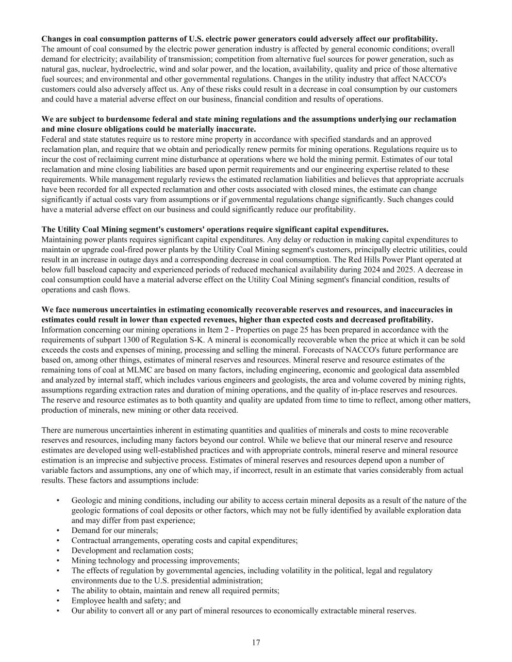 Changes in coal consumption patterns of U.S. electric power generators could adversely affect our profitability. The amount of coal consumed by the electric power generation industry is affected by general economic conditions; overall demand for electricity; availability of transmission; competition from alternative fuel sources for power generation, such as natural gas, nuclear, hydroelectric, wind and solar power, and the location, availability, quality and price of those alternative fuel sources; and environmental and other governmental regulations. Changes in the utility industry that affect NACCO's customers could also adversely affect us. Any of these risks could result in a decrease in coal consumption by our customers and could have a material adverse effect on our business, financial condition and results of operations. We are subject to burdensome federal and state mining regulations and the assumptions underlying our reclamation and mine closure obligations could be materially inaccurate. Federal and state statutes require us to restore mine property in accordance with specified standards and an approved reclamation plan, and require that we obtain and periodically renew permits for mining operations. Regulations require us to incur the cost of reclaiming current mine disturbance at operations where we hold the mining permit. Estimates of our total reclamation and mine closing liabilities are based upon permit requirements and our engineering expertise related to these requirements. While management regularly reviews the estimated reclamation liabilities and believes that appropriate accruals have been recorded for all expected reclamation and other costs associated with closed mines, the estimate can change significantly if actual costs vary from assumptions or if governmental regulations change significantly. Such changes could have a material adverse effect on our business and could significantly reduce our profitability. The Utility Coal Mining segment's customers' operations require significant capital expenditures. Maintaining power plants requires significant capital expenditures. Any delay or reduction in making capital expenditures to maintain or upgrade coal-fired power plants by the Utility Coal Mining segment's customers, principally electric utilities, could result in an increase in outage days and a corresponding decrease in coal consumption. The Red Hills Power Plant operated at below full baseload capacity and experienced periods of reduced mechanical availability during 2024 and 2025. A decrease in coal consumption could have a material adverse effect on the Utility Coal Mining segment's financial condition, results of operations and cash flows. We face numerous uncertainties in estimating economically recoverable reserves and resources, and inaccuracies in estimates could result in lower than expected revenues, higher than expected costs and decreased profitability. Information concerning our mining operations in Item 2 - Properties on page 25 has been prepared in accordance with the requirements of subpart 1300 of Regulation S-K. A mineral is economically recoverable when the price at which it can be sold exceeds the costs and expenses of mining, processing and selling the mineral. Forecasts of NACCO's future performance are based on, among other things, estimates of mineral reserves and resources. Mineral reserve and resource estimates of the remaining tons of coal at MLMC are based on many factors, including engineering, economic and geological data assembled and analyzed by internal staff, which includes various engineers and geologists, the area and volume covered by mining rights, assumptions regarding extraction rates and duration of mining operations, and the quality of in-place reserves and resources. The reserve and resource estimates as to both quantity and quality are updated from time to time to reflect, among other matters, production of minerals, new mining or other data received. There are numerous uncertainties inherent in estimating quantities and qualities of minerals and costs to mine recoverable reserves and resources, including many factors beyond our control. While we believe that our mineral reserve and resource estimates are developed using well-established practices and with appropriate controls, mineral reserve and mineral resource estimation is an imprecise and subjective process. Estimates of mineral reserves and resources depend upon a number of variable factors and assumptions, any one of which may, if incorrect, result in an estimate that varies considerably from actual results. These factors and assumptions include: • Geologic and mining conditions, including our ability to access certain mineral deposits as a result of the nature of the geologic formations of coal deposits or other factors, which may not be fully identified by available exploration data and may differ from past experience; • Demand for our minerals; • Contractual arrangements, operating costs and capital expenditures; • Development and reclamation costs; • Mining technology and processing improvements; • The effects of regulation by governmental agencies, including volatility in the political, legal and regulatory environments due to the U.S. presidential administration; • The ability to obtain, maintain and renew all required permits; • Employee health and safety; and • Our ability to convert all or any part of mineral resources to economically extractable mineral reserves. 17
