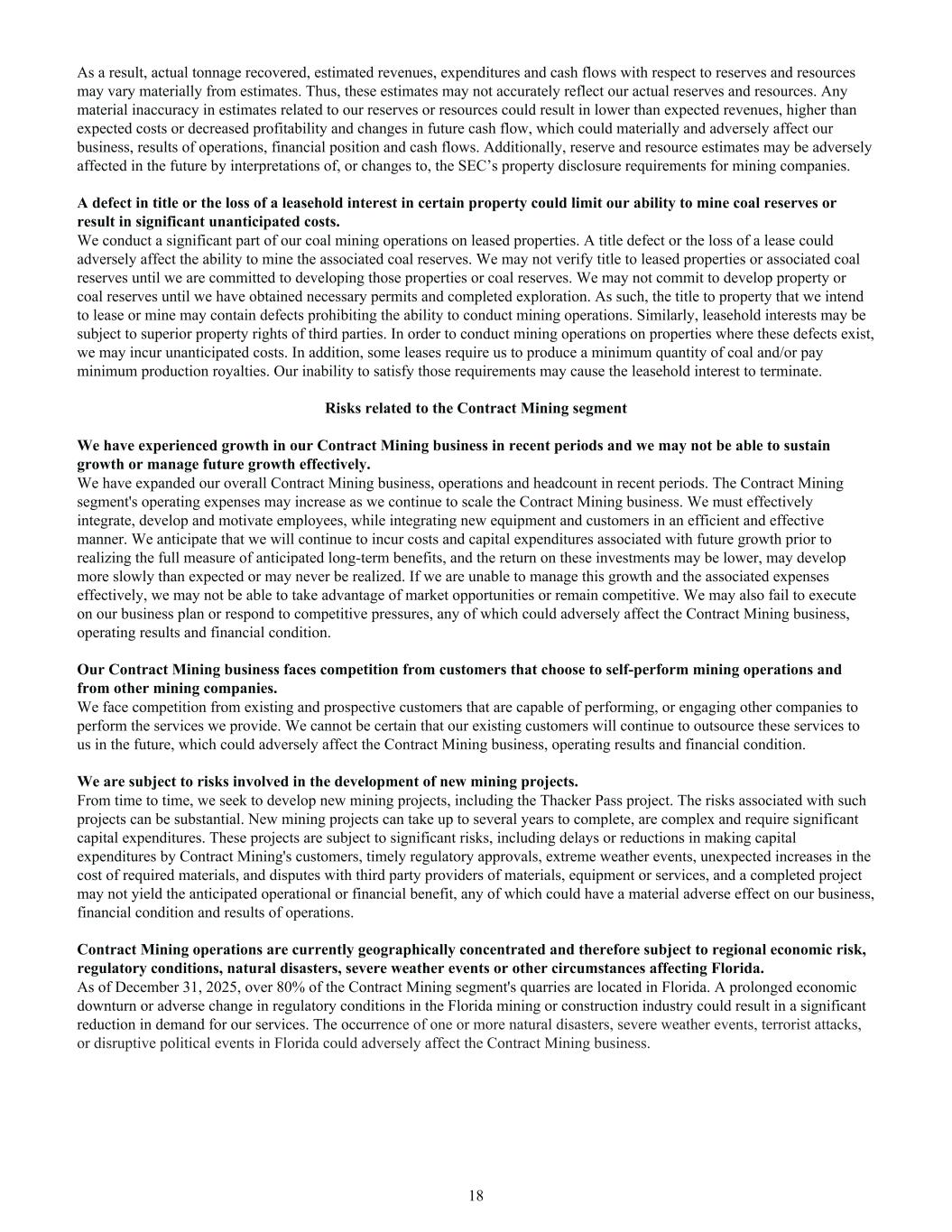 As a result, actual tonnage recovered, estimated revenues, expenditures and cash flows with respect to reserves and resources may vary materially from estimates. Thus, these estimates may not accurately reflect our actual reserves and resources. Any material inaccuracy in estimates related to our reserves or resources could result in lower than expected revenues, higher than expected costs or decreased profitability and changes in future cash flow, which could materially and adversely affect our business, results of operations, financial position and cash flows. Additionally, reserve and resource estimates may be adversely affected in the future by interpretations of, or changes to, the SEC’s property disclosure requirements for mining companies. A defect in title or the loss of a leasehold interest in certain property could limit our ability to mine coal reserves or result in significant unanticipated costs. We conduct a significant part of our coal mining operations on leased properties. A title defect or the loss of a lease could adversely affect the ability to mine the associated coal reserves. We may not verify title to leased properties or associated coal reserves until we are committed to developing those properties or coal reserves. We may not commit to develop property or coal reserves until we have obtained necessary permits and completed exploration. As such, the title to property that we intend to lease or mine may contain defects prohibiting the ability to conduct mining operations. Similarly, leasehold interests may be subject to superior property rights of third parties. In order to conduct mining operations on properties where these defects exist, we may incur unanticipated costs. In addition, some leases require us to produce a minimum quantity of coal and/or pay minimum production royalties. Our inability to satisfy those requirements may cause the leasehold interest to terminate. Risks related to the Contract Mining segment We have experienced growth in our Contract Mining business in recent periods and we may not be able to sustain growth or manage future growth effectively. We have expanded our overall Contract Mining business, operations and headcount in recent periods. The Contract Mining segment's operating expenses may increase as we continue to scale the Contract Mining business. We must effectively integrate, develop and motivate employees, while integrating new equipment and customers in an efficient and effective manner. We anticipate that we will continue to incur costs and capital expenditures associated with future growth prior to realizing the full measure of anticipated long-term benefits, and the return on these investments may be lower, may develop more slowly than expected or may never be realized. If we are unable to manage this growth and the associated expenses effectively, we may not be able to take advantage of market opportunities or remain competitive. We may also fail to execute on our business plan or respond to competitive pressures, any of which could adversely affect the Contract Mining business, operating results and financial condition. Our Contract Mining business faces competition from customers that choose to self-perform mining operations and from other mining companies. We face competition from existing and prospective customers that are capable of performing, or engaging other companies to perform the services we provide. We cannot be certain that our existing customers will continue to outsource these services to us in the future, which could adversely affect the Contract Mining business, operating results and financial condition. We are subject to risks involved in the development of new mining projects. From time to time, we seek to develop new mining projects, including the Thacker Pass project. The risks associated with such projects can be substantial. New mining projects can take up to several years to complete, are complex and require significant capital expenditures. These projects are subject to significant risks, including delays or reductions in making capital expenditures by Contract Mining's customers, timely regulatory approvals, extreme weather events, unexpected increases in the cost of required materials, and disputes with third party providers of materials, equipment or services, and a completed project may not yield the anticipated operational or financial benefit, any of which could have a material adverse effect on our business, financial condition and results of operations. Contract Mining operations are currently geographically concentrated and therefore subject to regional economic risk, regulatory conditions, natural disasters, severe weather events or other circumstances affecting Florida. As of December 31, 2025, over 80% of the Contract Mining segment's quarries are located in Florida. A prolonged economic downturn or adverse change in regulatory conditions in the Florida mining or construction industry could result in a significant reduction in demand for our services. The occurrence of one or more natural disasters, severe weather events, terrorist attacks, or disruptive political events in Florida could adversely affect the Contract Mining business. 18