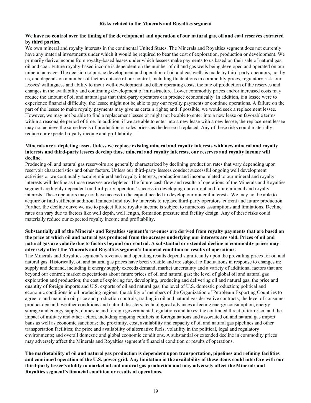 Risks related to the Minerals and Royalties segment We have no control over the timing of the development and operation of our natural gas, oil and coal reserves extracted by third parties. We own mineral and royalty interests in the continental United States. The Minerals and Royalties segment does not currently have any material investments under which it would be required to bear the cost of exploration, production or development. We primarily derive income from royalty-based leases under which lessees make payments to us based on their sale of natural gas, oil and coal. Future royalty-based income is dependent on the number of oil and gas wells being developed and operated on our mineral acreage. The decision to pursue development and operation of oil and gas wells is made by third-party operators, not by us, and depends on a number of factors outside of our control, including fluctuations in commodity prices, regulatory risk, our lessees' willingness and ability to incur well-development and other operating costs, the rate of production of the reserves and changes in the availability and continuing development of infrastructure. Lower commodity prices and/or increased costs may reduce the amount of oil and natural gas that third-party operators can produce economically. In addition, if a lessee were to experience financial difficulty, the lessee might not be able to pay our royalty payments or continue operations. A failure on the part of the lessee to make royalty payments may give us certain rights; and if possible, we would seek a replacement lessee. However, we may not be able to find a replacement lessee or might not be able to enter into a new lease on favorable terms within a reasonable period of time. In addition, if we are able to enter into a new lease with a new lessee, the replacement lessee may not achieve the same levels of production or sales prices as the lessee it replaced. Any of these risks could materially reduce our expected royalty income and profitability. Minerals are a depleting asset. Unless we replace existing mineral and royalty interests with new mineral and royalty interests and third-party lessees develop those mineral and royalty interests, our reserves and royalty income will decline. Producing oil and natural gas reservoirs are generally characterized by declining production rates that vary depending upon reservoir characteristics and other factors. Unless our third-party lessees conduct successful ongoing well development activities or we continually acquire mineral and royalty interests, production and income related to our mineral and royalty interests will decline as those reserves are depleted. The future cash flow and results of operations of the Minerals and Royalties segment are highly dependent on third-party operators’ success in developing our current and future mineral and royalty interests. These operators may not have access to the capital needed to develop our mineral interests. We may not be able to acquire or find sufficient additional mineral and royalty interests to replace third-party operators' current and future production. Further, the decline curve we use to project future royalty income is subject to numerous assumptions and limitations. Decline rates can vary due to factors like well depth, well length, formation pressure and facility design. Any of these risks could materially reduce our expected royalty income and profitability. Substantially all of the Minerals and Royalties segment’s revenues are derived from royalty payments that are based on the price at which oil and natural gas produced from the acreage underlying our interests are sold. Prices of oil and natural gas are volatile due to factors beyond our control. A substantial or extended decline in commodity prices may adversely affect the Minerals and Royalties segment’s financial condition or results of operations. The Minerals and Royalties segment’s revenues and operating results depend significantly upon the prevailing prices for oil and natural gas. Historically, oil and natural gas prices have been volatile and are subject to fluctuations in response to changes in: supply and demand, including if energy supply exceeds demand; market uncertainty and a variety of additional factors that are beyond our control; market expectations about future prices of oil and natural gas; the level of global oil and natural gas exploration and production; the cost of exploring for, developing, producing and delivering oil and natural gas; the price and quantity of foreign imports and U.S. exports of oil and natural gas; the level of U.S. domestic production; political and economic conditions in oil producing regions; the ability of members of the Organization of Petroleum Exporting Countries to agree to and maintain oil price and production controls; trading in oil and natural gas derivative contracts; the level of consumer product demand; weather conditions and natural disasters; technological advances affecting energy consumption, energy storage and energy supply; domestic and foreign governmental regulations and taxes; the continued threat of terrorism and the impact of military and other action, including ongoing conflicts in foreign nations and associated oil and natural gas import bans as well as economic sanctions; the proximity, cost, availability and capacity of oil and natural gas pipelines and other transportation facilities; the price and availability of alternative fuels; volatility in the political, legal and regulatory environments; and overall domestic and global economic conditions. A substantial or extended decline in commodity prices may adversely affect the Minerals and Royalties segment’s financial condition or results of operations. The marketability of oil and natural gas production is dependent upon transportation, pipelines and refining facilities and continued operation of the U.S. power grid. Any limitation in the availability of these it