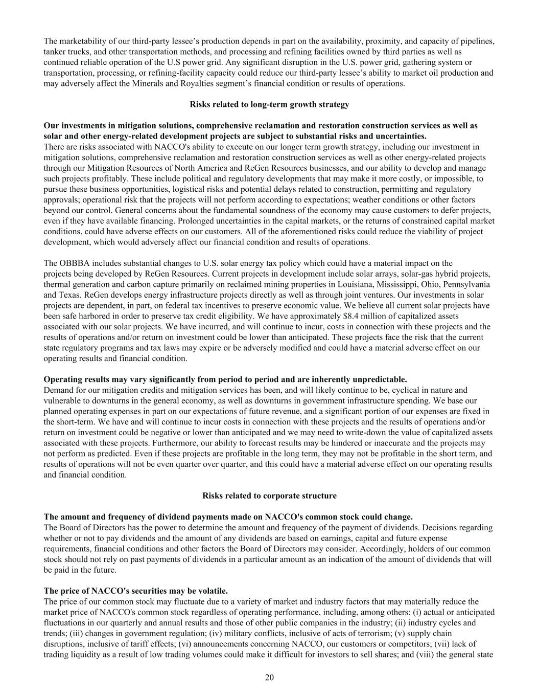 The marketability of our third-party lessee’s production depends in part on the availability, proximity, and capacity of pipelines, tanker trucks, and other transportation methods, and processing and refining facilities owned by third parties as well as continued reliable operation of the U.S power grid. Any significant disruption in the U.S. power grid, gathering system or transportation, processing, or refining-facility capacity could reduce our third-party lessee’s ability to market oil production and may adversely affect the Minerals and Royalties segment’s financial condition or results of operations. Risks related to long-term growth strategy Our investments in mitigation solutions, comprehensive reclamation and restoration construction services as well as solar and other energy-related development projects are subject to substantial risks and uncertainties. There are risks associated with NACCO's ability to execute on our longer term growth strategy, including our investment in mitigation solutions, comprehensive reclamation and restoration construction services as well as other energy-related projects through our Mitigation Resources of North America and ReGen Resources businesses, and our ability to develop and manage such projects profitably. These include political and regulatory developments that may make it more costly, or impossible, to pursue these business opportunities, logistical risks and potential delays related to construction, permitting and regulatory approvals; operational risk that the projects will not perform according to expectations; weather conditions or other factors beyond our control. General concerns about the fundamental soundness of the economy may cause customers to defer projects, even if they have available financing. Prolonged uncertainties in the capital markets, or the returns of constrained capital market conditions, could have adverse effects on our customers. All of the aforementioned risks could reduce the viability of project development, which would adversely affect our financial condition and results of operations. The OBBBA includes substantial changes to U.S. solar energy tax policy which could have a material impact on the projects being developed by ReGen Resources. Current projects in development include solar arrays, solar-gas hybrid projects, thermal generation and carbon capture primarily on reclaimed mining properties in Louisiana, Mississippi, Ohio, Pennsylvania and Texas. ReGen develops energy infrastructure projects directly as well as through joint ventures. Our investments in solar projects are dependent, in part, on federal tax incentives to preserve economic value. We believe all current solar projects have been safe harbored in order to preserve tax credit eligibility. We have approximately $8.4 million of capitalized assets associated with our solar projects. We have incurred, and will continue to incur, costs in connection with these projects and the results of operations and/or return on investment could be lower than anticipated. These projects face the risk that the current state regulatory programs and tax laws may expire or be adversely modified and could have a material adverse effect on our operating results and financial condition. Operating results may vary significantly from period to period and are inherently unpredictable. Demand for our mitigation credits and mitigation services has been, and will likely continue to be, cyclical in nature and vulnerable to downturns in the general economy, as well as downturns in government infrastructure spending. We base our planned operating expenses in part on our expectations of future revenue, and a significant portion of our expenses are fixed in the short-term. We have and will continue to incur costs in connection with these projects and the results of operations and/or return on investment could be negative or lower than anticipated and we may need to write-down the value of capitalized assets associated with these projects. Furthermore, our ability to forecast results may be hindered or inaccurate and the projects may not perform as predicted. Even if these projects are profitable in the long term, they may not be profitable in the short term, and results of operations will not be even quarter over quarter, and this could have a material adverse effect on our operating results and financial condition. Risks related to corporate structure The amount and frequency of dividend payments made on NACCO's common stock could change. The Board of Directors has the power to determine the amount and frequency of the payment of dividends. Decisions regarding whether or not to pay dividends and the amount of any dividends are based on earnings, capital and future expense requirements, financial conditions and other factors the Board of Directors may consider. Accordingly, holders of our common stock should not rely on past payments of dividends in a particular amount as an indication of the amount of dividends that will be paid in the future. The price of NACCO's securities may be volatile. The price of our common stock may fluctuate due to a variety of market and industry factors that may materially reduce the market price of NACCO's common stock regardless of operating performance, including, among others: (i) actual or anticipated fluctuations in our quarterly and annual results and those of other public companies in the industry; (ii) industry cycles and trends; (iii) changes in government regulation; (iv) military conflicts, inclusive of acts of terrorism; (v) supply chain disruptions, inclusive of tariff effects; (vi) announcements concerning NACCO, our customers or competitors; (vii) lack of trading liquidity as a result of low trading volumes could make it difficult for investors to sell shares; and (viii) the general state 20
