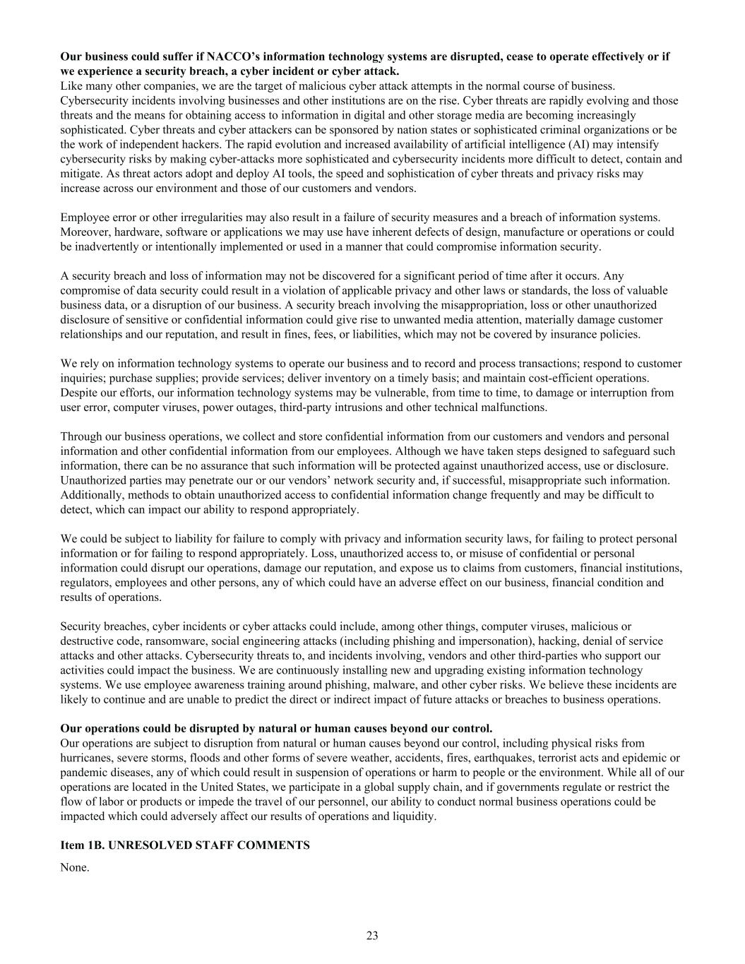 Our business could suffer if NACCO’s information technology systems are disrupted, cease to operate effectively or if we experience a security breach, a cyber incident or cyber attack. Like many other companies, we are the target of malicious cyber attack attempts in the normal course of business. Cybersecurity incidents involving businesses and other institutions are on the rise. Cyber threats are rapidly evolving and those threats and the means for obtaining access to information in digital and other storage media are becoming increasingly sophisticated. Cyber threats and cyber attackers can be sponsored by nation states or sophisticated criminal organizations or be the work of independent hackers. The rapid evolution and increased availability of artificial intelligence (AI) may intensify cybersecurity risks by making cyber-attacks more sophisticated and cybersecurity incidents more difficult to detect, contain and mitigate. As threat actors adopt and deploy AI tools, the speed and sophistication of cyber threats and privacy risks may increase across our environment and those of our customers and vendors. Employee error or other irregularities may also result in a failure of security measures and a breach of information systems. Moreover, hardware, software or applications we may use have inherent defects of design, manufacture or operations or could be inadvertently or intentionally implemented or used in a manner that could compromise information security. A security breach and loss of information may not be discovered for a significant period of time after it occurs. Any compromise of data security could result in a violation of applicable privacy and other laws or standards, the loss of valuable business data, or a disruption of our business. A security breach involving the misappropriation, loss or other unauthorized disclosure of sensitive or confidential information could give rise to unwanted media attention, materially damage customer relationships and our reputation, and result in fines, fees, or liabilities, which may not be covered by insurance policies. We rely on information technology systems to operate our business and to record and process transactions; respond to customer inquiries; purchase supplies; provide services; deliver inventory on a timely basis; and maintain cost-efficient operations. Despite our efforts, our information technology systems may be vulnerable, from time to time, to damage or interruption from user error, computer viruses, power outages, third-party intrusions and other technical malfunctions. Through our business operations, we collect and store confidential information from our customers and vendors and personal information and other confidential information from our employees. Although we have taken steps designed to safeguard such information, there can be no assurance that such information will be protected against unauthorized access, use or disclosure. Unauthorized parties may penetrate our or our vendors’ network security and, if successful, misappropriate such information. Additionally, methods to obtain unauthorized access to confidential information change frequently and may be difficult to detect, which can impact our ability to respond appropriately. We could be subject to liability for failure to comply with privacy and information security laws, for failing to protect personal information or for failing to respond appropriately. Loss, unauthorized access to, or misuse of confidential or personal information could disrupt our operations, damage our reputation, and expose us to claims from customers, financial institutions, regulators, employees and other persons, any of which could have an adverse effect on our business, financial condition and results of operations. Security breaches, cyber incidents or cyber attacks could include, among other things, computer viruses, malicious or destructive code, ransomware, social engineering attacks (including phishing and impersonation), hacking, denial of service attacks and other attacks. Cybersecurity threats to, and incidents involving, vendors and other third-parties who support our activities could impact the business. We are continuously installing new and upgrading existing information technology systems. We use employee awareness training around phishing, malware, and other cyber risks. We believe these incidents are likely to continue and are unable to predict the direct or indirect impact of future attacks or breaches to business operations. Our operations could be disrupted by natural or human causes beyond our control. Our operations are subject to disruption from natural or human causes beyond our control, including physical risks from hurricanes, severe storms, floods and other forms of severe weather, accidents, fires, earthquakes, terrorist acts and epidemic or pandemic diseases, any of which could result in suspension of operations or harm to people or the environment. While all of our operations are located in the United States, we participate in a global supply chain, and if governments regulate or restrict the flow of labor or products or impede the travel of our personnel, our ability to conduct normal business operations could be impacted which could adversely affect our results of operations and liquidity. Item 1B. UNRESOLVED STAFF COMMENTS None. 23