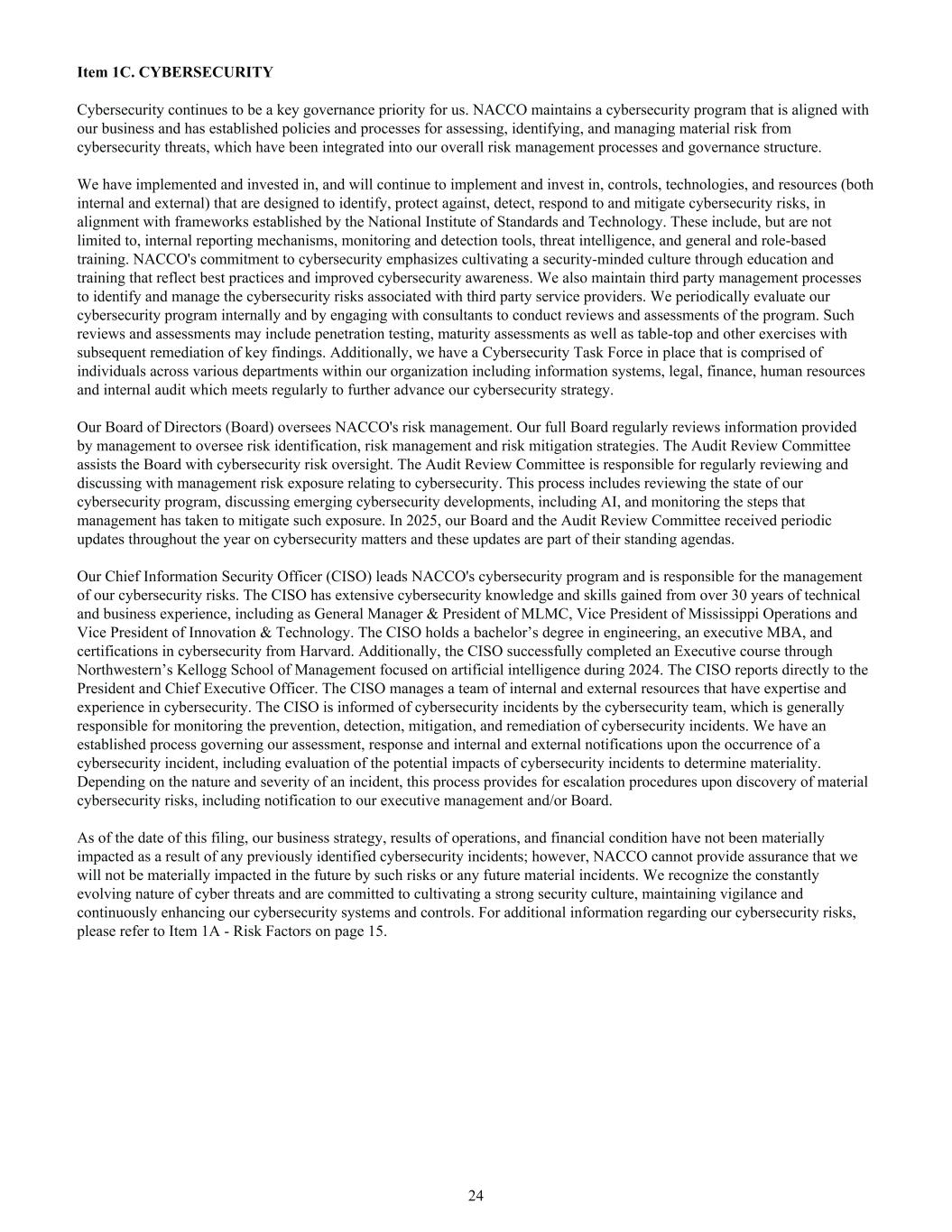Item 1C. CYBERSECURITY Cybersecurity continues to be a key governance priority for us. NACCO maintains a cybersecurity program that is aligned with our business and has established policies and processes for assessing, identifying, and managing material risk from cybersecurity threats, which have been integrated into our overall risk management processes and governance structure. We have implemented and invested in, and will continue to implement and invest in, controls, technologies, and resources (both internal and external) that are designed to identify, protect against, detect, respond to and mitigate cybersecurity risks, in alignment with frameworks established by the National Institute of Standards and Technology. These include, but are not limited to, internal reporting mechanisms, monitoring and detection tools, threat intelligence, and general and role-based training. NACCO's commitment to cybersecurity emphasizes cultivating a security-minded culture through education and training that reflect best practices and improved cybersecurity awareness. We also maintain third party management processes to identify and manage the cybersecurity risks associated with third party service providers. We periodically evaluate our cybersecurity program internally and by engaging with consultants to conduct reviews and assessments of the program. Such reviews and assessments may include penetration testing, maturity assessments as well as table-top and other exercises with subsequent remediation of key findings. Additionally, we have a Cybersecurity Task Force in place that is comprised of individuals across various departments within our organization including information systems, legal, finance, human resources and internal audit which meets regularly to further advance our cybersecurity strategy. Our Board of Directors (Board) oversees NACCO's risk management. Our full Board regularly reviews information provided by management to oversee risk identification, risk management and risk mitigation strategies. The Audit Review Committee assists the Board with cybersecurity risk oversight. The Audit Review Committee is responsible for regularly reviewing and discussing with management risk exposure relating to cybersecurity. This process includes reviewing the state of our cybersecurity program, discussing emerging cybersecurity developments, including AI, and monitoring the steps that management has taken to mitigate such exposure. In 2025, our Board and the Audit Review Committee received periodic updates throughout the year on cybersecurity matters and these updates are part of their standing agendas. Our Chief Information Security Officer (CISO) leads NACCO's cybersecurity program and is responsible for the management of our cybersecurity risks. The CISO has extensive cybersecurity knowledge and skills gained from over 30 years of technical and business experience, including as General Manager & President of MLMC, Vice President of Mississippi Operations and Vice President of Innovation & Technology. The CISO holds a bachelor’s degree in engineering, an executive MBA, and certifications in cybersecurity from Harvard. Additionally, the CISO successfully completed an Executive course through Northwestern’s Kellogg School of Management focused on artificial intelligence during 2024. The CISO reports directly to the President and Chief Executive Officer. The CISO manages a team of internal and external resources that have expertise and experience in cybersecurity. The CISO is informed of cybersecurity incidents by the cybersecurity team, which is generally responsible for monitoring the prevention, detection, mitigation, and remediation of cybersecurity incidents. We have an established process governing our assessment, response and internal and external notifications upon the occurrence of a cybersecurity incident, including evaluation of the potential impacts of cybersecurity incidents to determine materiality. Depending on the nature and severity of an incident, this process provides for escalation procedures upon discovery of material cybersecurity risks, including notification to our executive management and/or Board. As of the date of this filing, our business strategy, results of operations, and financial condition have not been materially impacted as a result of any previously identified cybersecurity incidents; however, NACCO cannot provide assurance that we will not be materially impacted in the future by such risks or any future material incidents. We recognize the constantly evolving nature of cyber threats and are committed to cultivating a strong security culture, maintaining vigilance and continuously enhancing our cybersecurity systems and controls. For additional information regarding our cybersecurity risks, please refer to Item 1A - Risk Factors on page 15. 24
