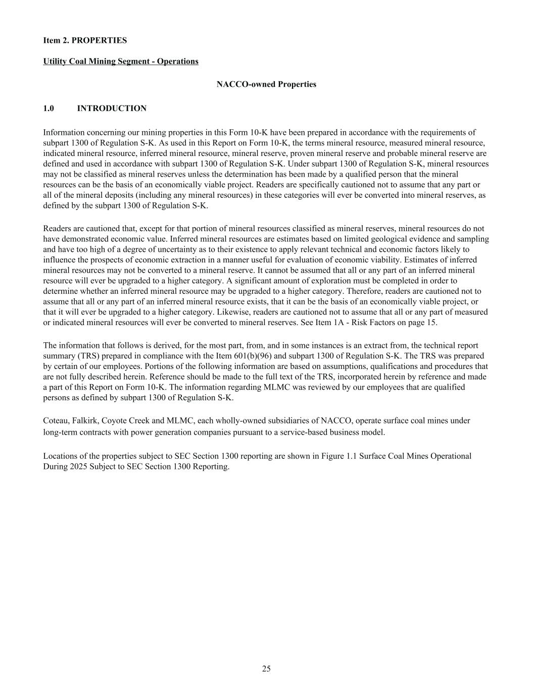2026. As of October 1, 2026, SWEPCO is obligated to acquire all of the capital stock of Sabine and complete the remaining mine reclamation. At Coteau, Coyote Creek and Falkirk, we are paid a management fee per ton of coal or heating unit (MMBtu) delivered. Each contract specifies the indices and mechanics by which fees change over time, generally in line with broad measures of U.S. inflation. Our customers are responsible for funding all mine operating costs, including final mine reclamation, and directly or indirectly providing all of the capital required to build and operate the mine. This contract structure eliminates exposure to spot coal market price fluctuations while providing predictable income and cash flow with minimal capital investment. Other than at Coyote Creek, debt financing provided by or supported by the customers is without recourse to us. See Note 16 to the Consolidated Financial Statements in this Form 10-K for further discussion of Coyote Creek's guarantees. Coteau, Coyote Creek, Falkirk and Sabine each meet the definition of a variable interest entity (VIE). In each case, NACCO is not the primary beneficiary of the VIE as it does not exercise financial control; therefore, we do not consolidate the results of these operations within our financial statements. Instead, these contracts are accounted for as equity method investments. We regularly evaluate if there are reconsideration events which could change our conclusion as to whether these entities meet the definition of a VIE and the determination of the primary beneficiary. The income before income taxes associated with these VIEs is reported as Earnings of unconsolidated operations on the Consolidated Statements of Operations and our investment is reported on the line Investments in unconsolidated subsidiaries in the Consolidated Balance Sheets. The mines that meet the definition of a VIE are referred to collectively as the Unconsolidated Subsidiaries. For tax purposes, the Unconsolidated Subsidiaries are included within our consolidated U.S. tax return; therefore, the Income tax (benefit) provision line on the Consolidated Statements of Operations includes income taxes related to these entities. See Note 16 to the Consolidated Financial Statements in this Form 10-K for further information on the Unconsolidated Subsidiaries. We perform contemporaneous reclamation activities at each mine in the normal course of operations. Under all of the Unconsolidated Subsidiaries’ contracts, our customer has the obligation to fund final mine reclamation activities. Under certain contracts, the Unconsolidated Subsidiary holds the mine permit and is therefore responsible for final mine reclamation activities. To the extent the Unconsolidated Subsidiary performs such final reclamation, it is compensated for providing those services in addition to receiving reimbursement from customers for costs incurred. See Item 2. Properties on page 25 in this Form 10-K for discussion of the Utility Coal Mining segment's mineral resources and mineral reserves. Contract Mining Segment The Contract Mining segment provides value-added contract mining and other services for producers of industrial minerals and products. The segment is a platform for our growth and diversification of mining activities outside of the thermal coal industry. Contract Mining provides contract mining services for independently owned mines and quarries, creating value for our customers by performing the mining aspects of our customers’ operations. This allows customers to focus on their areas of expertise: materials handling and processing, product sales and distribution. As of December 31, 2025, the Contract Mining segment operates at quarries in Florida, Arkansas and Nebraska and is expected to begin operations at a quarry in Arizona during the first half of 2026. Beginning in 2026, the Contract Mining segment will also provide dragline services as part of a U.S. Army Corps of Engineers construction project in Palm Beach County, Florida. In addition, Contract Mining's subsidiary, Sawtooth Mining (Sawtooth), is the exclusive provider of comprehensive mining services for the Thacker Pass lithium project in Humboldt County, Nevada. Thacker Pass is owned by a joint venture between Lithium Americas Corp. (TSX:LAC) (NYSE: LAC) and General Motors Holdings LLC. The U.S. Department of Energy holds warrants to purchase five percent non-voting, non-transferable equity in this joint venture. Thacker Pass is targeting initial lithium production in late 2027. The contract requires reimbursement for costs of mining, capital expenditures and mine closure. Sawtooth will recognize a contractually agreed upon production fee once the mine is operating. In addition to providing comprehensive mining services, Sawtooth is currently assisting with certain construction services and will transport clay tailings once lithium production commences. See Item 2. Properties on page 38 in this Form 10-K for a list of the Contract Mining segment's locations and customers. Minerals and Royalties Segment The Minerals and Royalties segment derives income primarily by leasing our royalty and mineral interests to third-party exploration and production companies, and, to a lesser extent, other mining companies, granting them the rights to explore, develop, mine, produce, market and sell gas, oil, and coal in exchange for royalty payments based on the lessees' sales of those minerals. 4