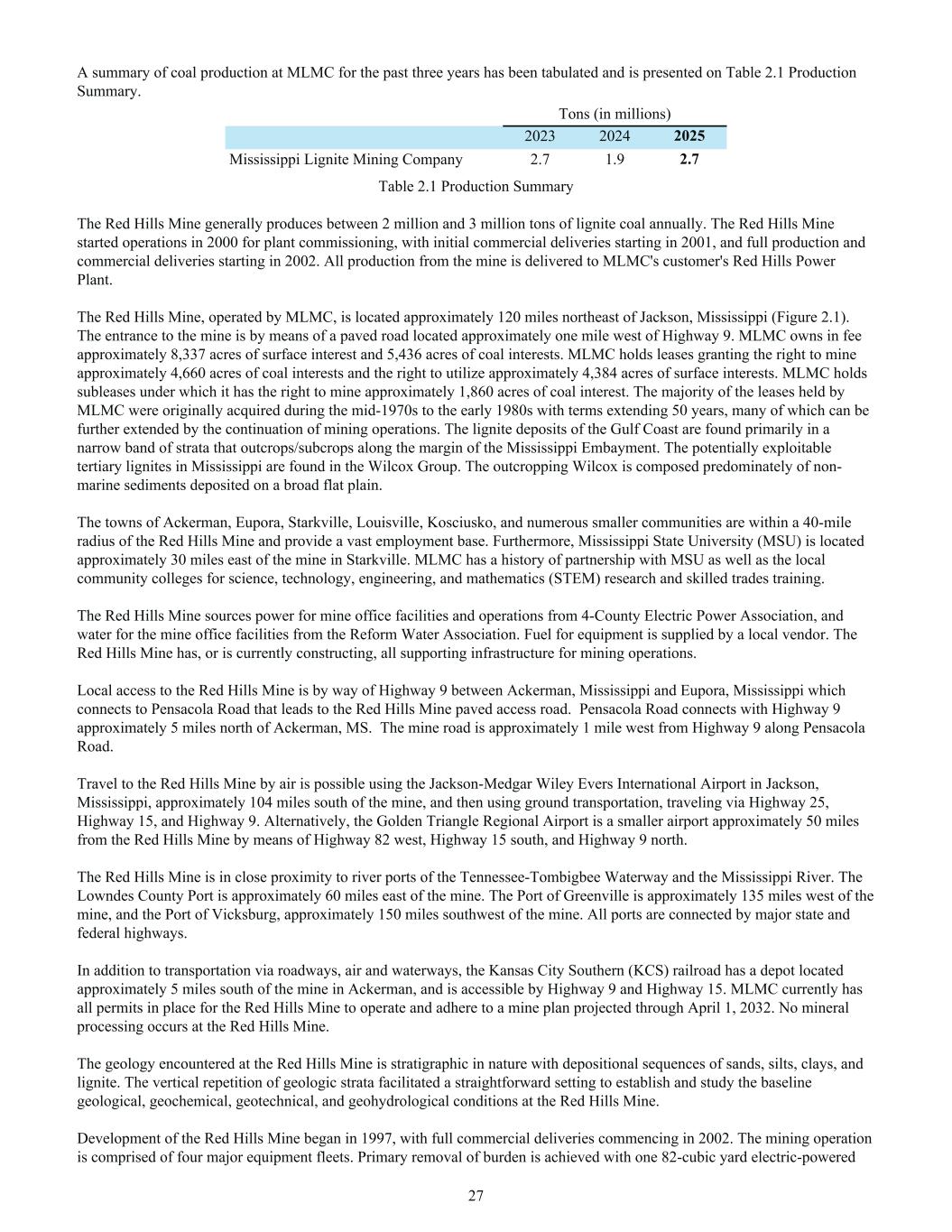 A summary of coal production at MLMC for the past three years has been tabulated and is presented on Table 2.1 Production Summary. Tons (in millions) 2023 2024 2025 Mississippi Lignite Mining Company 2.7 1.9 2.7 Table 2.1 Production Summary The Red Hills Mine generally produces between 2 million and 3 million tons of lignite coal annually. The Red Hills Mine started operations in 2000 for plant commissioning, with initial commercial deliveries starting in 2001, and full production and commercial deliveries starting in 2002. All production from the mine is delivered to MLMC's customer's Red Hills Power Plant. The Red Hills Mine, operated by MLMC, is located approximately 120 miles northeast of Jackson, Mississippi (Figure 2.1). The entrance to the mine is by means of a paved road located approximately one mile west of Highway 9. MLMC owns in fee approximately 8,337 acres of surface interest and 5,436 acres of coal interests. MLMC holds leases granting the right to mine approximately 4,660 acres of coal interests and the right to utilize approximately 4,384 acres of surface interests. MLMC holds subleases under which it has the right to mine approximately 1,860 acres of coal interest. The majority of the leases held by MLMC were originally acquired during the mid-1970s to the early 1980s with terms extending 50 years, many of which can be further extended by the continuation of mining operations. The lignite deposits of the Gulf Coast are found primarily in a narrow band of strata that outcrops/subcrops along the margin of the Mississippi Embayment. The potentially exploitable tertiary lignites in Mississippi are found in the Wilcox Group. The outcropping Wilcox is composed predominately of non- marine sediments deposited on a broad flat plain. The towns of Ackerman, Eupora, Starkville, Louisville, Kosciusko, and numerous smaller communities are within a 40-mile radius of the Red Hills Mine and provide a vast employment base. Furthermore, Mississippi State University (MSU) is located approximately 30 miles east of the mine in Starkville. MLMC has a history of partnership with MSU as well as the local community colleges for science, technology, engineering, and mathematics (STEM) research and skilled trades training. The Red Hills Mine sources power for mine office facilities and operations from 4-County Electric Power Association, and water for the mine office facilities from the Reform Water Association. Fuel for equipment is supplied by a local vendor. The Red Hills Mine has, or is currently constructing, all supporting infrastructure for mining operations. Local access to the Red Hills Mine is by way of Highway 9 between Ackerman, Mississippi and Eupora, Mississippi which connects to Pensacola Road that leads to the Red Hills Mine paved access road. Pensacola Road connects with Highway 9 approximately 5 miles north of Ackerman, MS. The mine road is approximately 1 mile west from Highway 9 along Pensacola Road. Travel to the Red Hills Mine by air is possible using the Jackson-Medgar Wiley Evers International Airport in Jackson, Mississippi, approximately 104 miles south of the mine, and then using ground transportation, traveling via Highway 25, Highway 15, and Highway 9. Alternatively, the Golden Triangle Regional Airport is a smaller airport approximately 50 miles from the Red Hills Mine by means of Highway 82 west, Highway 15 south, and Highway 9 north. The Red Hills Mine is in close proximity to river ports of the Tennessee-Tombigbee Waterway and the Mississippi River. The Lowndes County Port is approximately 60 miles east of the mine. The Port of Greenville is approximately 135 miles west of the mine, and the Port of Vicksburg, approximately 150 miles southwest of the mine. All ports are connected by major state and federal highways. In addition to transportation via roadways, air and waterways, the Kansas City Southern (KCS) railroad has a depot located approximately 5 miles south of the mine in Ackerman, and is accessible by Highway 9 and Highway 15. MLMC currently has all permits in place for the Red Hills Mine to operate and adhere to a mine plan projected through April 1, 2032. No mineral processing occurs at the Red Hills Mine. The geology encountered at the Red Hills Mine is stratigraphic in nature with depositional sequences of sands, silts, clays, and lignite. The vertical repetition of geologic strata facilitated a straightforward setting to establish and study the baseline geological, geochemical, geotechnical, and geohydrological conditions at the Red Hills Mine. Development of the Red Hills Mine began in 1997, with full commercial deliveries commencing in 2002. The mining operation is comprised of four major equipment fleets. Primary removal of burden is achieved with one 82-cubic yard electric-powered 27