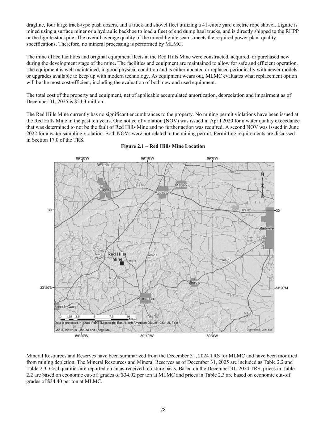 dragline, four large track-type push dozers, and a truck and shovel fleet utilizing a 41-cubic yard electric rope shovel. Lignite is mined using a surface miner or a hydraulic backhoe to load a fleet of end dump haul trucks, and is directly shipped to the RHPP or the lignite stockpile. The overall average quality of the mined lignite seams meets the required power plant quality specifications. Therefore, no mineral processing is performed by MLMC. The mine office facilities and original equipment fleets at the Red Hills Mine were constructed, acquired, or purchased new during the development stage of the mine. The facilities and equipment are maintained to allow for safe and efficient operation. The equipment is well maintained, in good physical condition and is either updated or replaced periodically with newer models or upgrades available to keep up with modern technology. As equipment wears out, MLMC evaluates what replacement option will be the most cost-efficient, including the evaluation of both new and used equipment. The total cost of the property and equipment, net of applicable accumulated amortization, depreciation and impairment as of December 31, 2025 is $54.4 million. The Red Hills Mine currently has no significant encumbrances to the property. No mining permit violations have been issued at the Red Hills Mine in the past ten years. One notice of violation (NOV) was issued in April 2020 for a water quality exceedance that was determined to not be the fault of Red Hills Mine and no further action was required. A second NOV was issued in June 2022 for a water sampling violation. Both NOVs were not related to the mining permit. Permitting requirements are discussed in Section 17.0 of the TRS. Figure 2.1 – Red Hills Mine Location Mineral Resources and Reserves have been summarized from the December 31, 2024 TRS for MLMC and have been modified from mining depletion. The Mineral Resources and Mineral Reserves as of December 31, 2025 are included as Table 2.2 and Table 2.3. Coal qualities are reported on an as-received moisture basis. Based on the December 31, 2024 TRS, prices in Table 2.2 are based on economic cut-off grades of $34.02 per ton at MLMC and prices in Table 2.3 are based on economic cut-off grades of $34.40 per ton at MLMC. 28