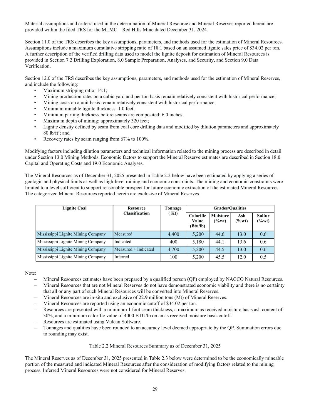 Material assumptions and criteria used in the determination of Mineral Resource and Mineral Reserves reported herein are provided within the filed TRS for the MLMC – Red Hills Mine dated December 31, 2024. Section 11.0 of the TRS describes the key assumptions, parameters, and methods used for the estimation of Mineral Resources. Assumptions include a maximum cumulative stripping ratio of 18:1 based on an assumed lignite sales price of $34.02 per ton. A further description of the verified drilling data used to model the lignite deposit for estimation of Mineral Resources is provided in Section 7.2 Drilling Exploration, 8.0 Sample Preparation, Analyses, and Security, and Section 9.0 Data Verification. Section 12.0 of the TRS describes the key assumptions, parameters, and methods used for the estimation of Mineral Reserves, and include the following: • Maximum stripping ratio: 14:1; • Mining production rates on a cubic yard and per ton basis remain relatively consistent with historical performance; • Mining costs on a unit basis remain relatively consistent with historical performance; • Minimum minable lignite thickness: 1.0 feet; • Minimum parting thickness before seams are composited: 6.0 inches; • Maximum depth of mining: approximately 320 feet; • Lignite density defined by seam from coal core drilling data and modified by dilution parameters and approximately 80 lb/ft³; and • Recovery rates by seam ranging from 67% to 100%. Modifying factors including dilution parameters and technical information related to the mining process are described in detail under Section 13.0 Mining Methods. Economic factors to support the Mineral Reserve estimates are described in Section 18.0 Capital and Operating Costs and 19.0 Economic Analyses. The Mineral Resources as of December 31, 2025 presented in Table 2.2 below have been estimated by applying a series of geologic and physical limits as well as high-level mining and economic constraints. The mining and economic constraints were limited to a level sufficient to support reasonable prospect for future economic extraction of the estimated Mineral Resources. The categorized Mineral Resources reported herein are exclusive of Mineral Reserves. Lignite Coal Resource Classification Tonnage ( Kt) Grades/Qualities Calorific Value (Btu/lb) Moisture (%wt) Ash (%wt) Sulfur (%wt) Mississippi Lignite Mining Company Measured 4,400 5,200 44.6 13.0 0.6 Mississippi Lignite Mining Company Indicated 400 5,180 44.1 13.6 0.6 Mississippi Lignite Mining Company Measured + Indicated 4,700 5,200 44.5 13.0 0.6 Mississippi Lignite Mining Company Inferred 100 5,200 45.5 12.0 0.5 Note: – Mineral Resources estimates have been prepared by a qualified person (QP) employed by NACCO Natural Resources. – Mineral Resources that are not Mineral Reserves do not have demonstrated economic viability and there is no certainty that all or any part of such Mineral Resources will be converted into Mineral Reserves. – Mineral Resources are in-situ and exclusive of 22.9 million tons (Mt) of Mineral Reserves. – Mineral Resources are reported using an economic cutoff of $34.02 per ton. – Resources are presented with a minimum 1 foot seam thickness, a maximum as received moisture basis ash content of 30%, and a minimum calorific value of 4000 BTU/lb on an as received moisture basis cutoff. – Resources are estimated using Vulcan Software. – Tonnages and qualities have been rounded to an accuracy level deemed appropriate by the QP. Summation errors due to rounding may exist. Table 2.2 Mineral Resources Summary as of December 31, 2025 The Mineral Reserves as of December 31, 2025 presented in Table 2.3 below were determined to be the economically mineable portion of the measured and indicated Mineral Resources after the consideration of modifying factors related to the mining process. Inferred Mineral Resources were not considered for Mineral Reserves. 29