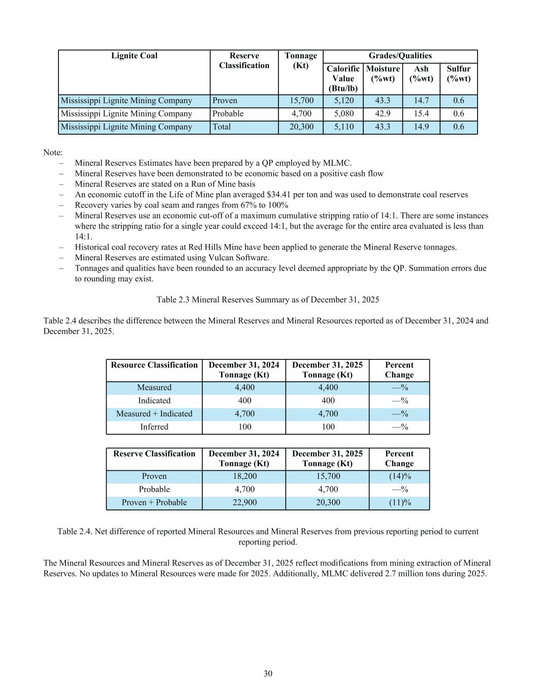 Lignite Coal Reserve Classification Tonnage (Kt) Grades/Qualities Calorific Value (Btu/lb) Moisture (%wt) Ash (%wt) Sulfur (%wt) Mississippi Lignite Mining Company Proven 15,700 5,120 43.3 14.7 0.6 Mississippi Lignite Mining Company Probable 4,700 5,080 42.9 15.4 0.6 Mississippi Lignite Mining Company Total 20,300 5,110 43.3 14.9 0.6 Note: – Mineral Reserves Estimates have been prepared by a QP employed by MLMC. – Mineral Reserves have been demonstrated to be economic based on a positive cash flow – Mineral Reserves are stated on a Run of Mine basis – An economic cutoff in the Life of Mine plan averaged $34.41 per ton and was used to demonstrate coal reserves – Recovery varies by coal seam and ranges from 67% to 100% – Mineral Reserves use an economic cut-off of a maximum cumulative stripping ratio of 14:1. There are some instances where the stripping ratio for a single year could exceed 14:1, but the average for the entire area evaluated is less than 14:1. – Historical coal recovery rates at Red Hills Mine have been applied to generate the Mineral Reserve tonnages. – Mineral Reserves are estimated using Vulcan Software. – Tonnages and qualities have been rounded to an accuracy level deemed appropriate by the QP. Summation errors due to rounding may exist. Table 2.3 Mineral Reserves Summary as of December 31, 2025 Table 2.4 describes the difference between the Mineral Reserves and Mineral Resources reported as of December 31, 2024 and December 31, 2025. Resource Classification December 31, 2024 Tonnage (Kt) December 31, 2025 Tonnage (Kt) Percent Change Measured 4,400 4,400 —% Indicated 400 400 —% Measured + Indicated 4,700 4,700 —% Inferred 100 100 —% Reserve Classification December 31, 2024 Tonnage (Kt) December 31, 2025 Tonnage (Kt) Percent Change Proven 18,200 15,700 (14)% Probable 4,700 4,700 —% Proven + Probable 22,900 20,300 (11)% Table 2.4. Net difference of reported Mineral Resources and Mineral Reserves from previous reporting period to current reporting period. The Mineral Resources and Mineral Reserves as of December 31, 2025 reflect modifications from mining extraction of Mineral Reserves. No updates to Mineral Resources were made for 2025. Additionally, MLMC delivered 2.7 million tons during 2025. 30